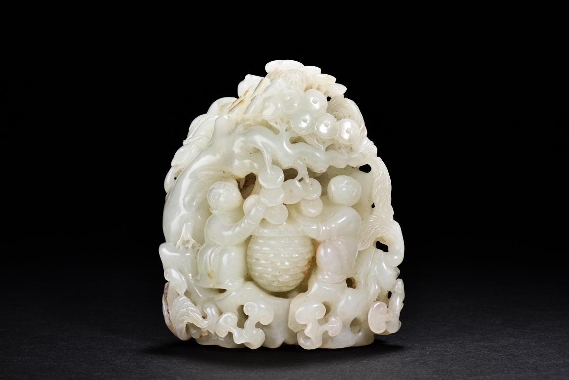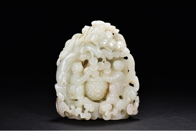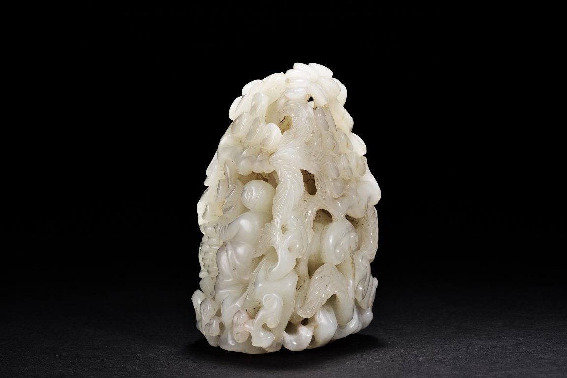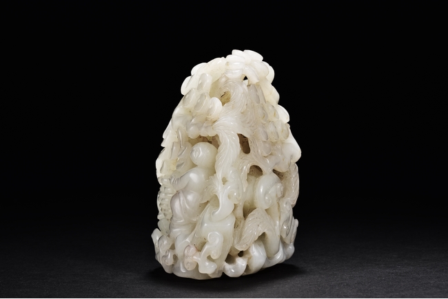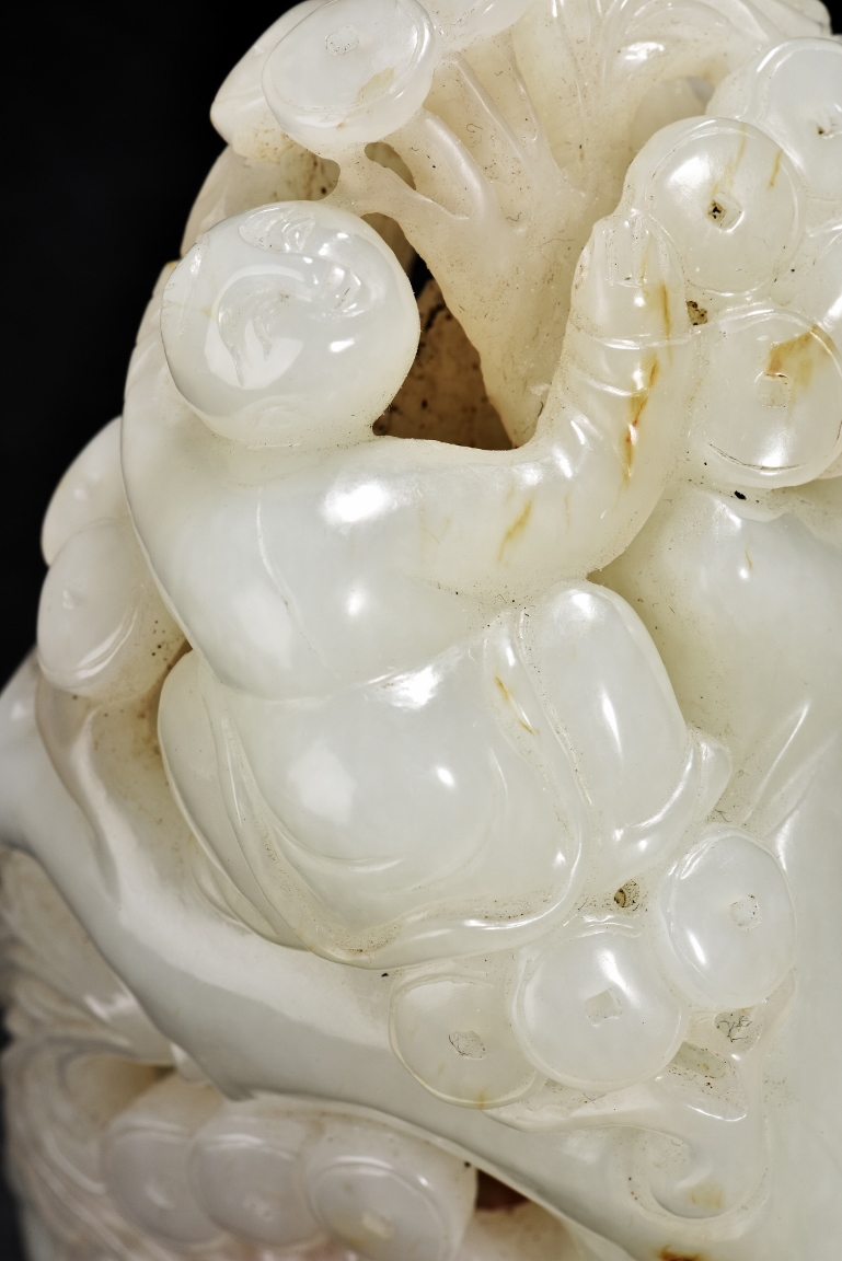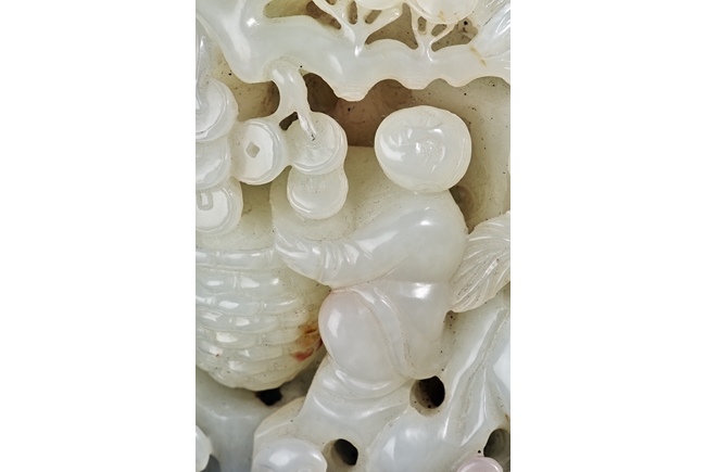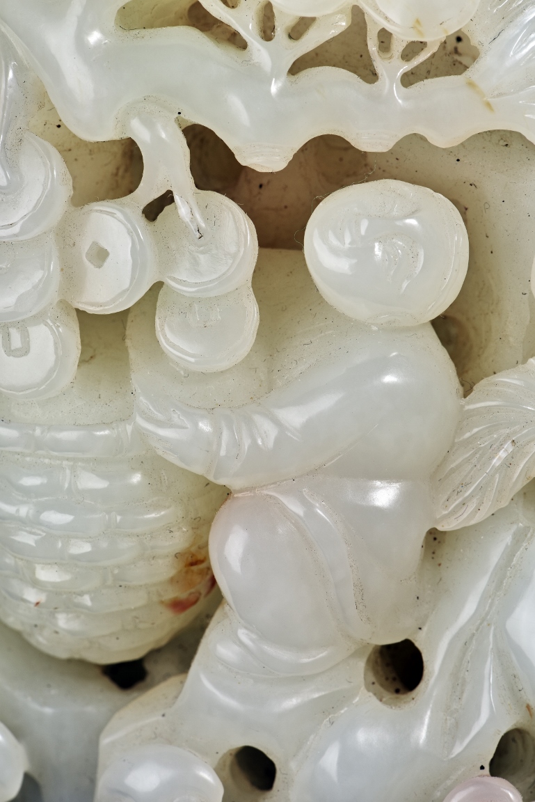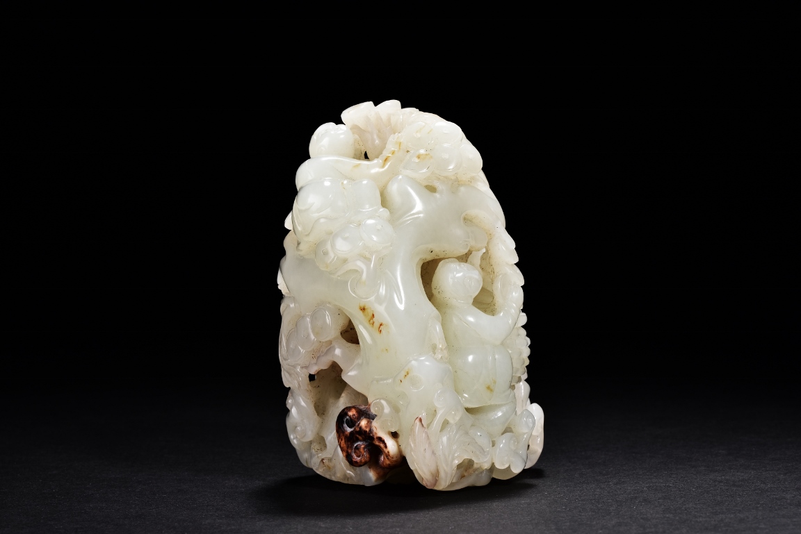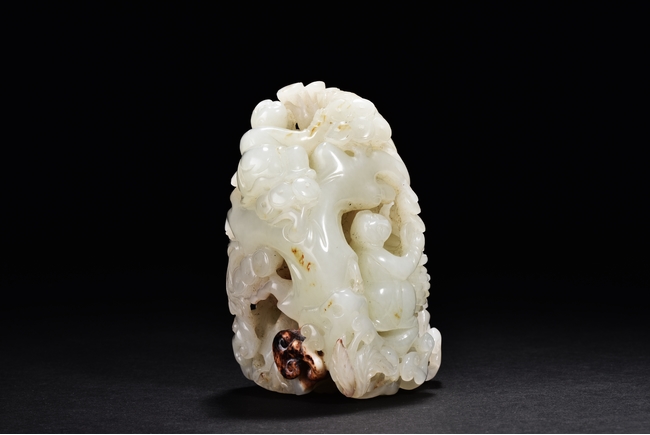 The boulder is carved and pierced with a male and female figure grabing coins from a leafy tree to a basket, with Lingzhi underneath. The stone is of white tone with russet skin. Republic period.