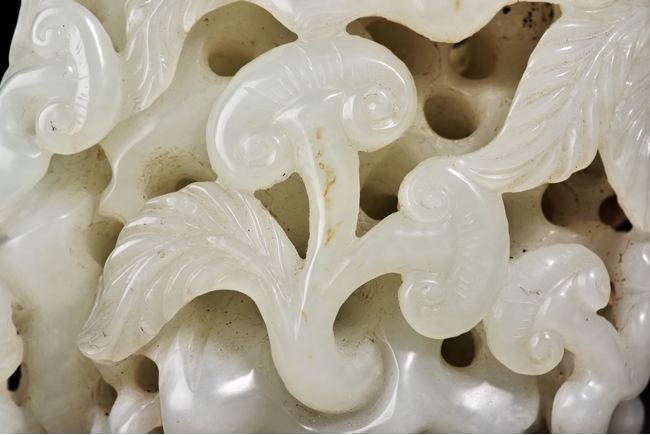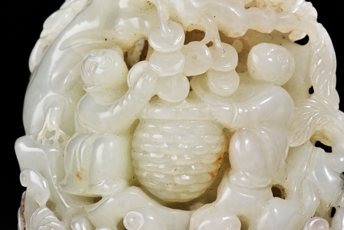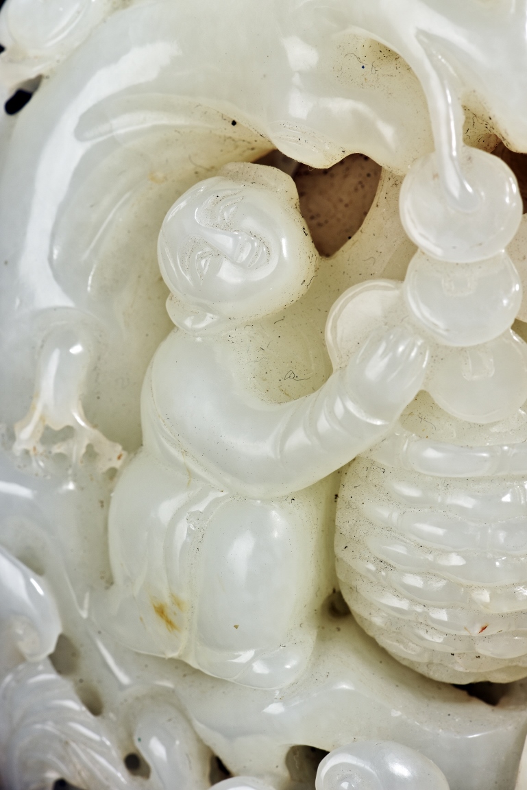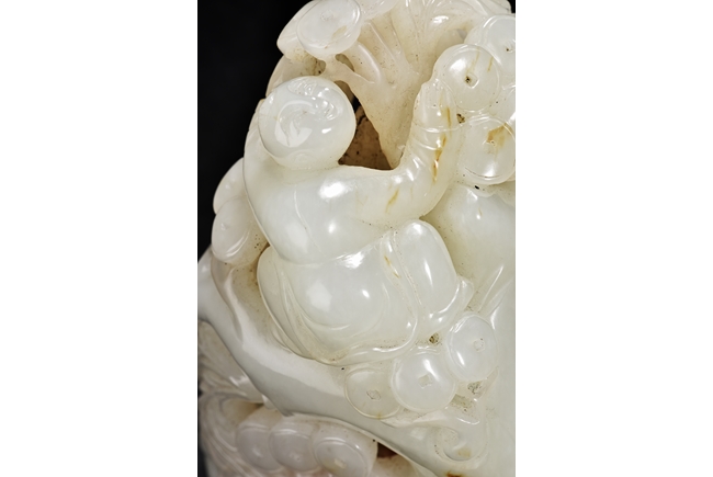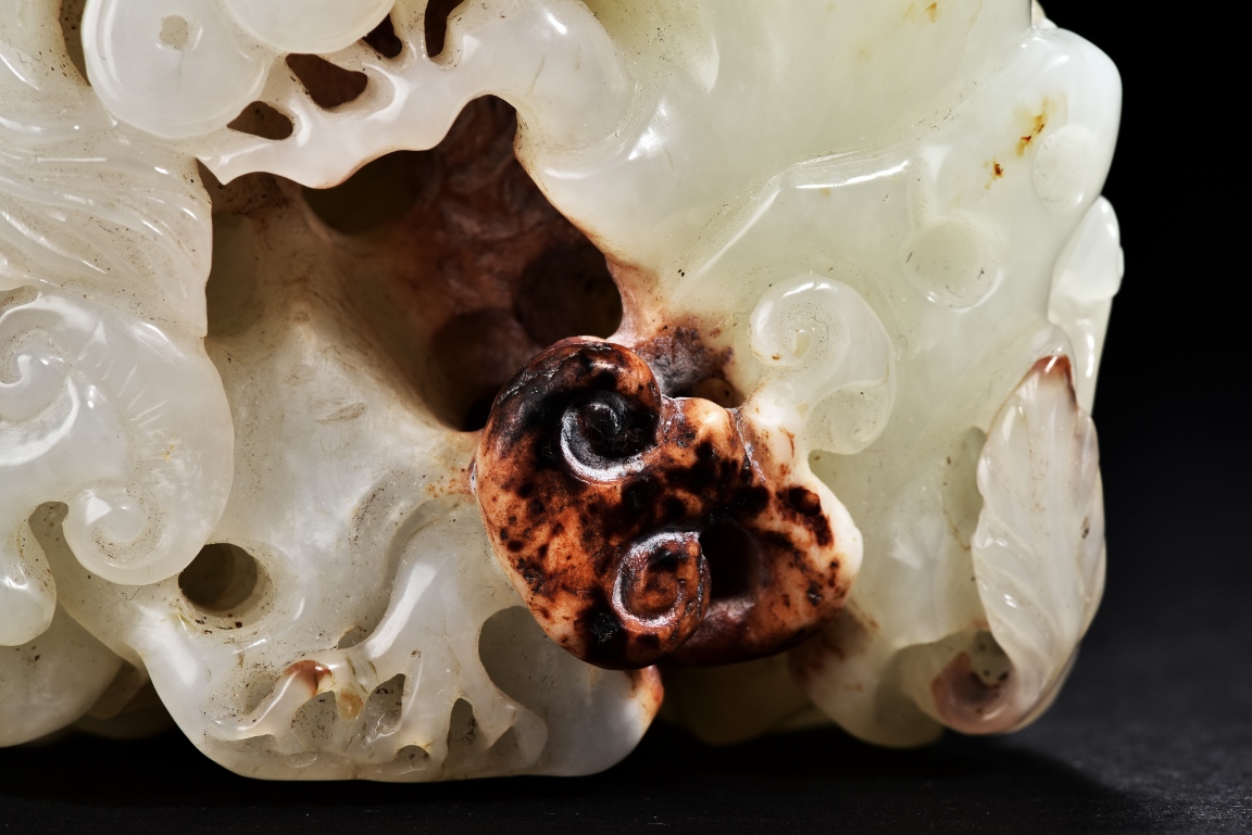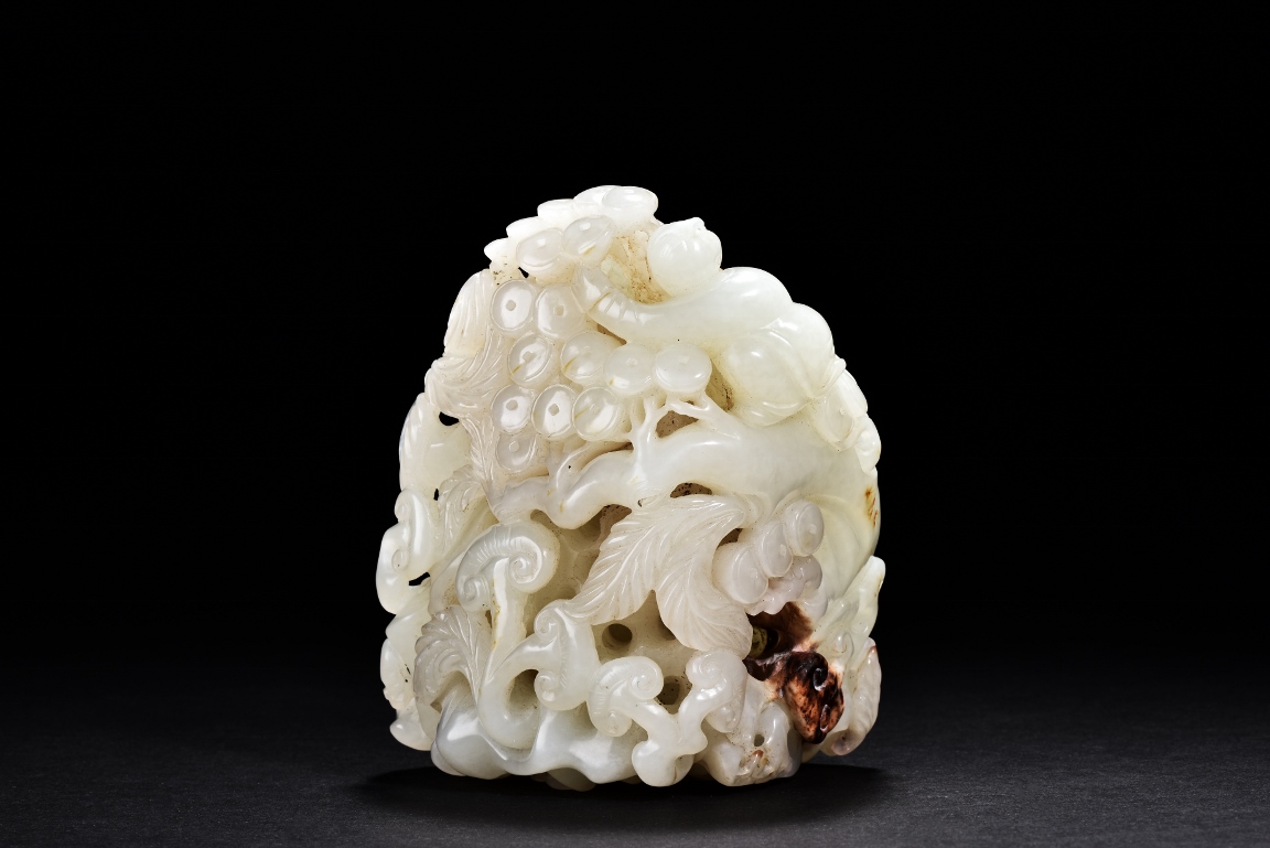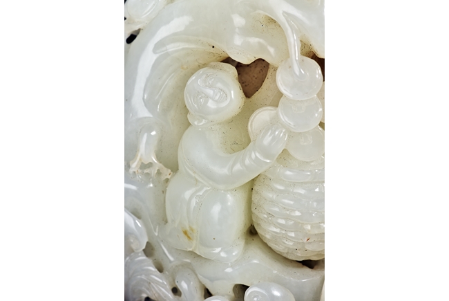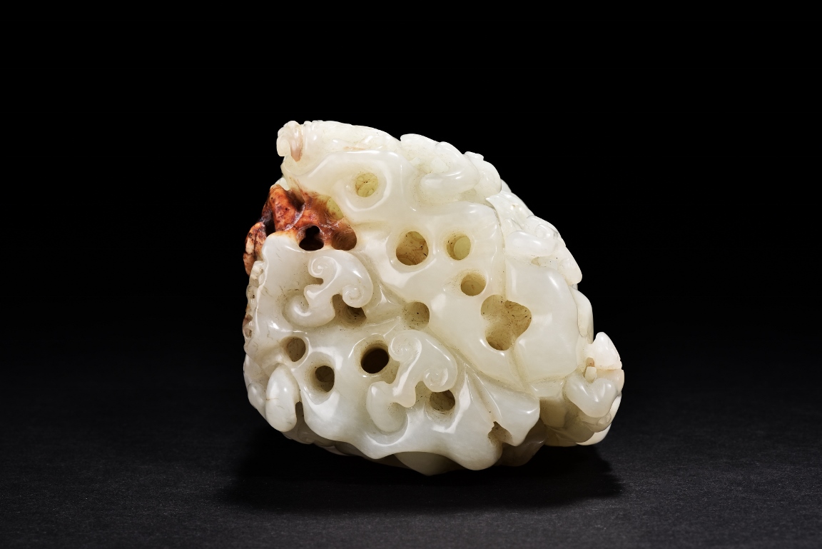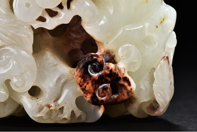 The boulder is carved and pierced with a male and female figure grabing coins from a leafy tree to a basket, with Lingzhi underneath. The stone is of white tone with russet skin. Republic period.