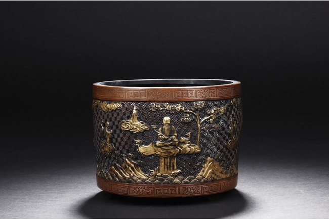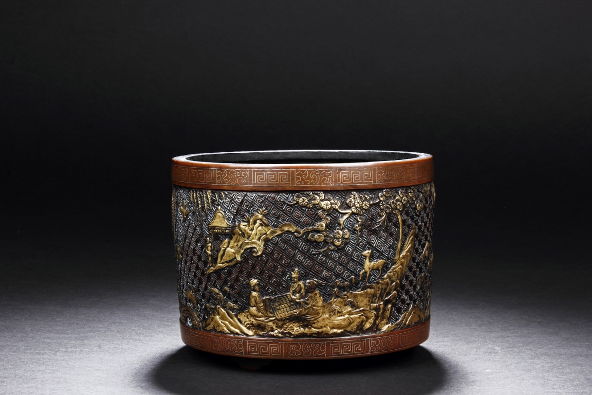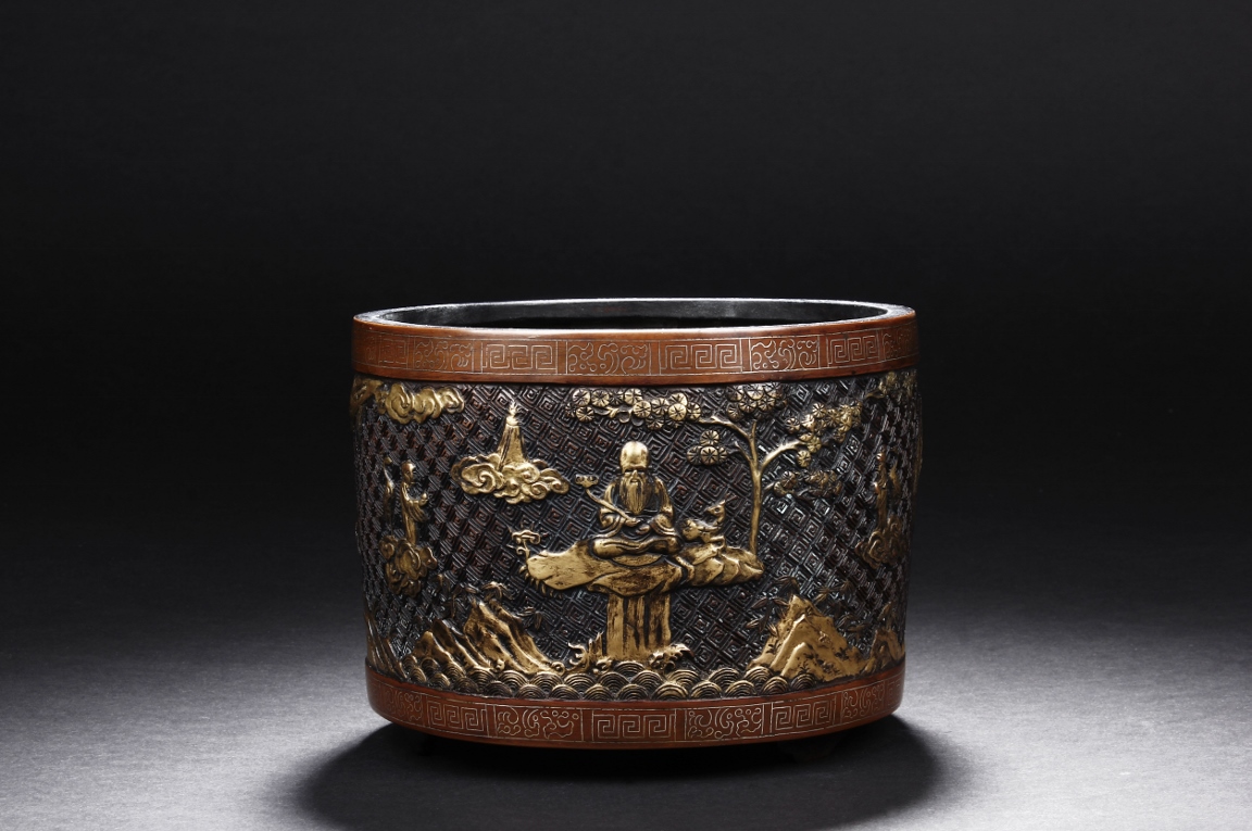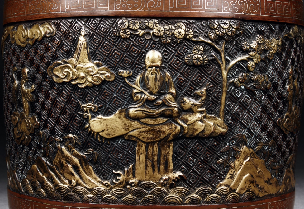 類似拍品請參考蘇富比香港2010年10月第2716號, 成交價560,000港元。此件銅爐造型典雅沉穩,器形簡約而紋飾繁復。器身圓口,壁直下漸收,下承三足。爐身表面上下嵌銀絲回紋一周,中間襯以錦地,紋飾排列繁密齊整,下部波浪曲折翻湧,主題紋飾為“仙山壽老”圖,以浮雕之法而現層次縱深之感,前後波浪交迭錯落有致,富於韻律。爐於銅色之上,鎏金為飾,金氣燦爛,更添華麗精致之感