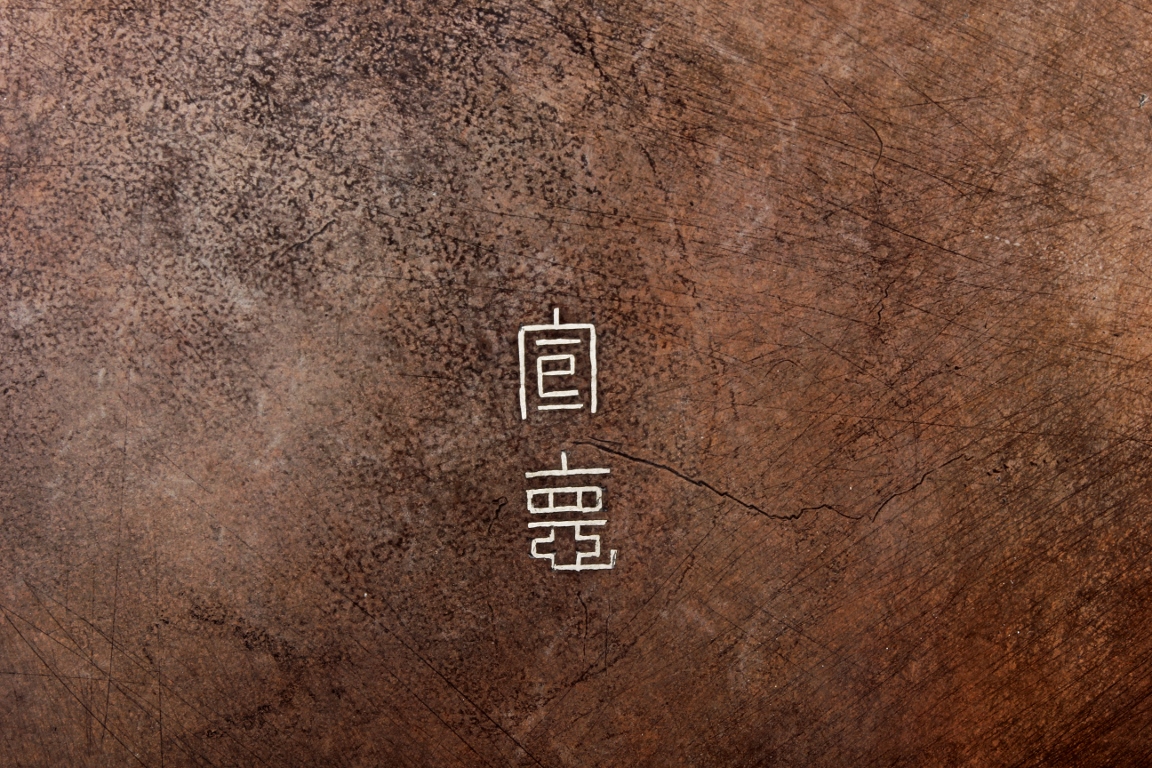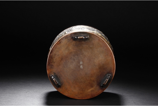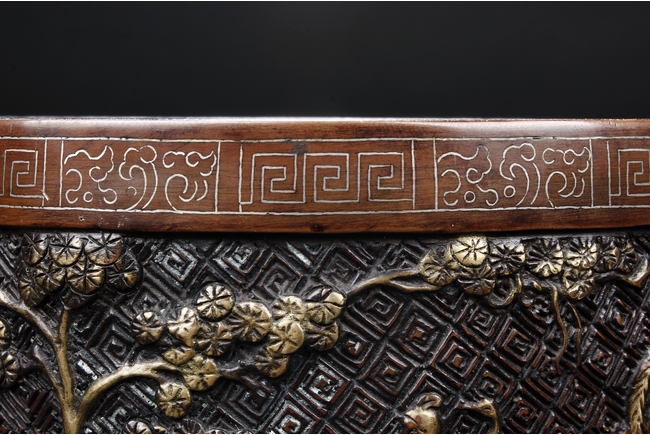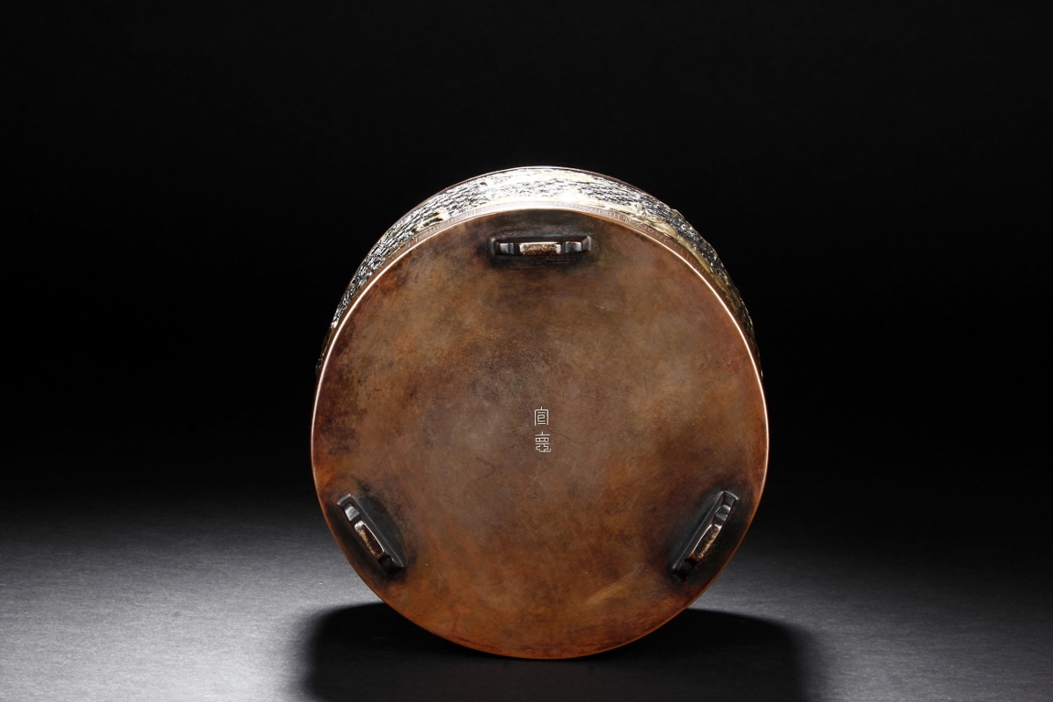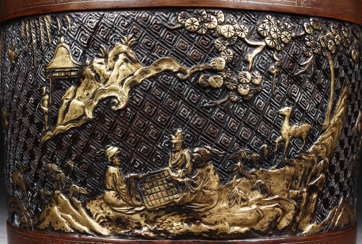 類似拍品請參考蘇富比香港2010年10月第2716號, 成交價560,000港元。此件銅爐造型典雅沉穩,器形簡約而紋飾繁復。器身圓口,壁直下漸收,下承三足。爐身表面上下嵌銀絲回紋一周,中間襯以錦地,紋飾排列繁密齊整,下部波浪曲折翻湧,主題紋飾為“仙山壽老”圖,以浮雕之法而現層次縱深之感,前後波浪交迭錯落有致,富於韻律。爐於銅色之上,鎏金為飾,金氣燦爛,更添華麗精致之感