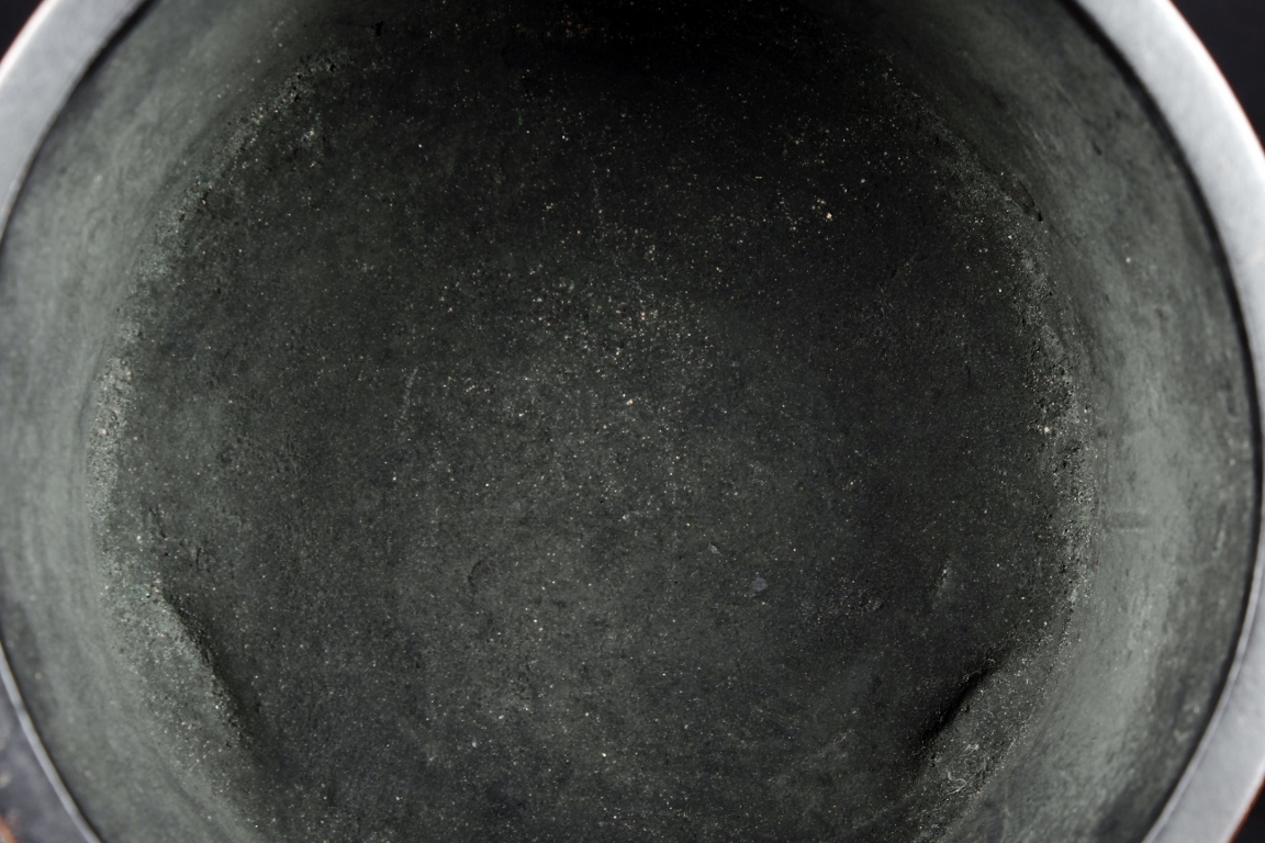 Of cylindrical form raised upon three feet, the body depicted with continous landscape scene and longevity deity raised on foaming waves, all raised on a dense diaper ground, flanked by silver-wire inlaid key-fret patterns and floral bands. The mark 'Xuande' on the bottom also in silver wire. Late Ming Dynasty period.