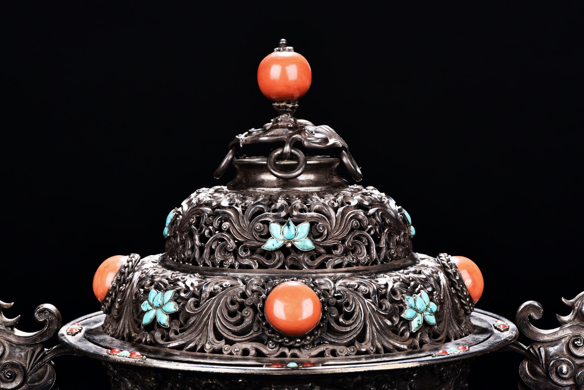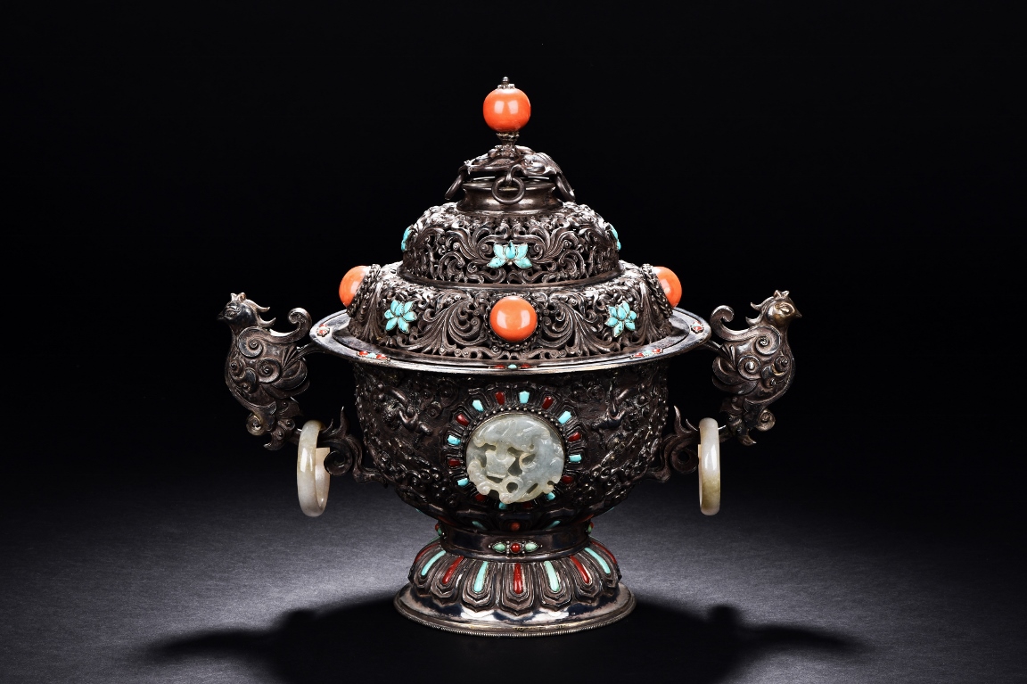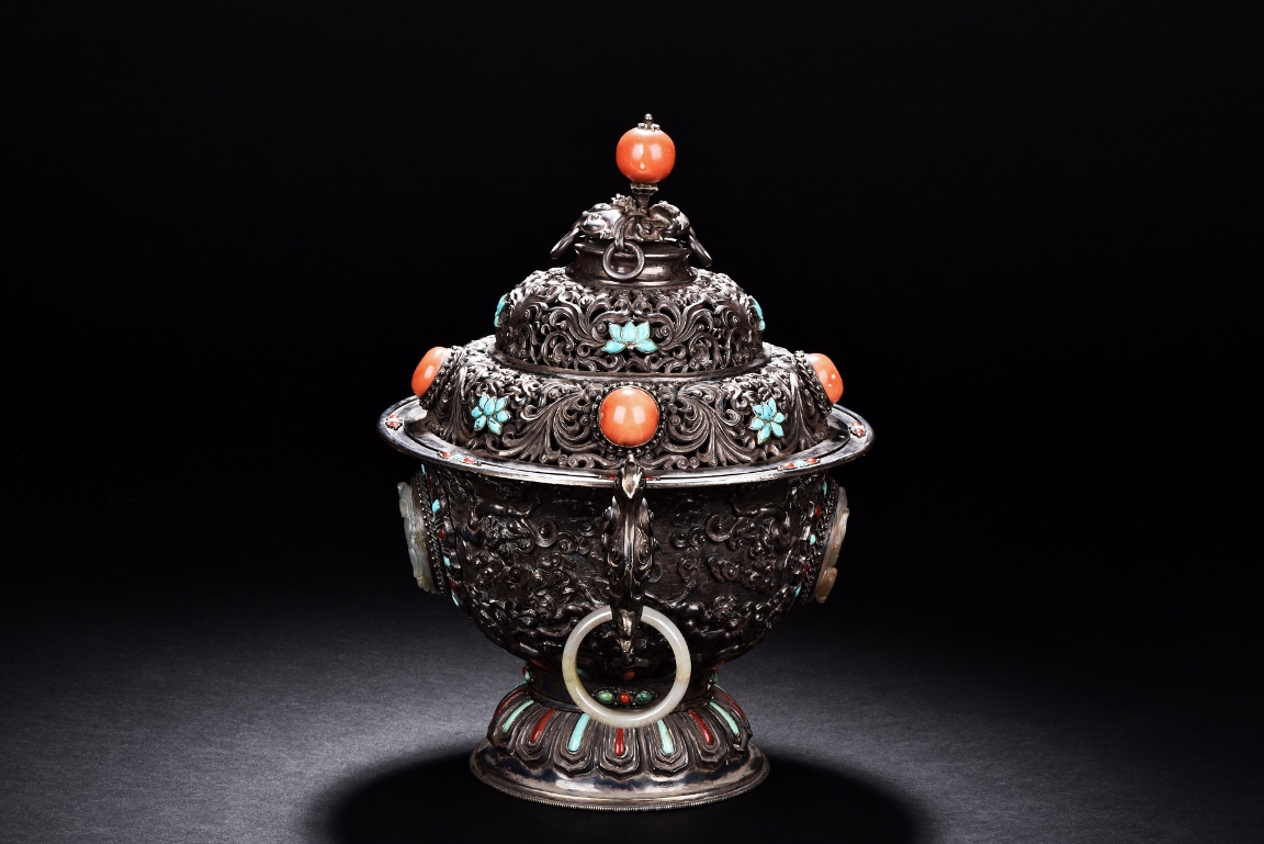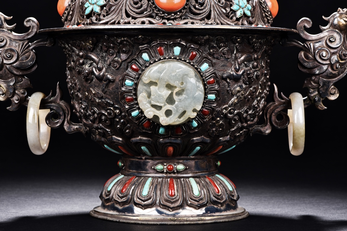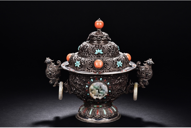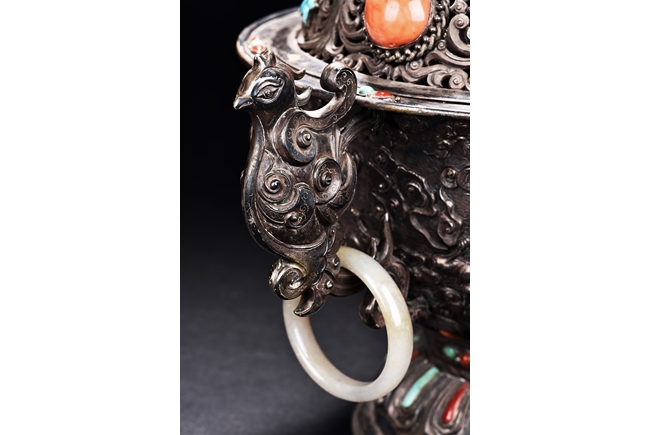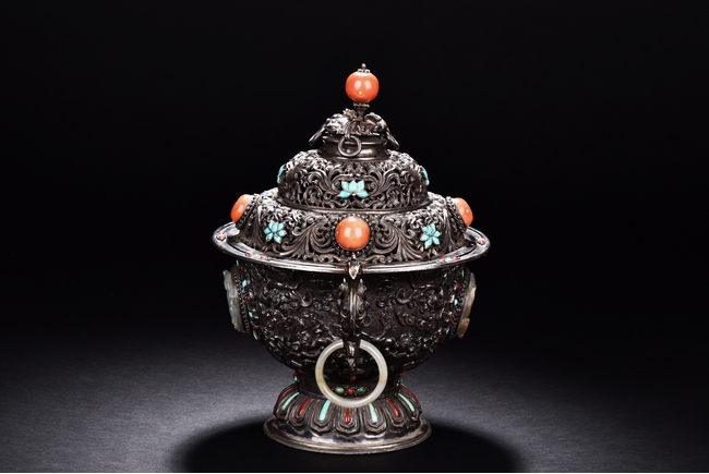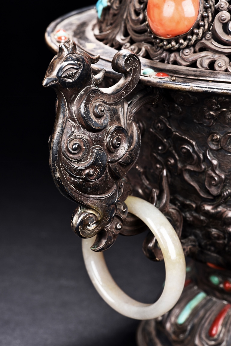 本件貢爐藏品以純銀為主,器物工藝精美,包漿古潤,爐體表面呈現鳳,瑞獸以及各種花卉紋,刻工流暢,圖案立體感強,疏密得當,美觀協調。器身更鑲嵌珊瑚,松石,翡翠等寶石,主以顯示出此器物之重要藝術價值。