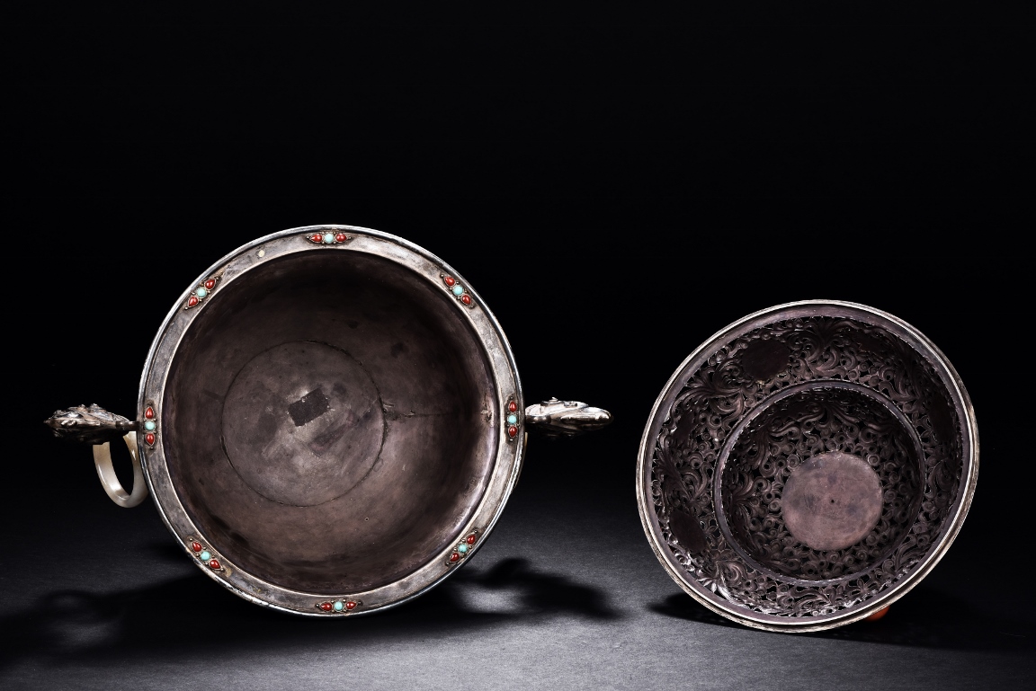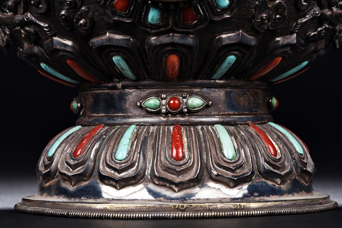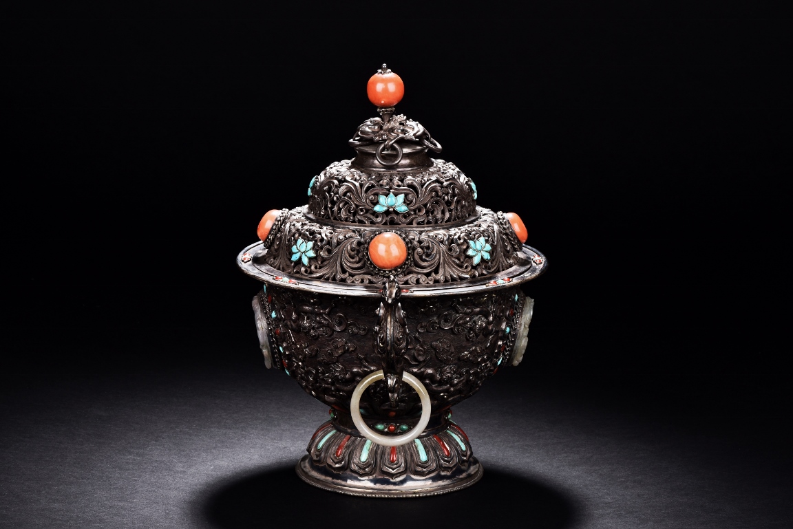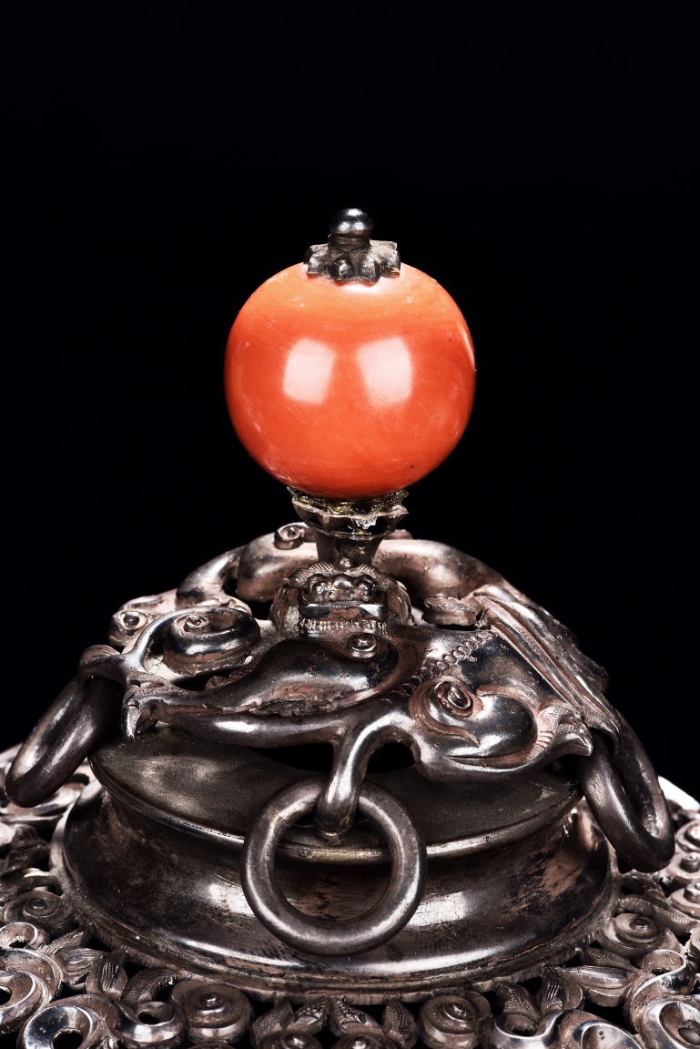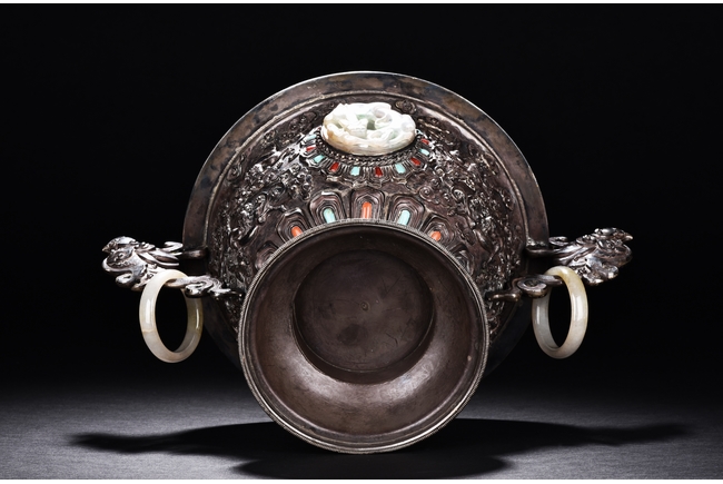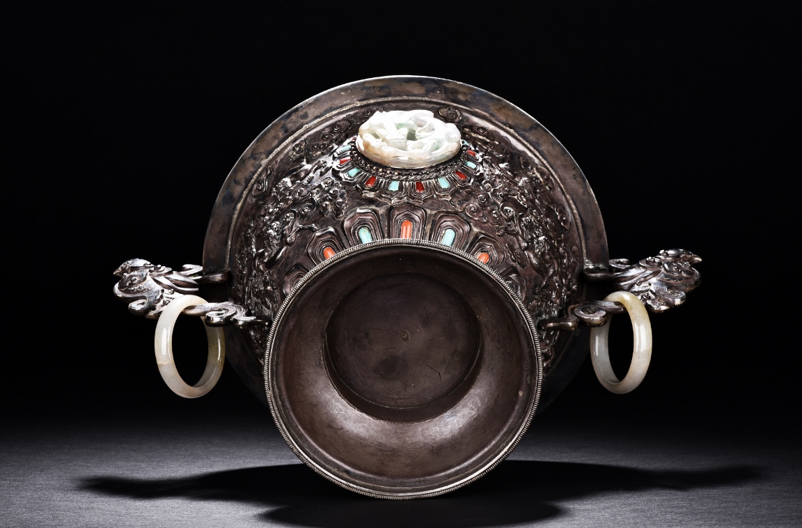 本件貢爐藏品以純銀為主,器物工藝精美,包漿古潤,爐體表面呈現鳳,瑞獸以及各種花卉紋,刻工流暢,圖案立體感強,疏密得當,美觀協調。器身更鑲嵌珊瑚,松石,翡翠等寶石,主以顯示出此器物之重要藝術價值。