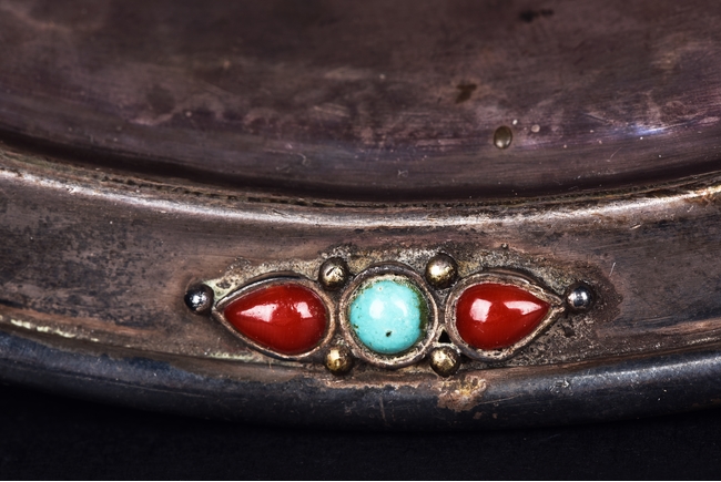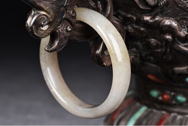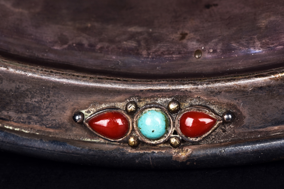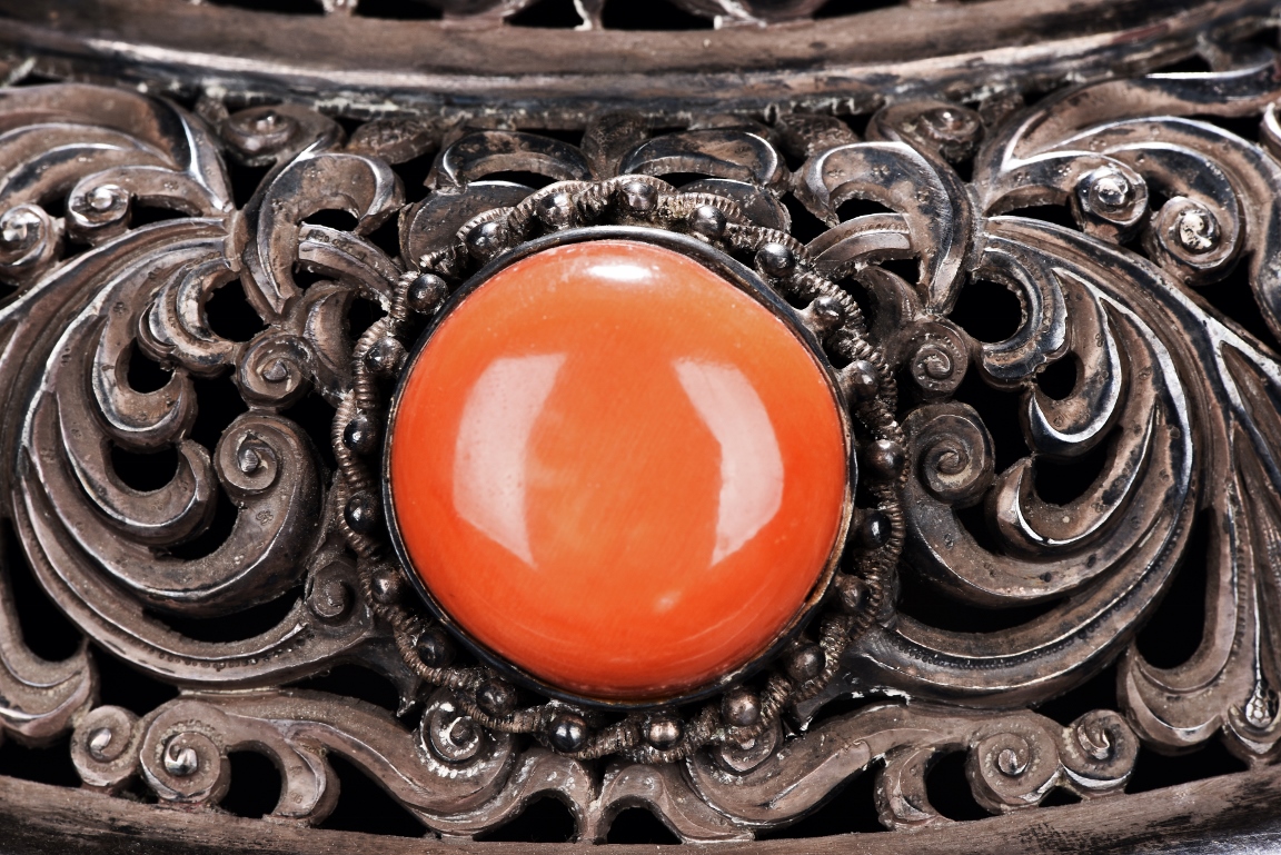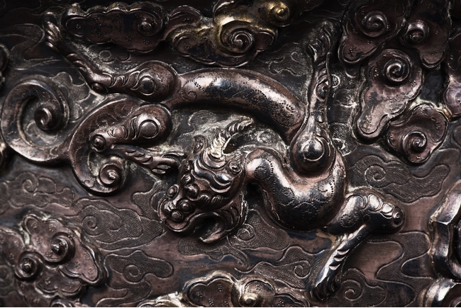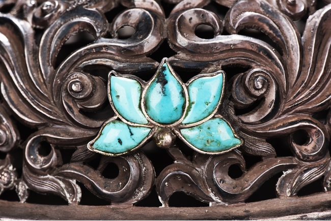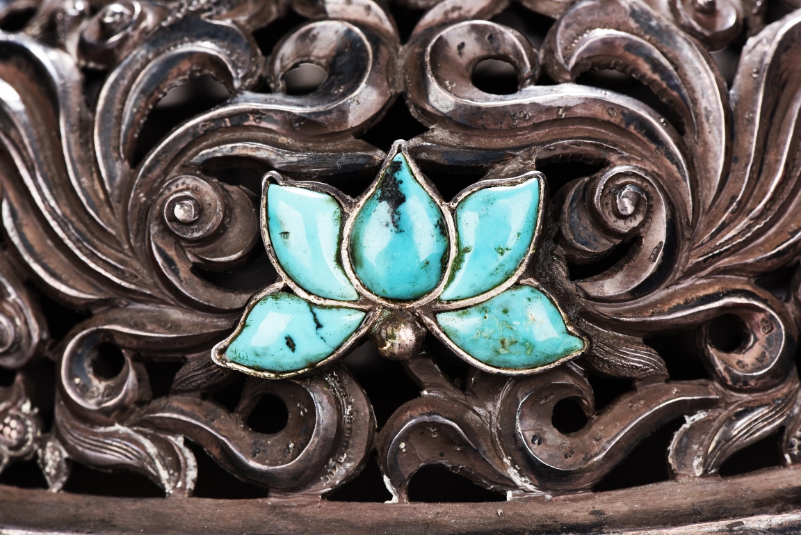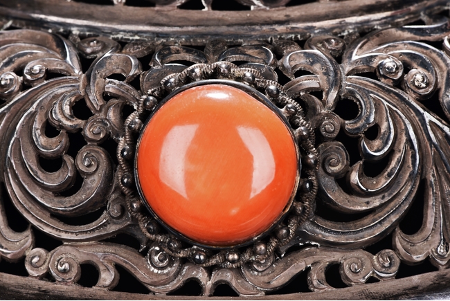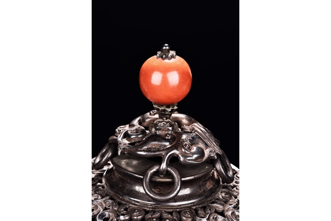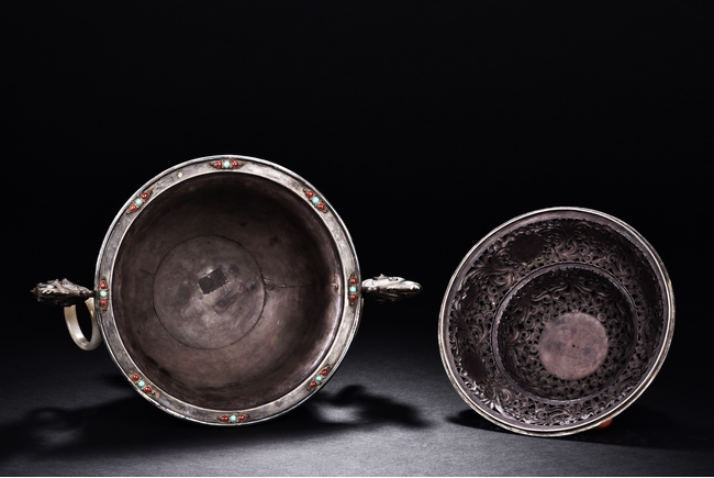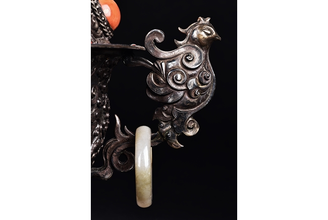 本件貢爐藏品以純銀為主,器物工藝精美,包漿古潤,爐體表面呈現鳳,瑞獸以及各種花卉紋,刻工流暢,圖案立體感強,疏密得當,美觀協調。器身更鑲嵌珊瑚,松石,翡翠等寶石,主以顯示出此器物之重要藝術價值。