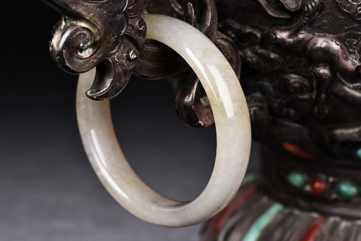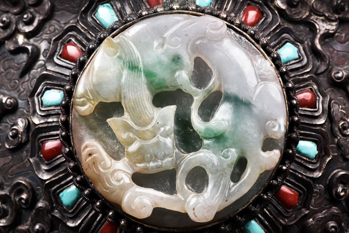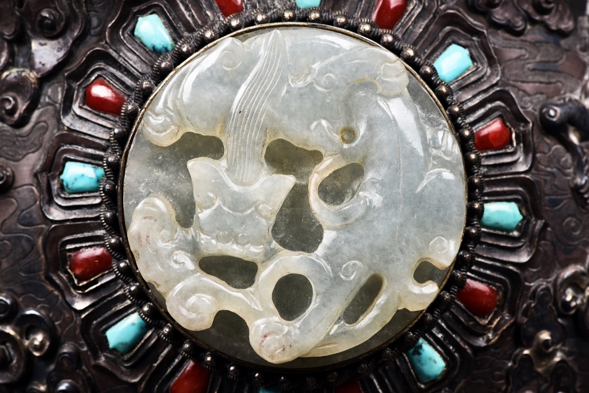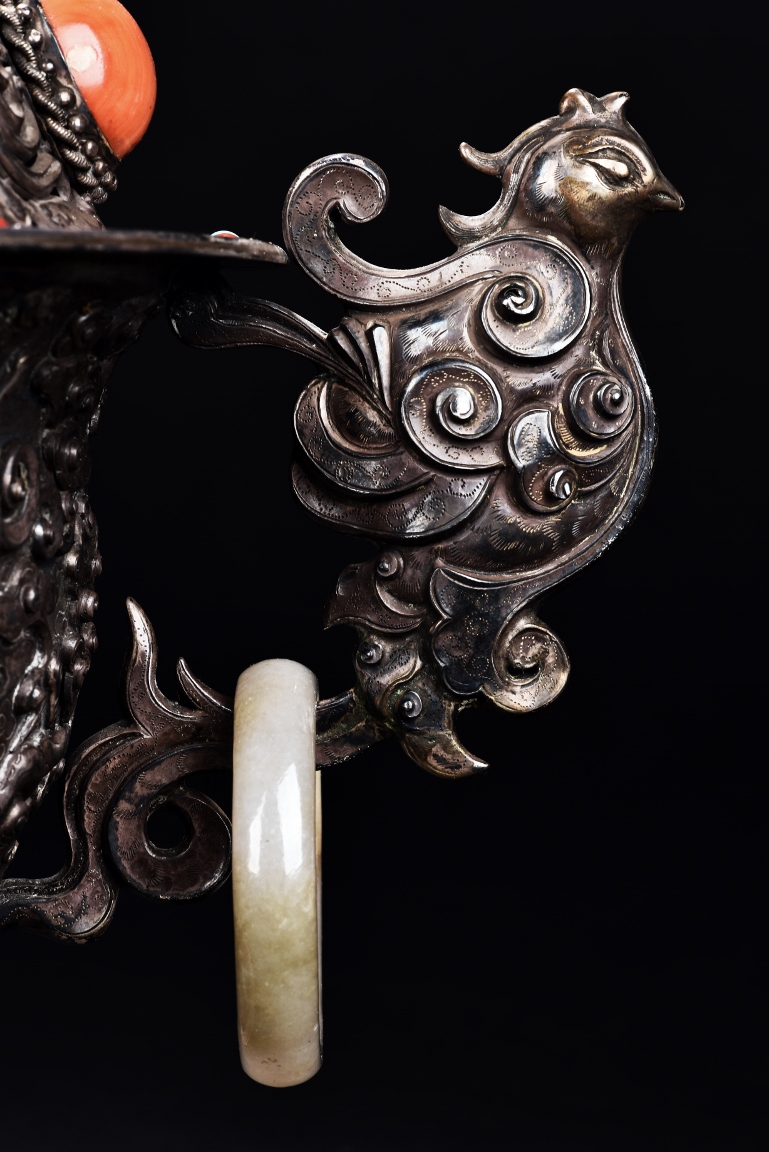 Rising from a splayed foot in form of floral petals decorated with coral and turquoise, the body decorated with a 'chilong' jadeite medallion surrounded with alternating coral and turquoise beads, reserved on finely cast chilong amid auspicious clouds motif in relief, with both sides cast with stylized phoenix-formed handles with loose jade ring, the cover decorated with coral beads and turquoise flower motif reserved on pierced openwork scrolling foliage pattern, the top surmounted with a openwork chilong motif and topped with a large coral beads finial.