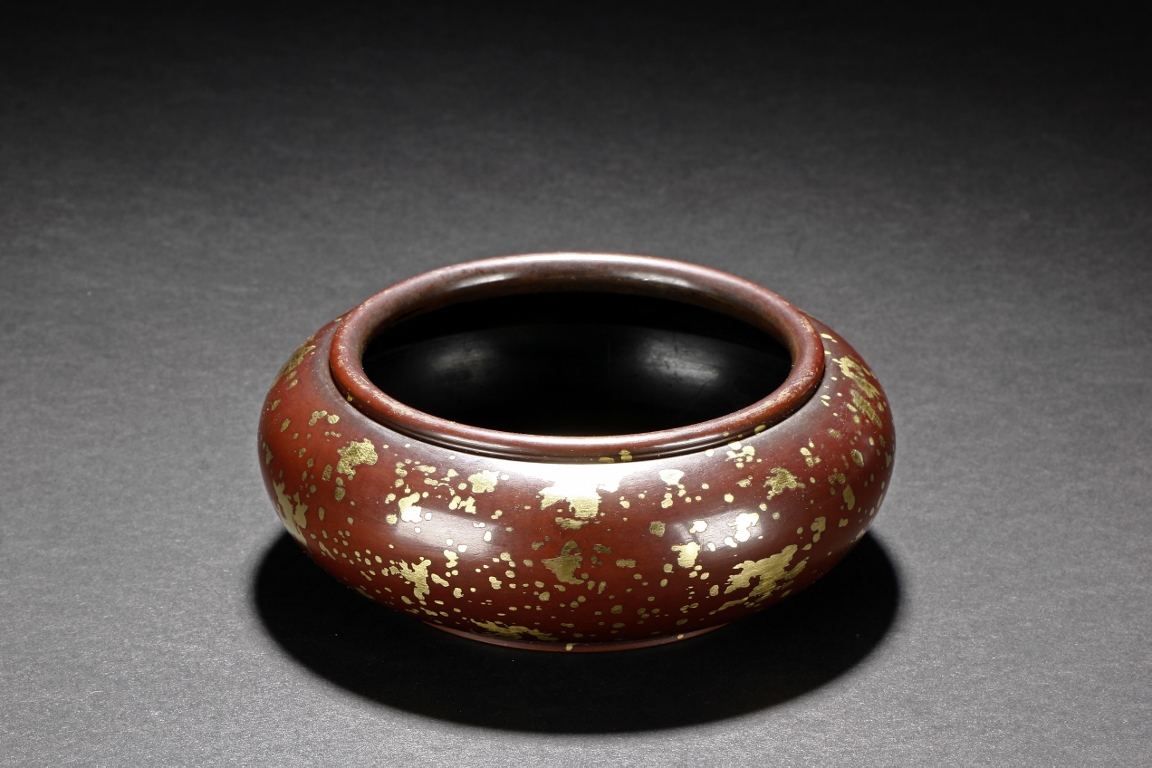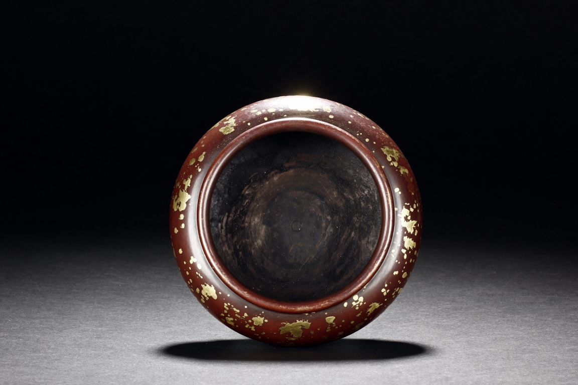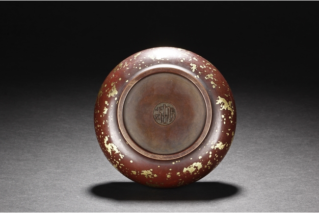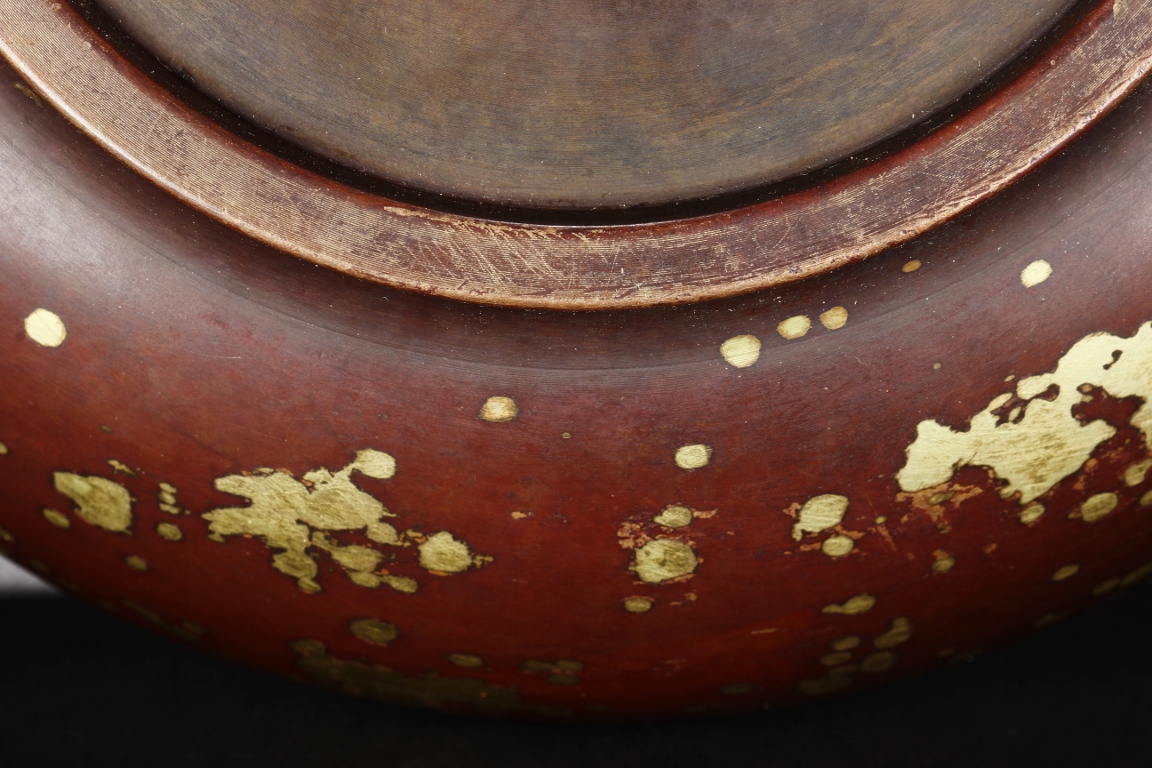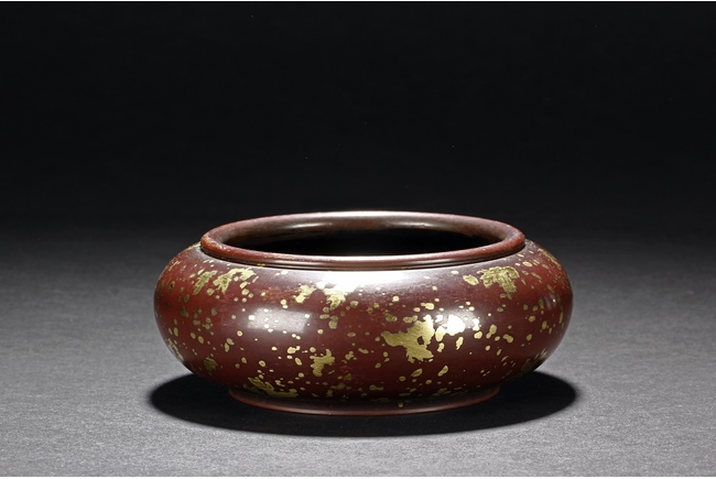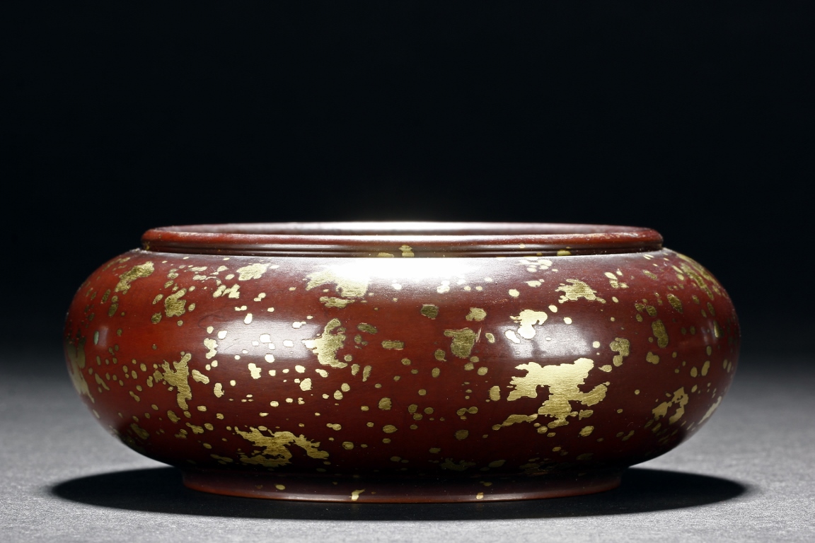 Of oval shape the censer raised on oval foot. The body covered in gilt splashes. The base cast with a raised three-character mark 'Chuan Gu Shi' in a roundel.
