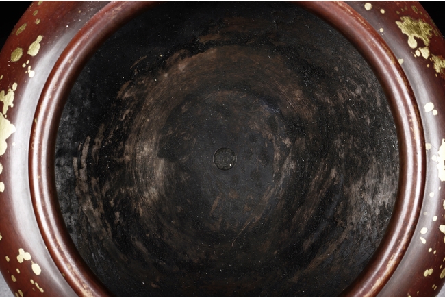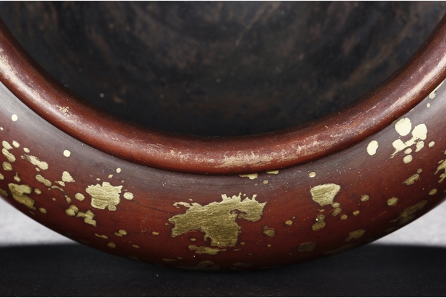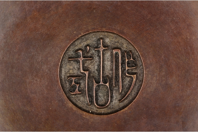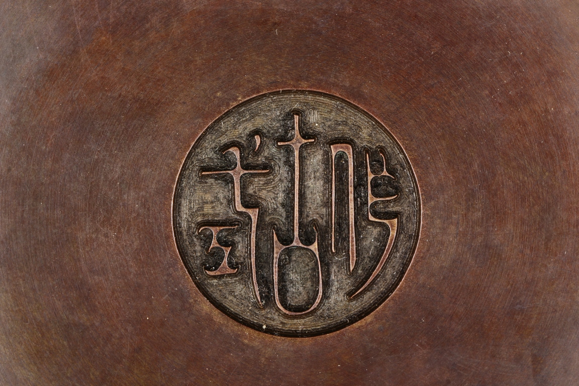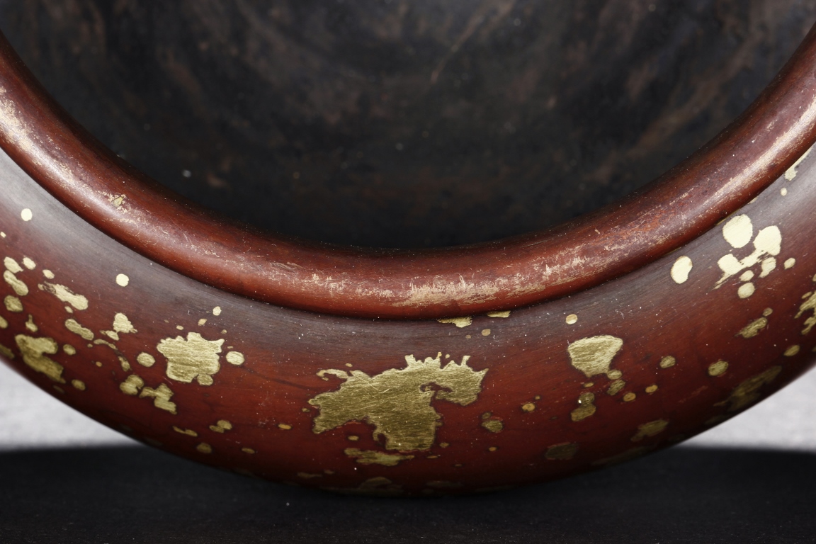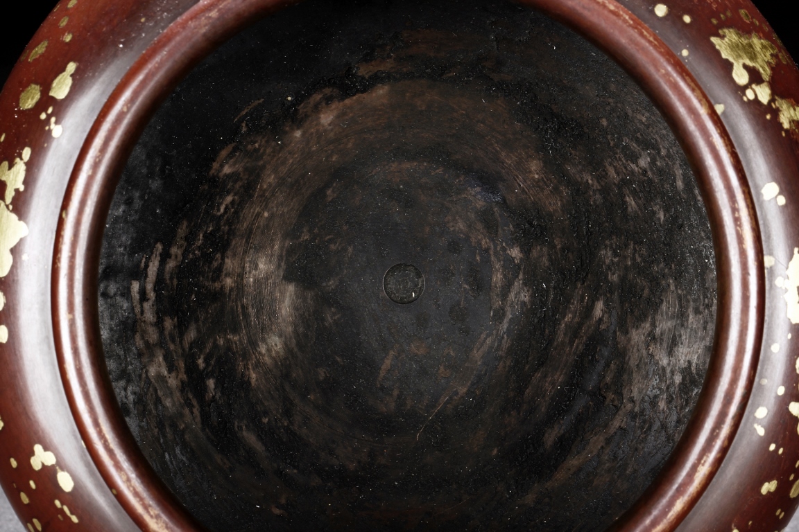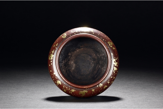 Of oval shape the censer raised on oval foot. The body covered in gilt splashes. The base cast with a raised three-character mark 'Chuan Gu Shi' in a roundel.