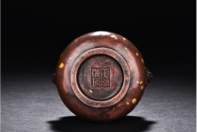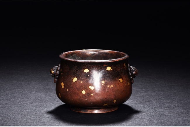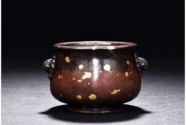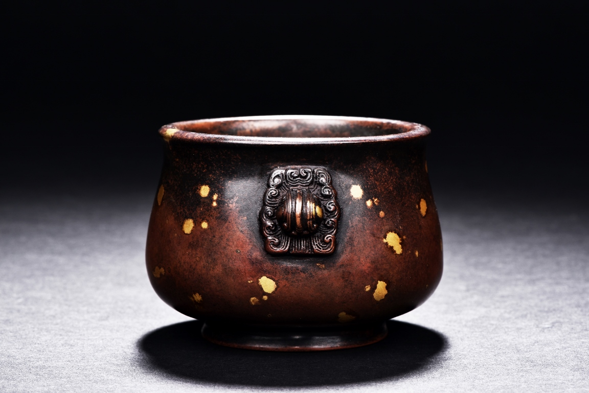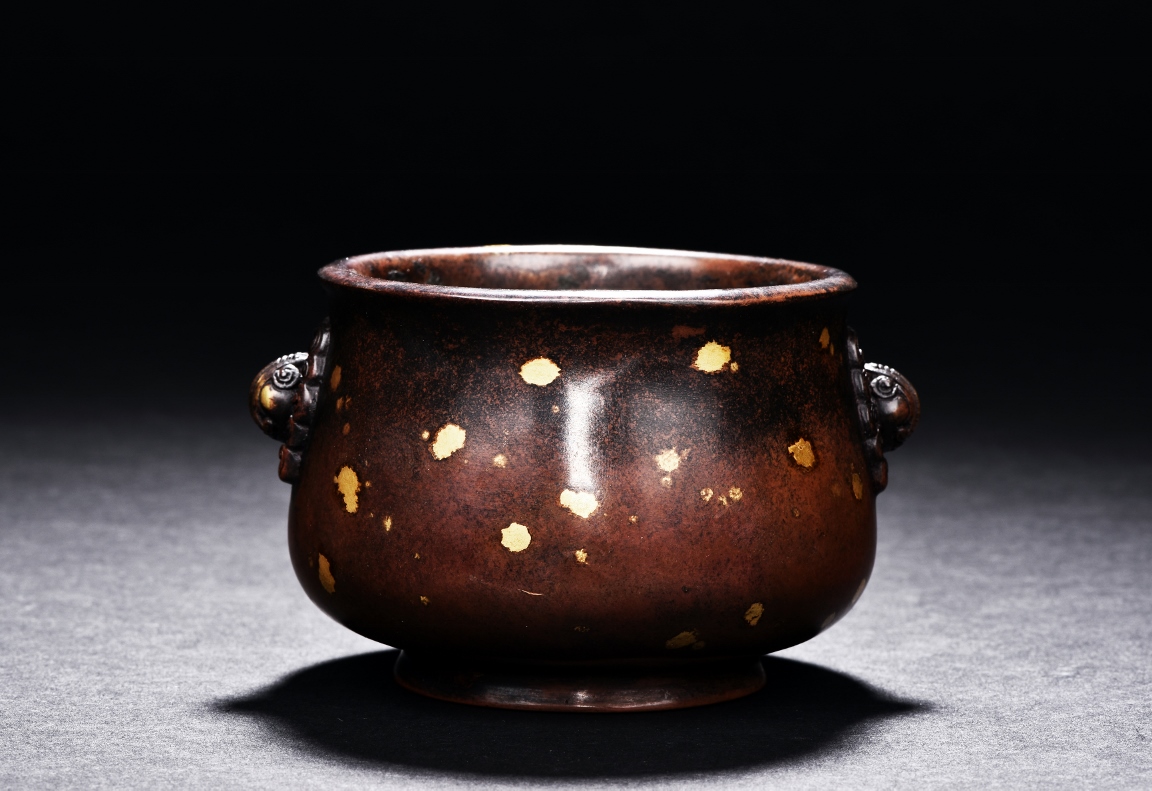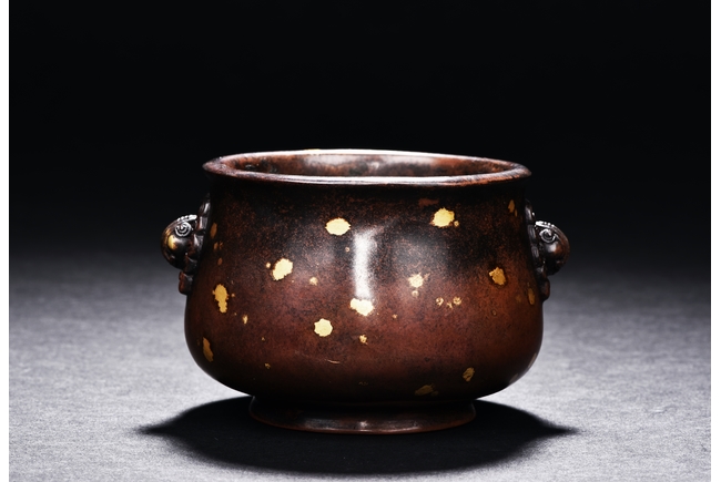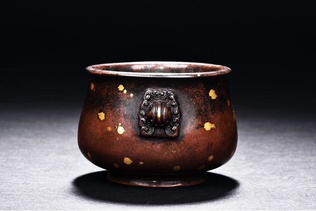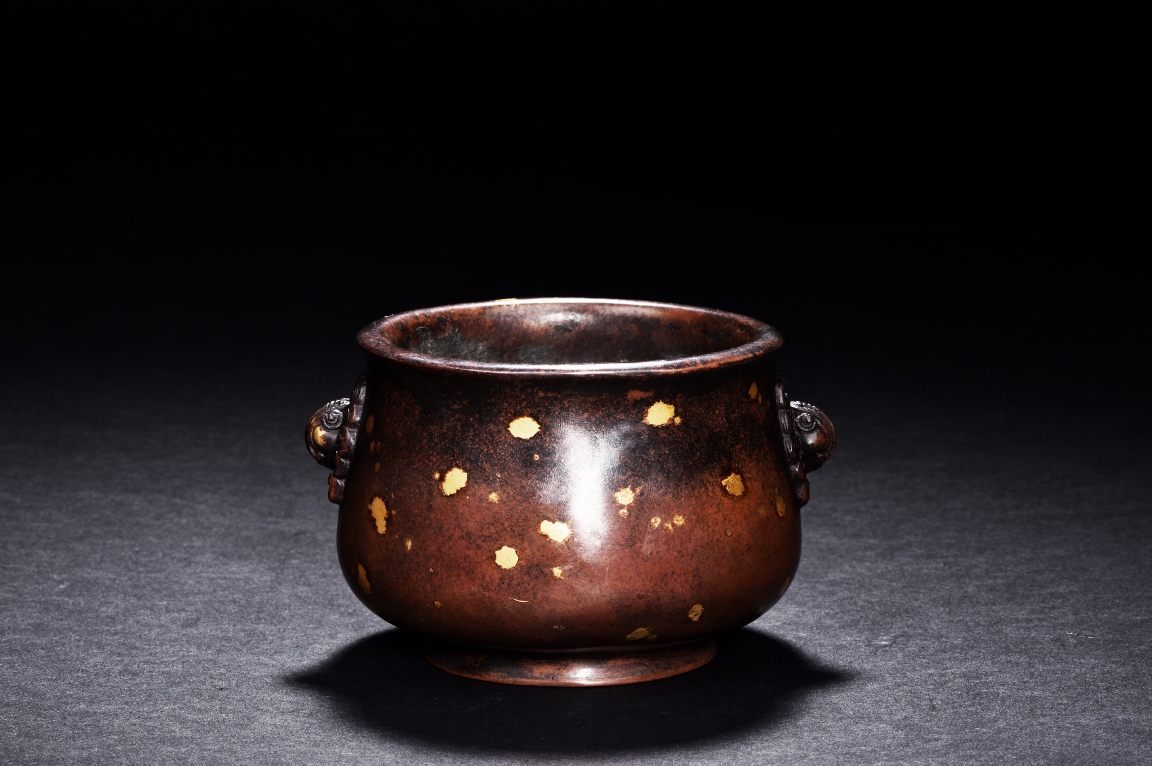 Supported on a short circular foot ring, the exterior is decorated with splashed gilt, with two finely cast ears and slightly flared rim. The bottom bears four character 'Yu Tang Qing Wan' (For pure pleasure of the Jade Hall). Qing Dynasty period.