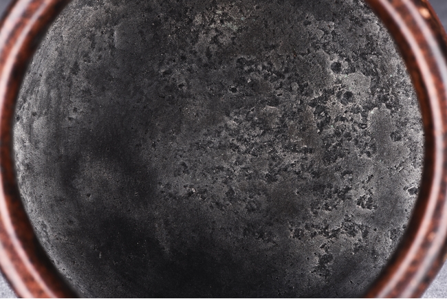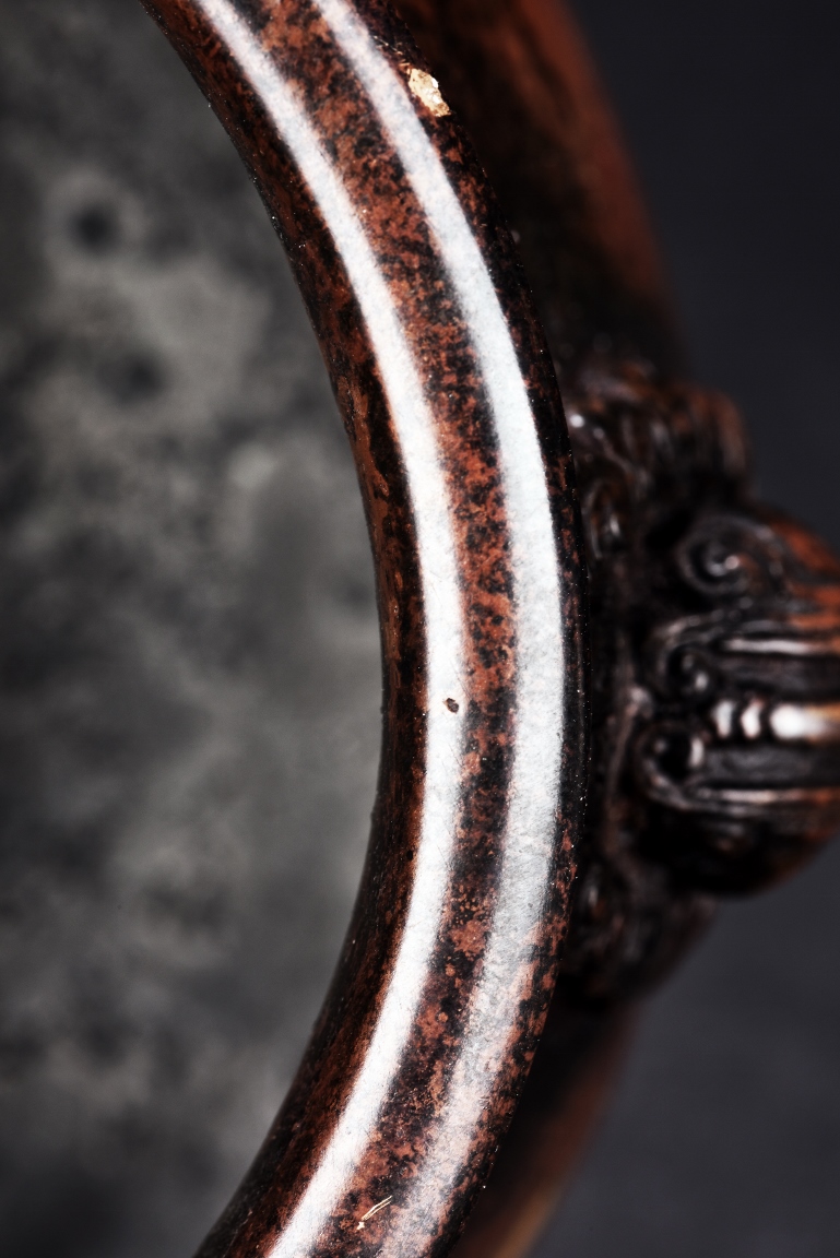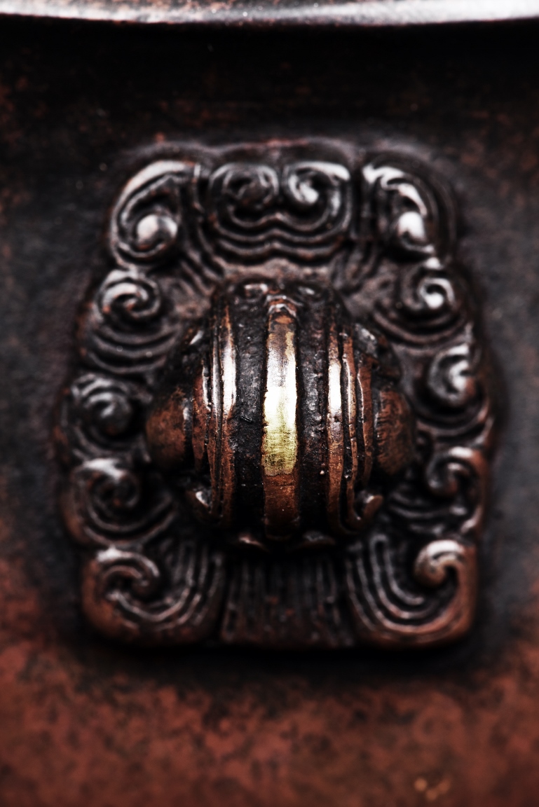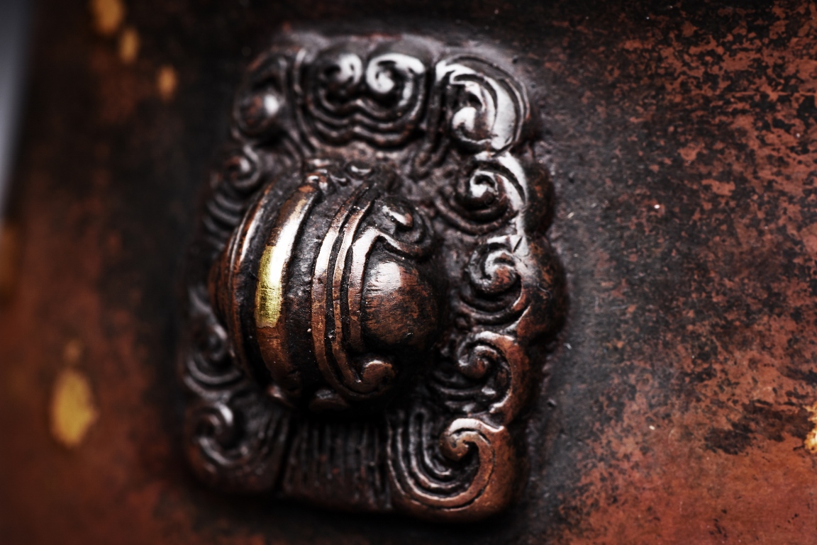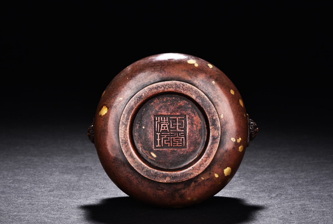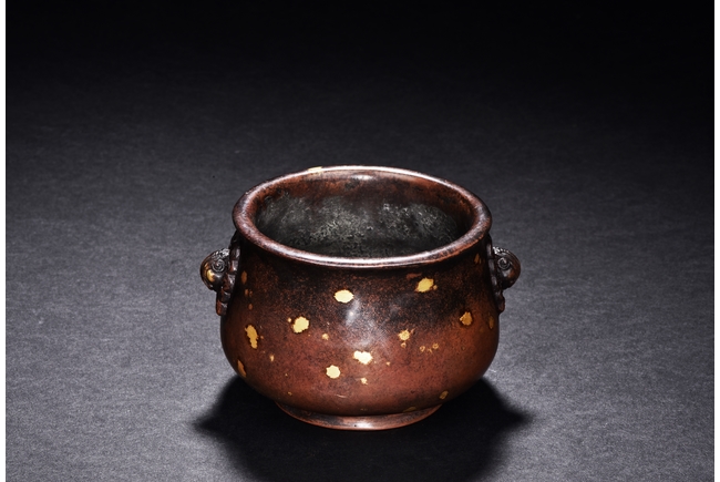Supported on a short circular foot ring, the exterior is decorated with splashed gilt, with two finely cast ears and slightly flared rim. The bottom bears four character 'Yu Tang Qing Wan' (For pure pleasure of the Jade Hall). Qing Dynasty period.