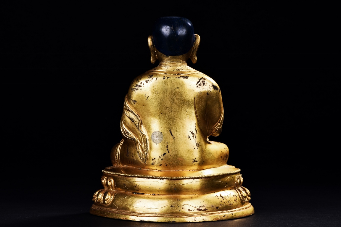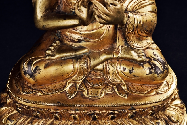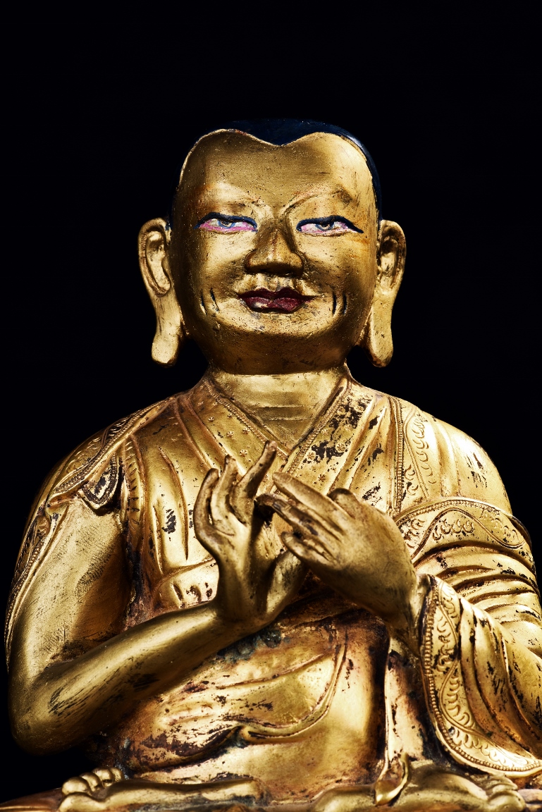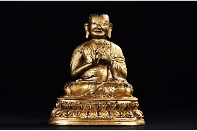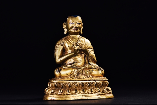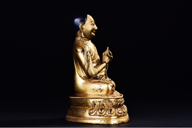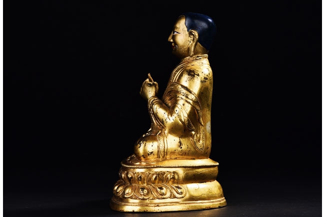 The guru shown seated on double lotus throne in padmasana, his hands raised in dharmachakra mudra, wearing robes with incised floral hems, the face shown with smiling mouth, eyes and mouth painted with red pigments; the hair with short cropped style, the base sealed. Qing Dynasty period.