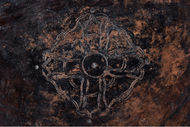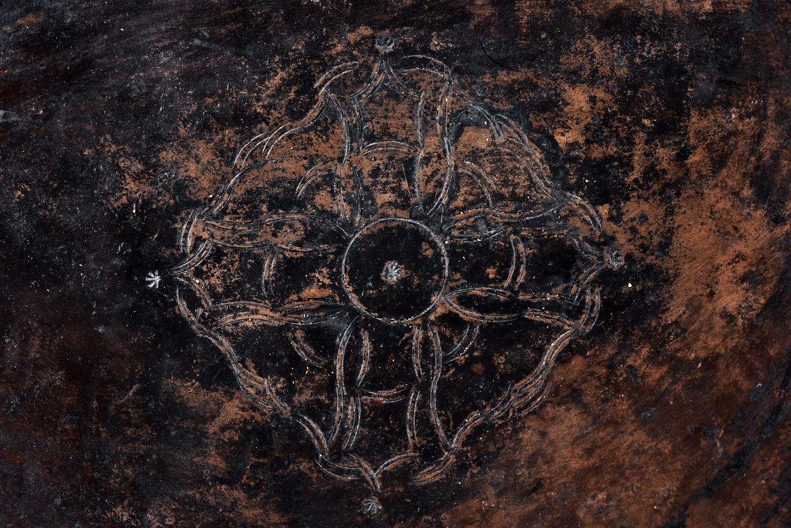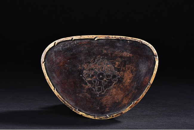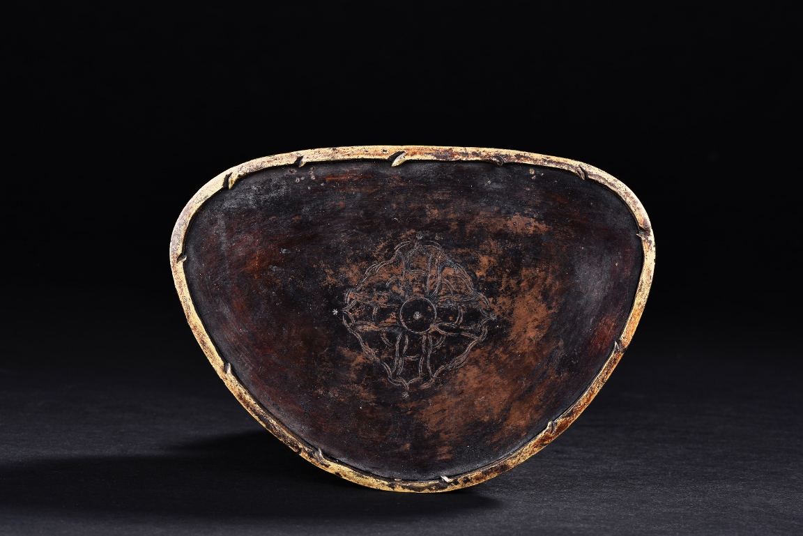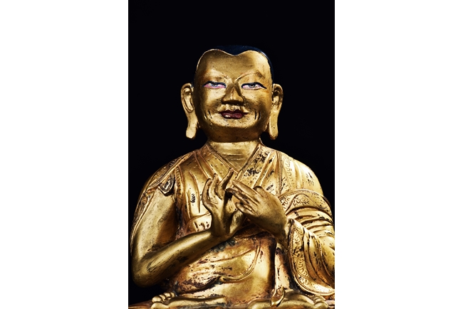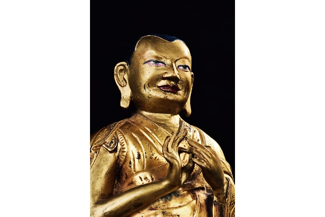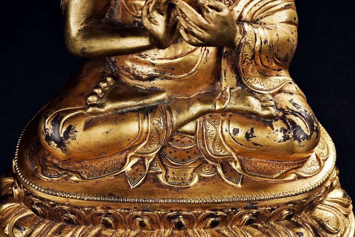 The guru shown seated on double lotus throne in padmasana, his hands raised in dharmachakra mudra, wearing robes with incised floral hems, the face shown with smiling mouth, eyes and mouth painted with red pigments; the hair with short cropped style, the base sealed. Qing Dynasty period.