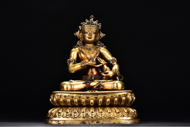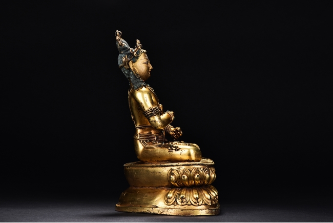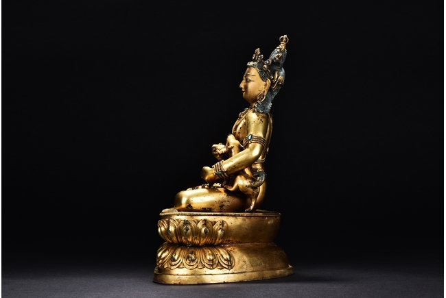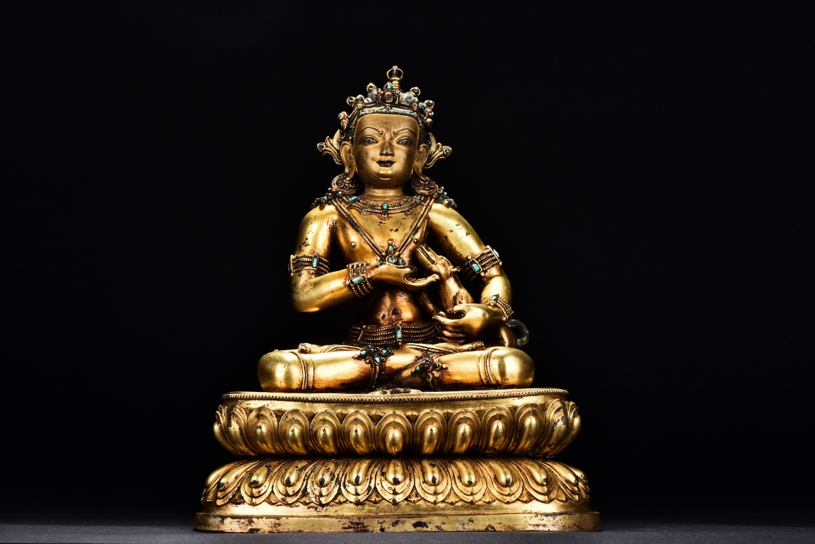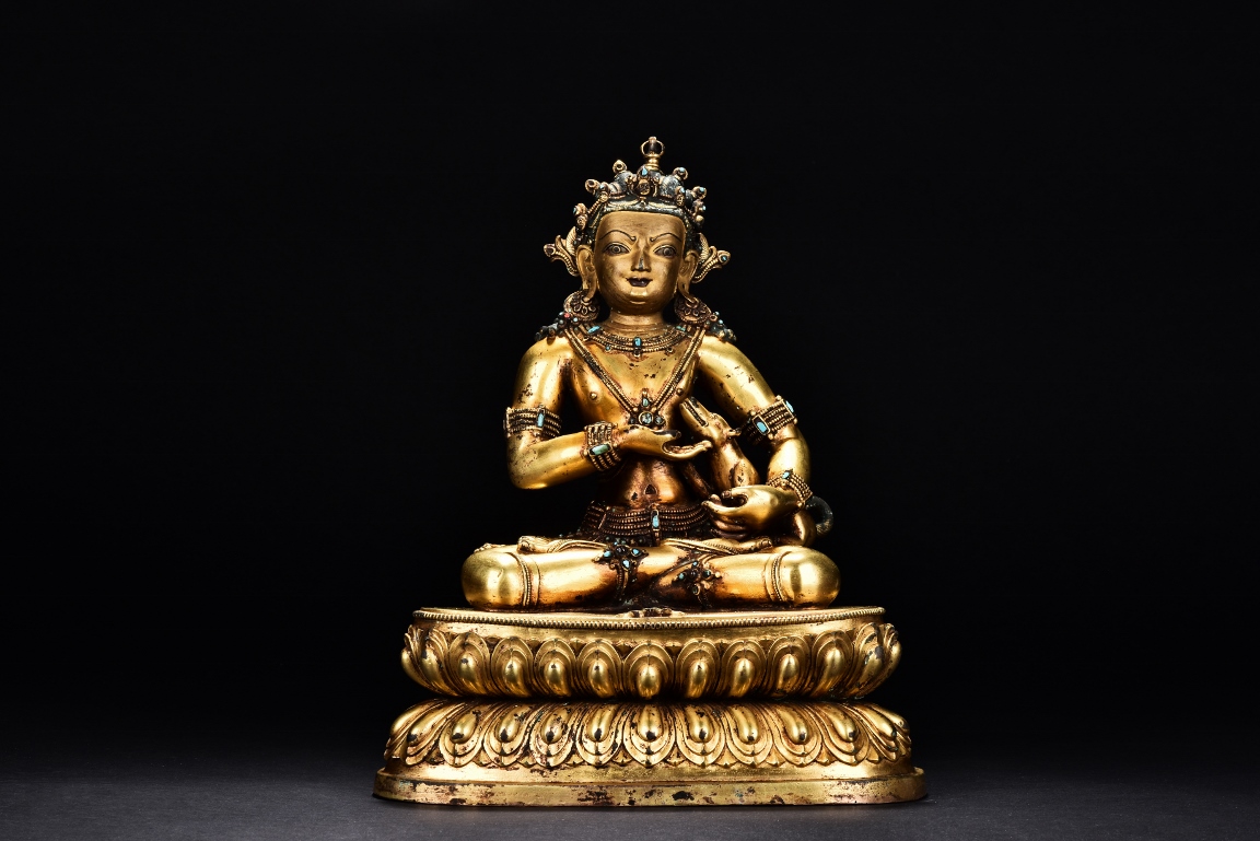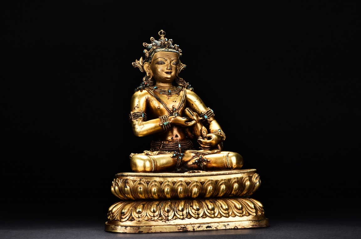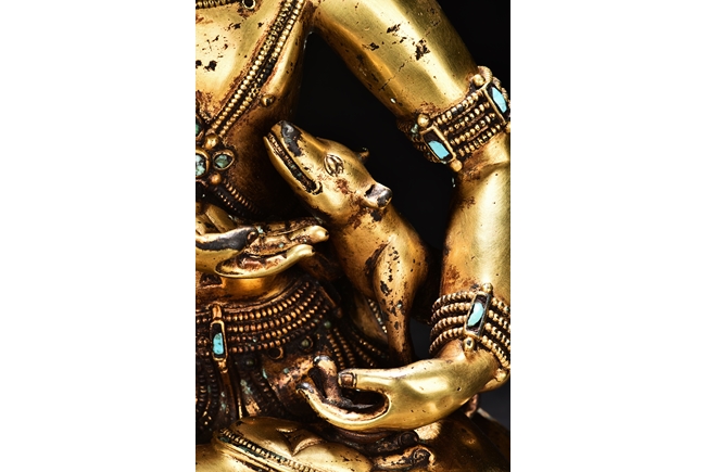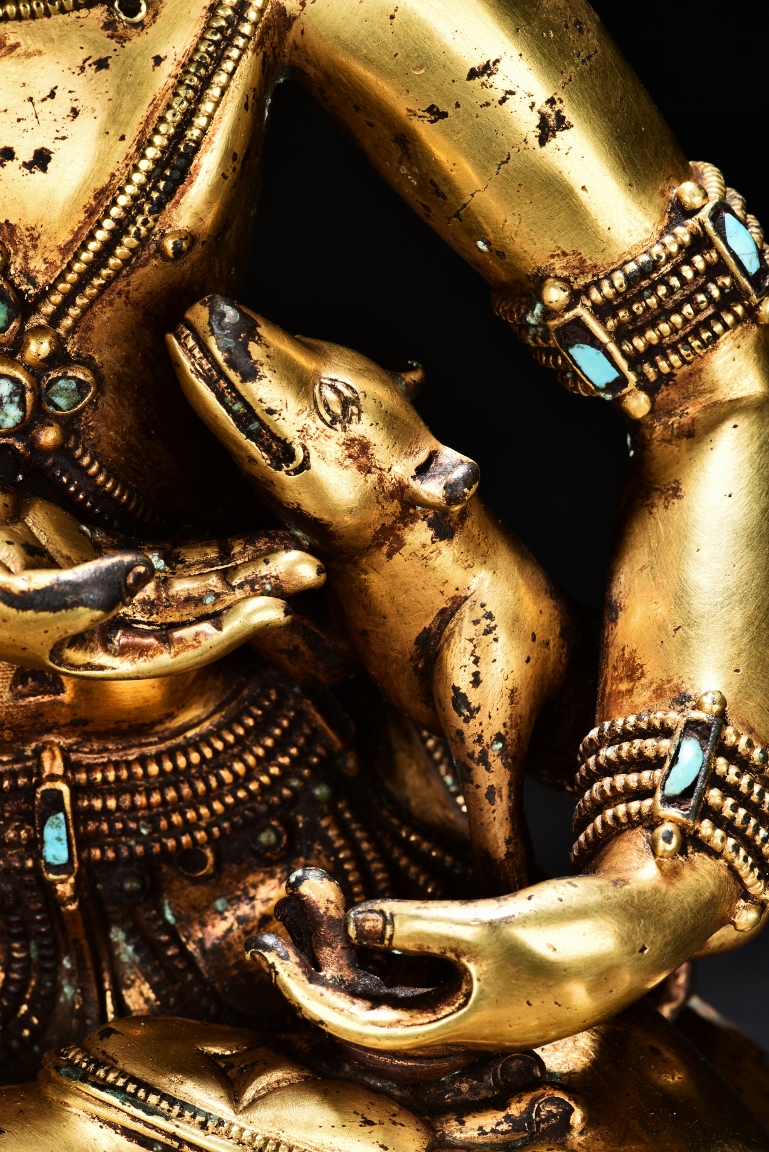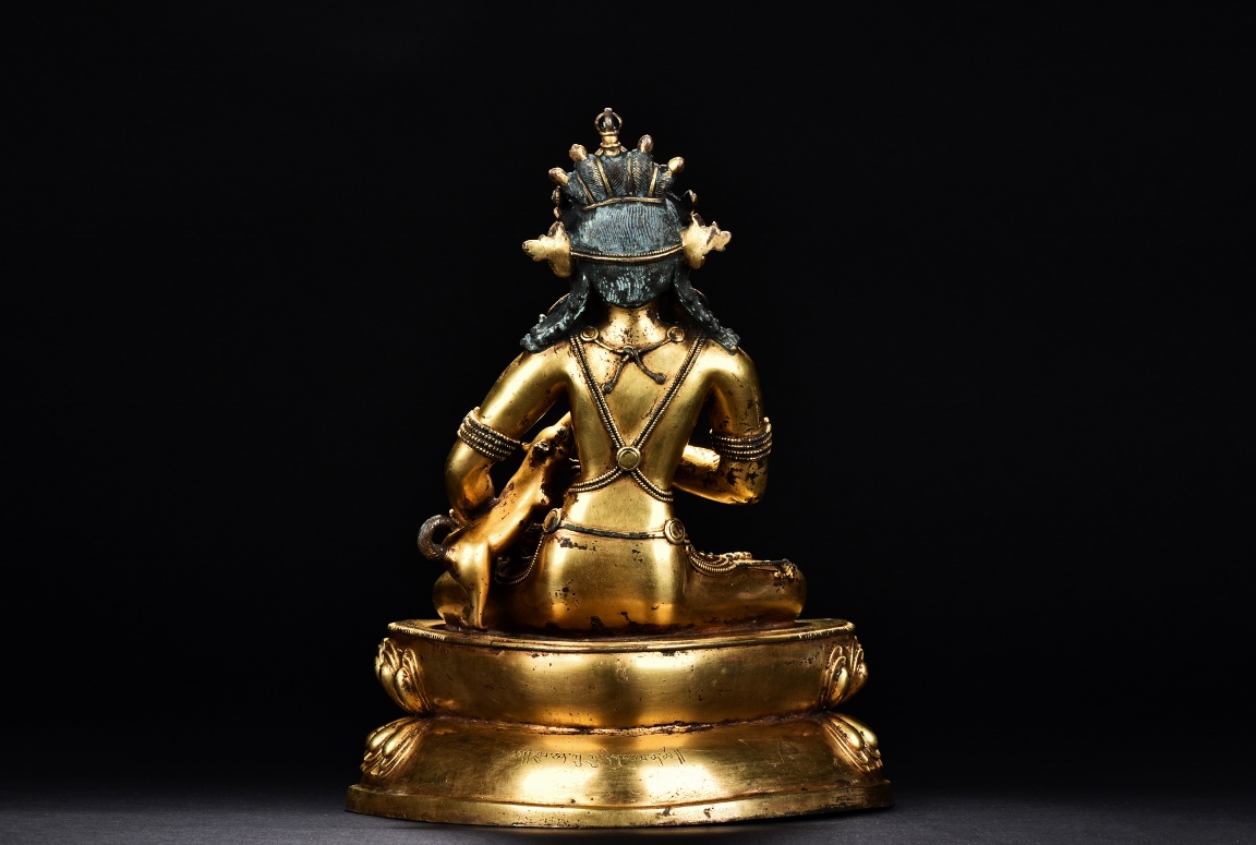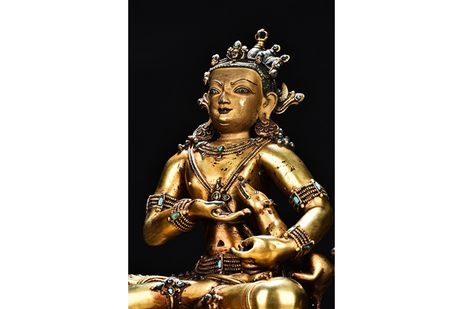 財神又稱布祿金剛。此尊財神造像左手抱鼠鼬,形象極為逼真。造像線條流暢,身體比例協調,通體鎏金,背刻藏文,具有很高的收藏價值。
