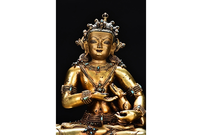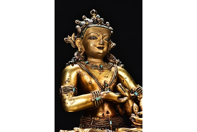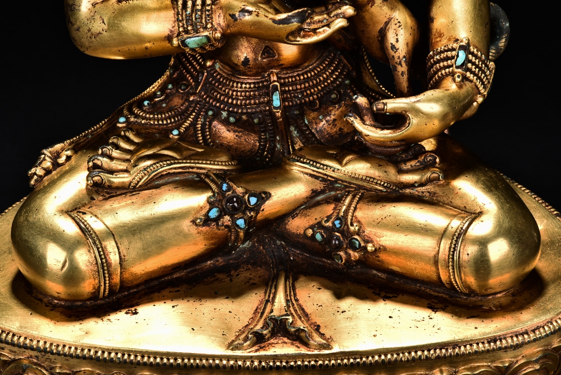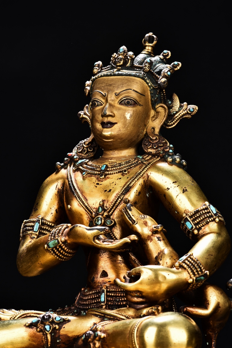 Seated on a double lotus throne in padmasana, the figure holding a mongoose with left hand, the body wearing elaborate beaded jewellery with turquoise beads, his face with protruding eyes, elongated earlobes, and ornated crown. 18th Century.