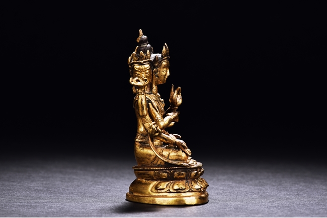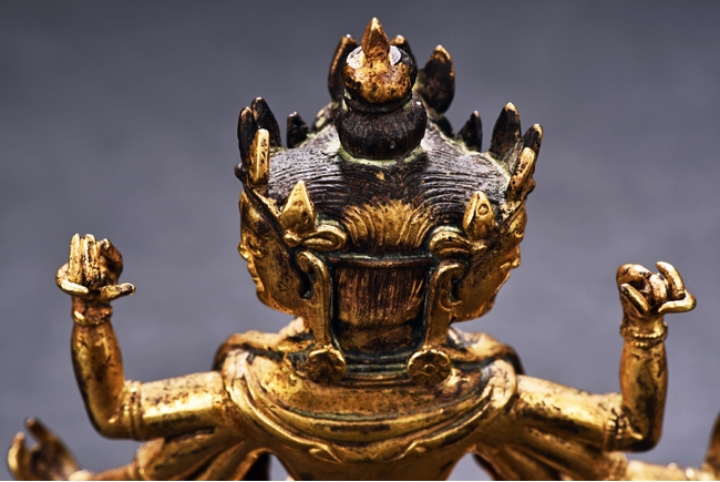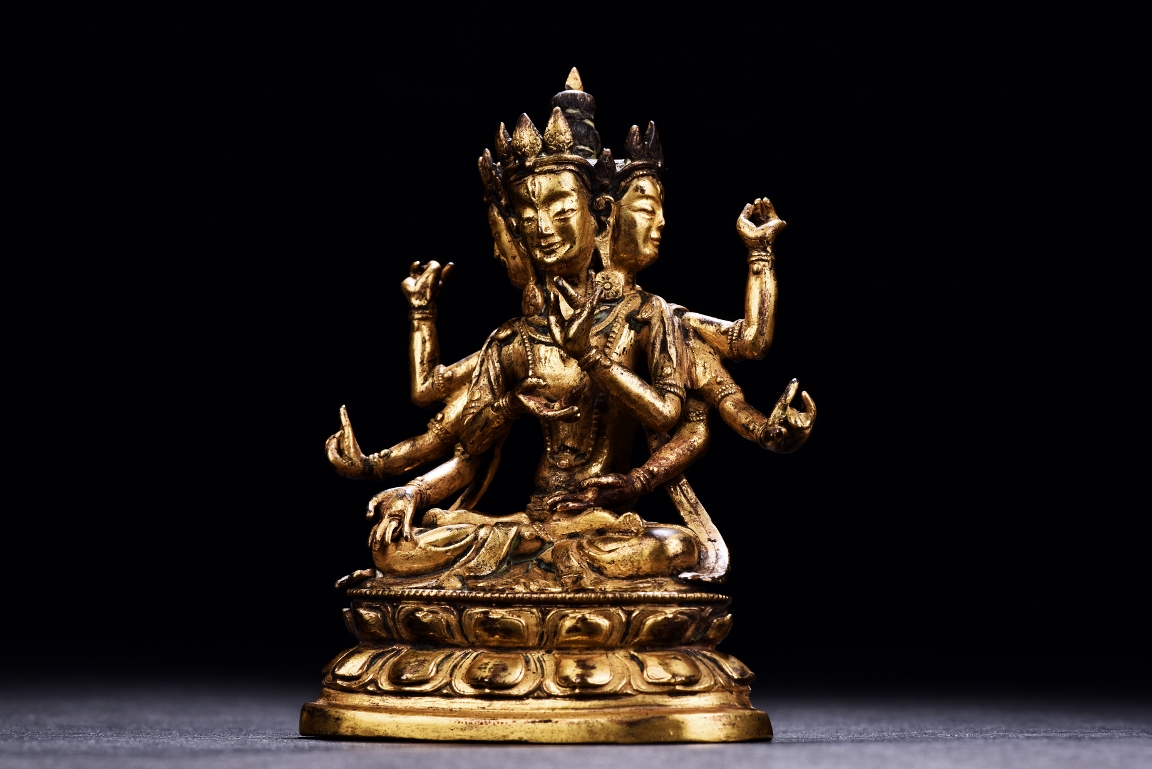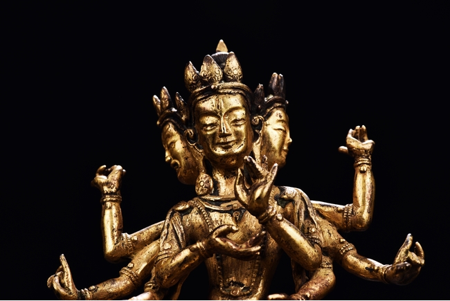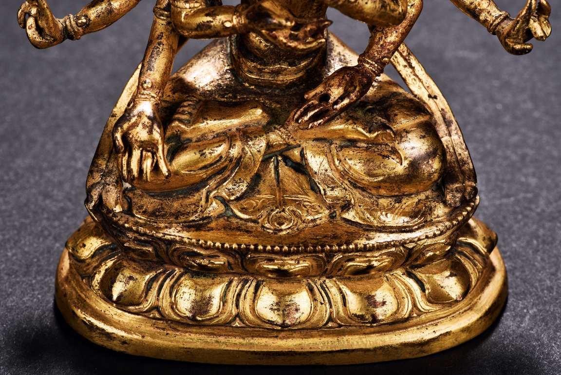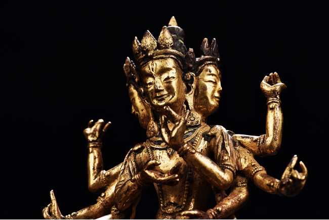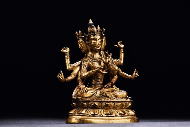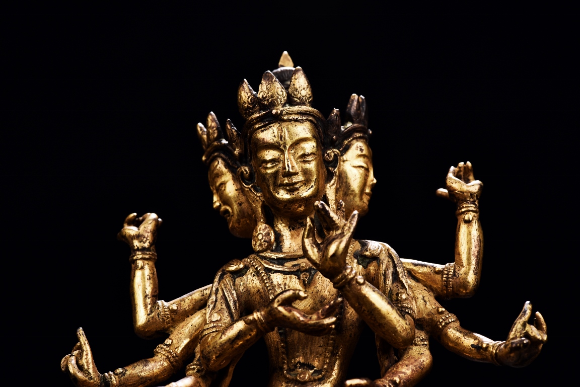 The three headed deity seated in dhyanasana on a double lotus base, the eight arms held in various mudras, dressed in a dhoti with elaborate jewellery, the hair piled up into a chignon crowned with a tiara. Early Qing Dynasty period.