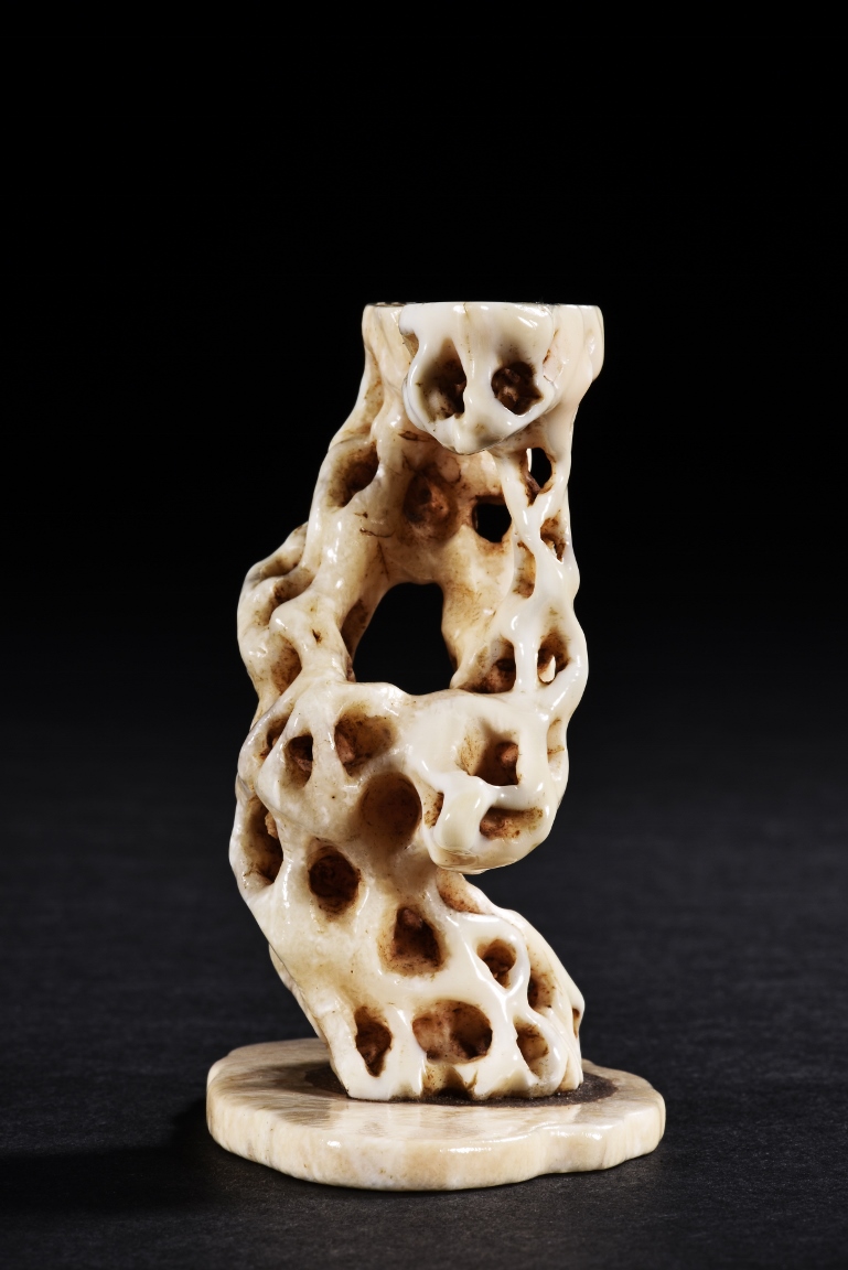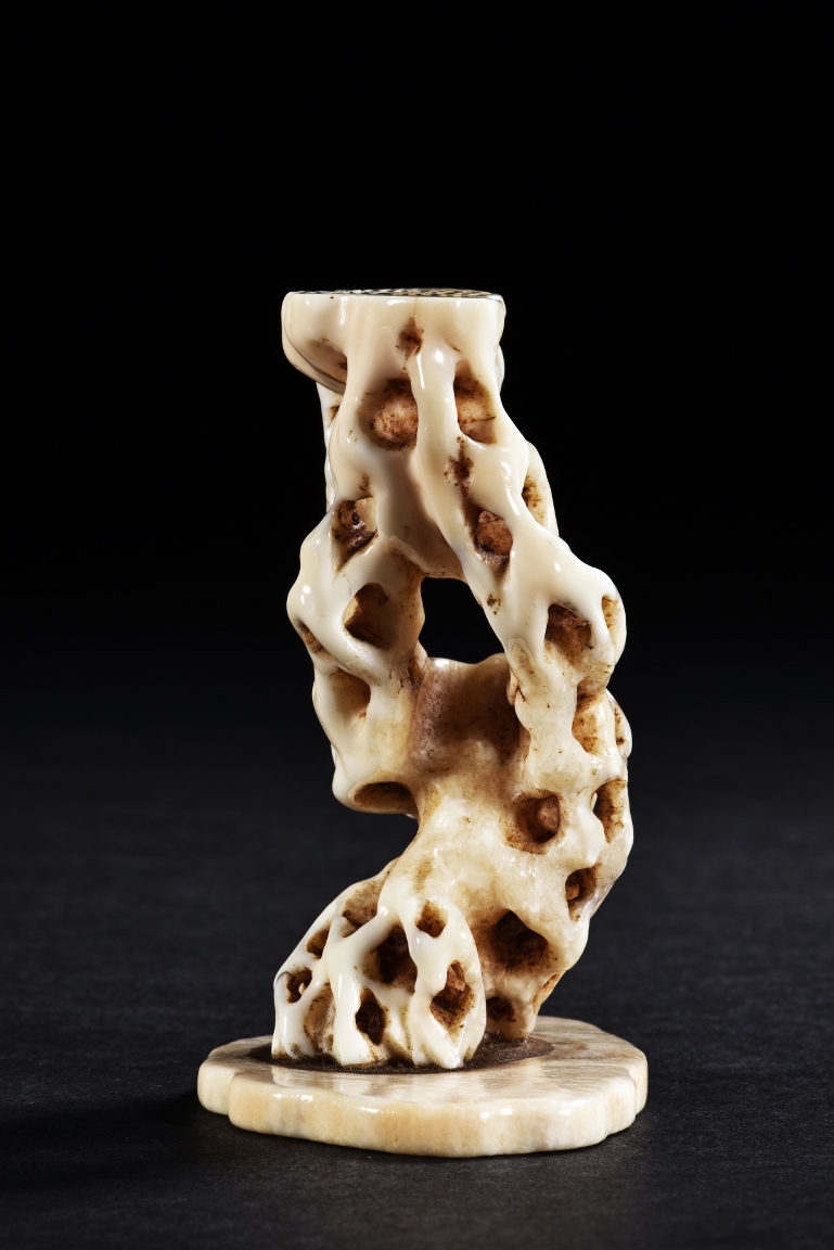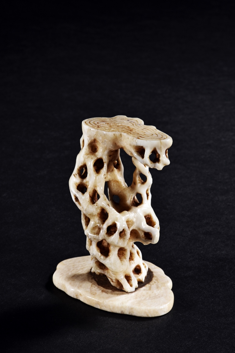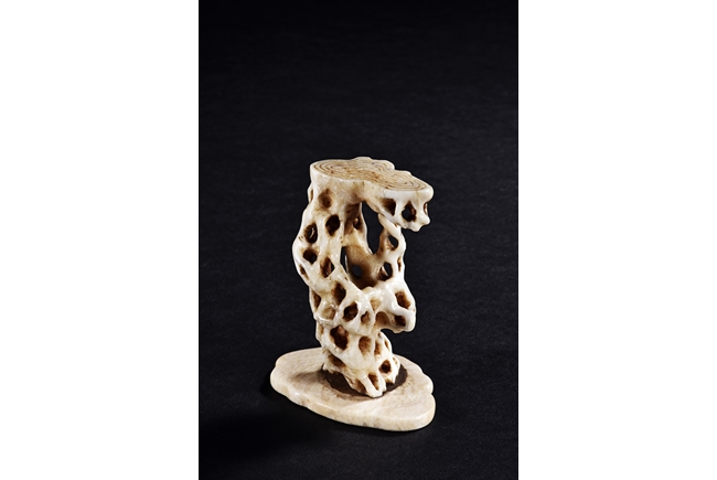 Of irregular shape, it is modelled as a scholar's rock of vertical form mounted on flat base, the 'rock' with wrinkled surface and pierced holes, the top incised with contour lines. The base incised with three characters 'Yu Xin Qi'.