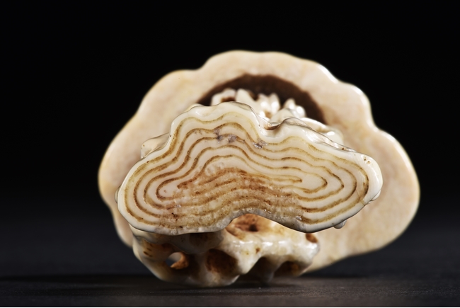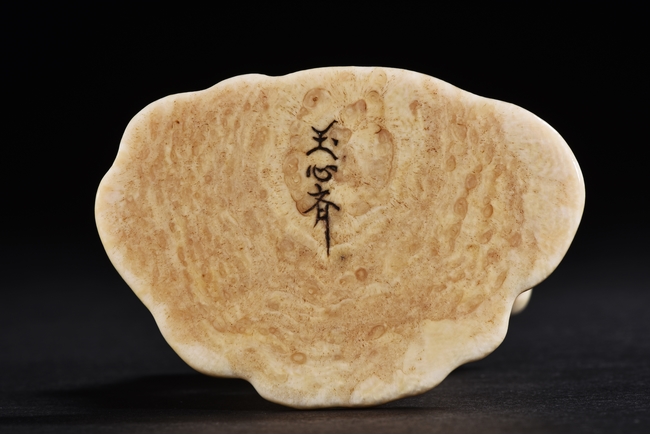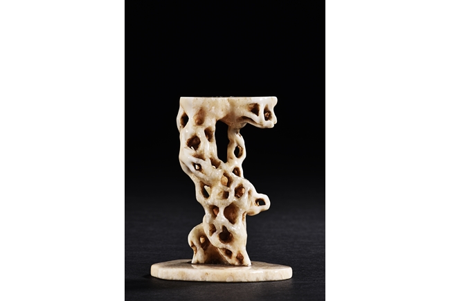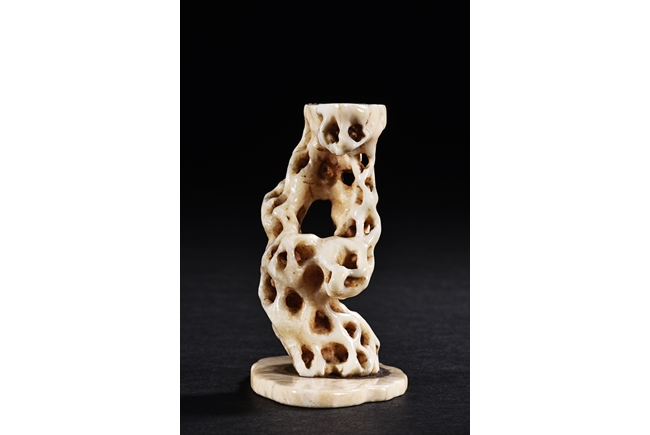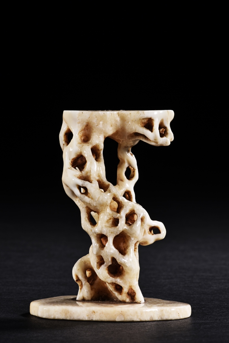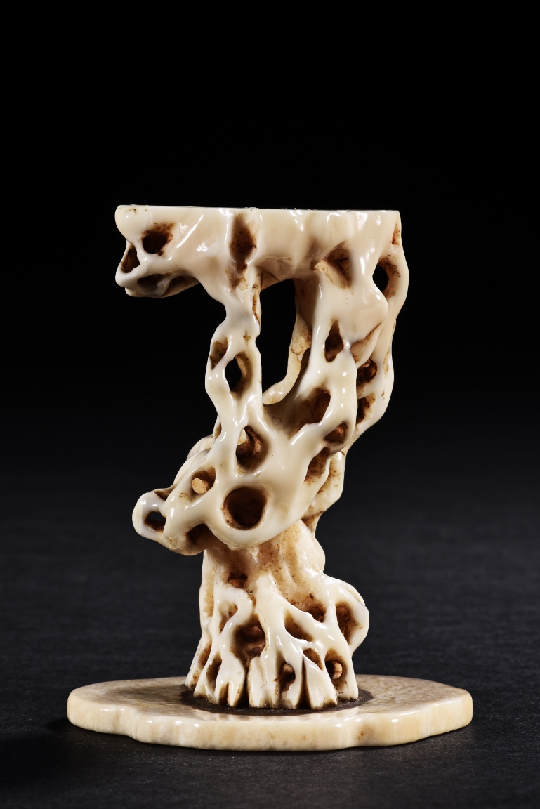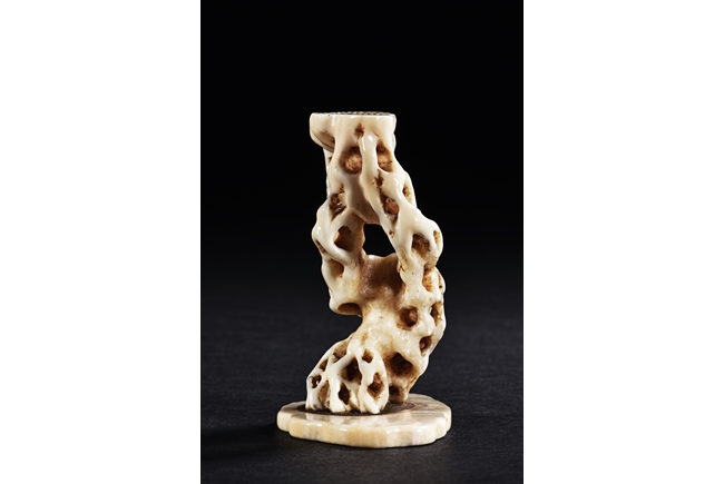 Of irregular shape, it is modelled as a scholar's rock of vertical form mounted on flat base, the 'rock' with wrinkled surface and pierced holes, the top incised with contour lines. The base incised with three characters 'Yu Xin Qi'.