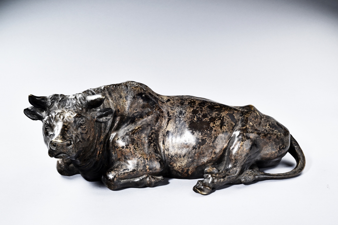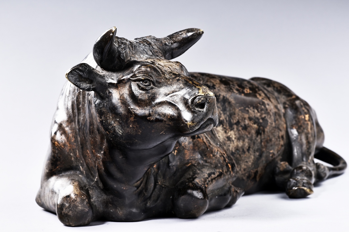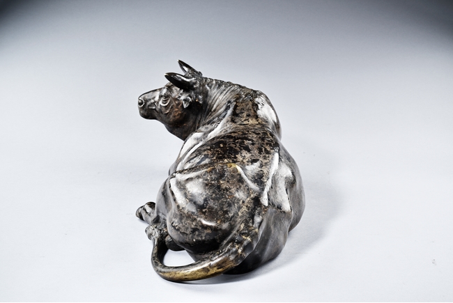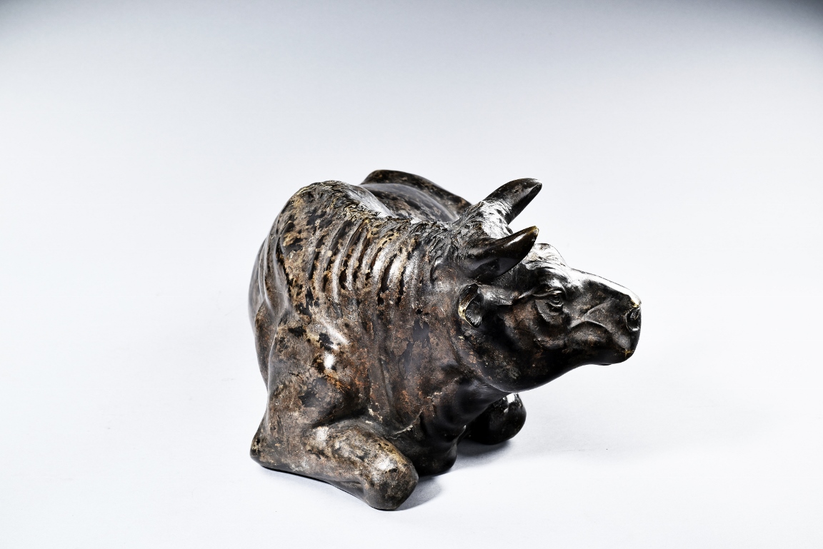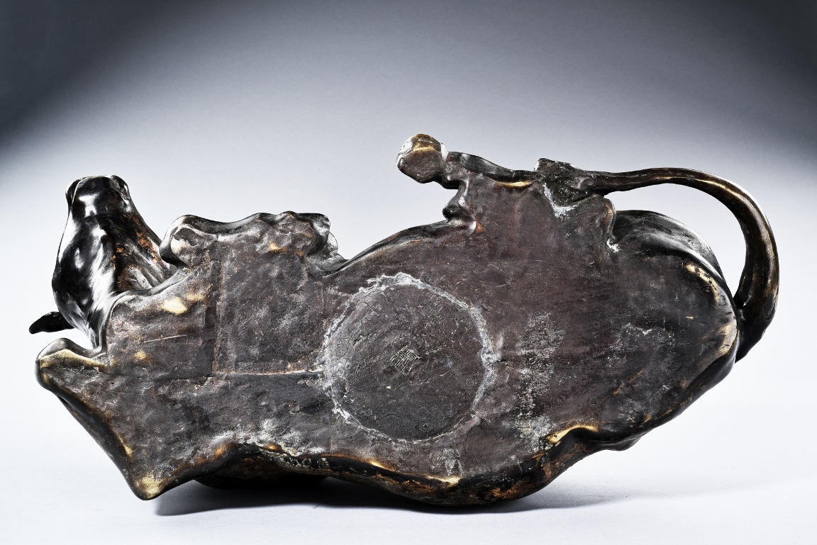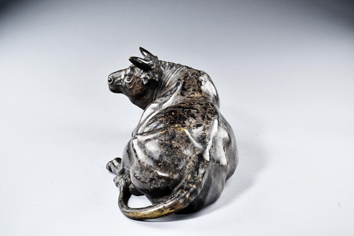 The buffalo is cast realistically in recumbent position with its legs tucked under the body, the head turning slightly to the left, its hair finely detailed with lines, the tail swept over to one side. The base of the statue is cast with four character mark. 18th Century.