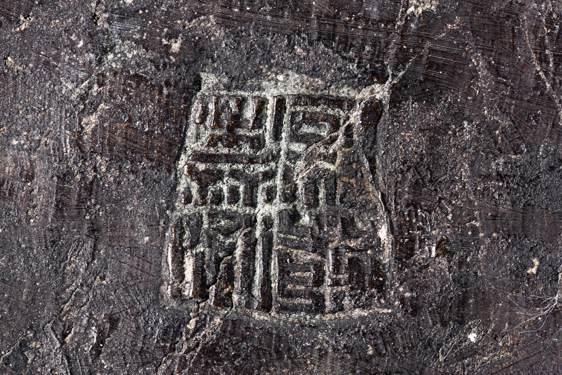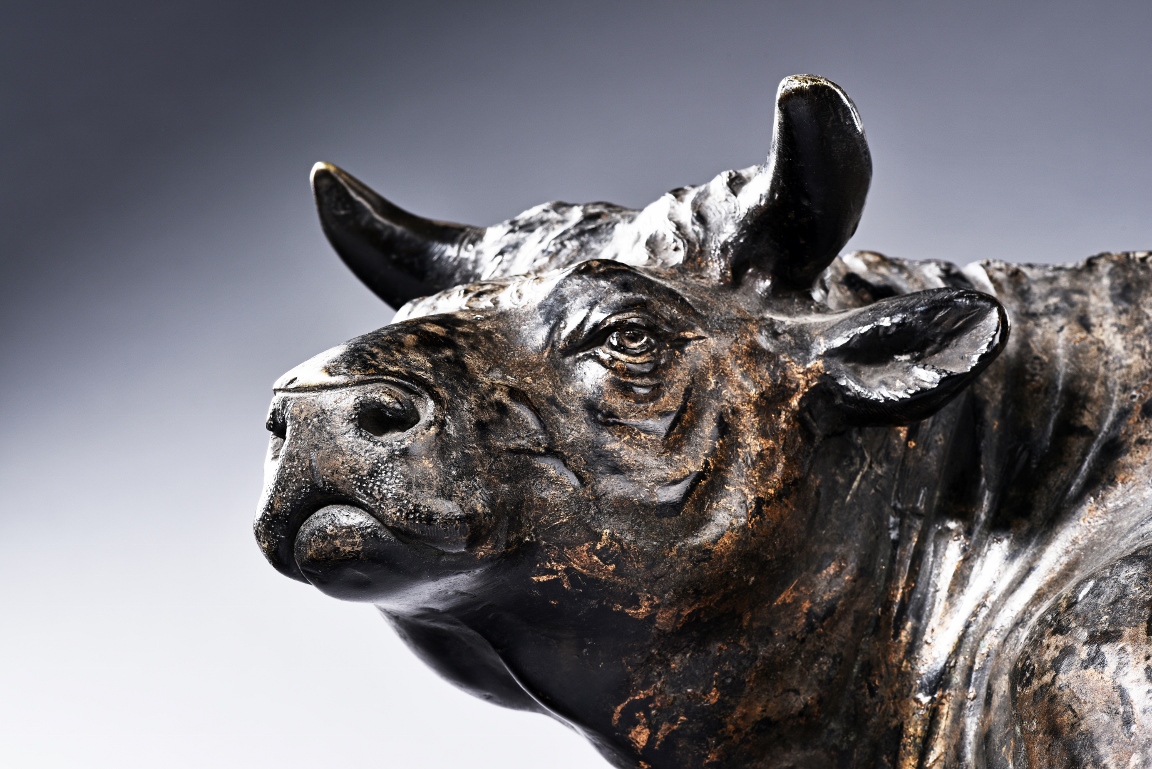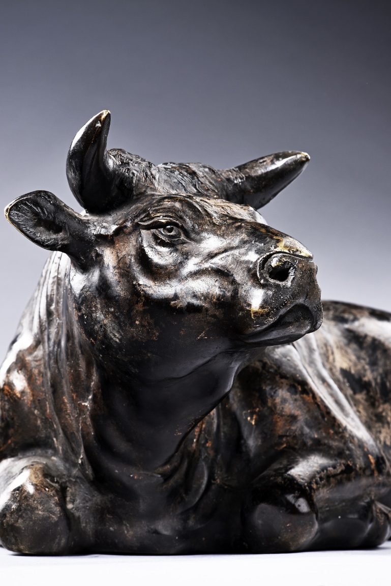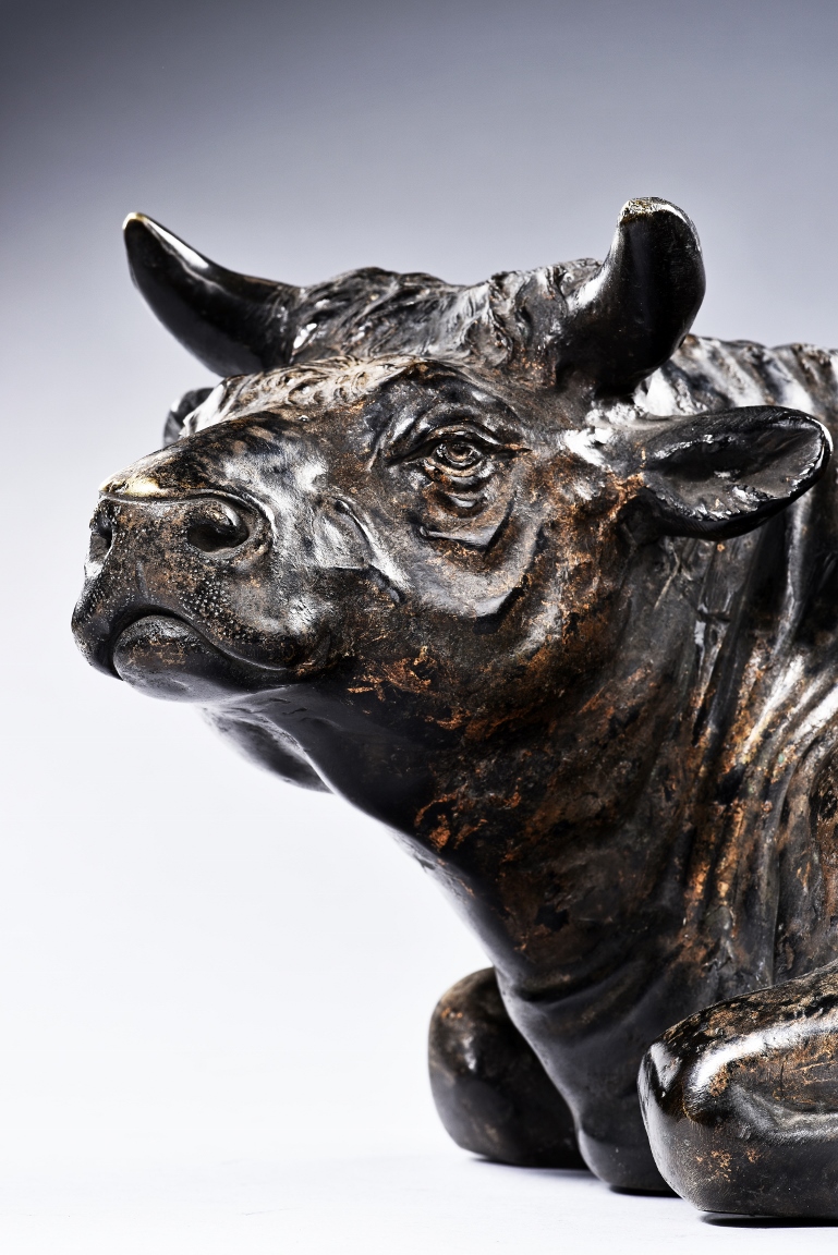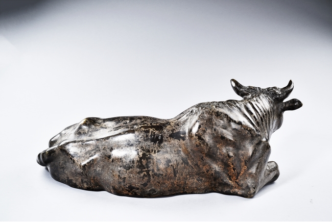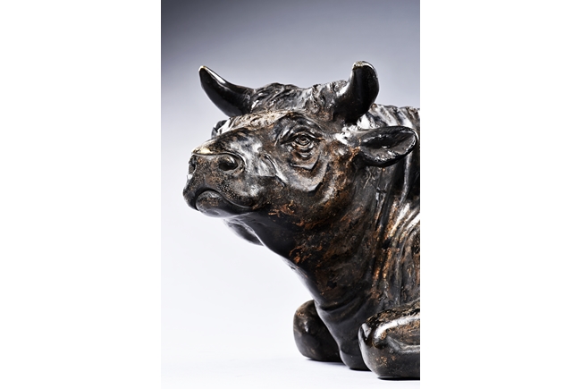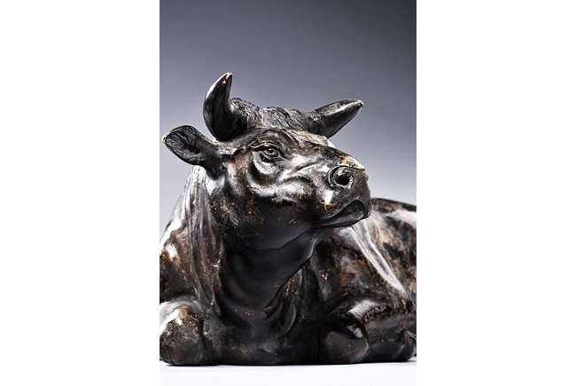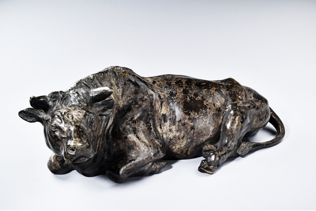 The buffalo is cast realistically in recumbent position with its legs tucked under the body, the head turning slightly to the left, its hair finely detailed with lines, the tail swept over to one side. The base of the statue is cast with four character mark. 18th Century.