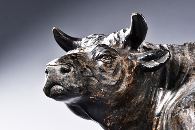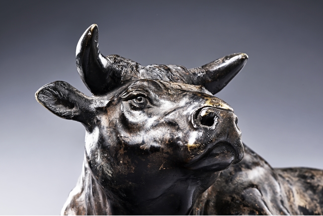 此大銅牛雕刻生動,牛身壯實,銅質堅硬,包漿古樸,身體細節清晰可見,生態亦栩栩如生,充分展現了作者高超的雕刻技巧,亦表現出牛的憨厚和勤勞。此貼金大銅牛包漿皮殼好,因年代久遠,牛身所貼金有很多脫落。有極高的收藏價值。