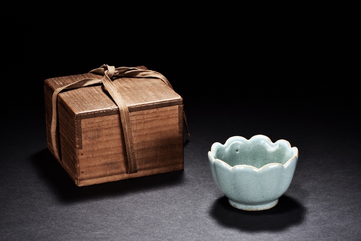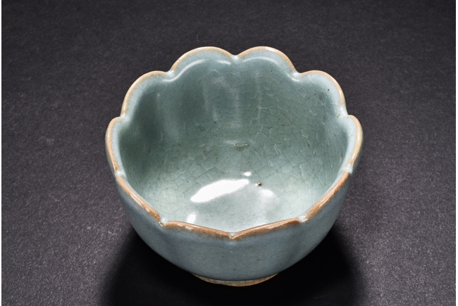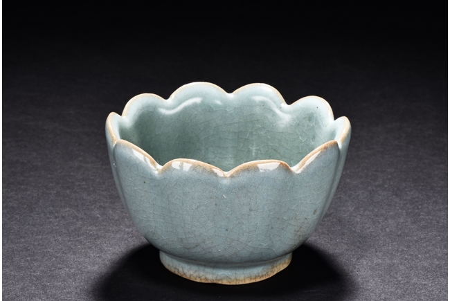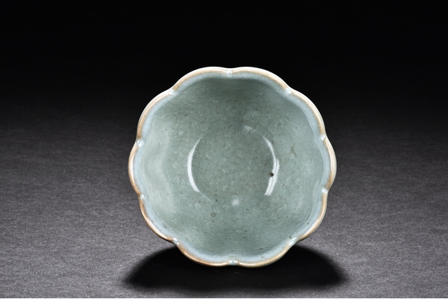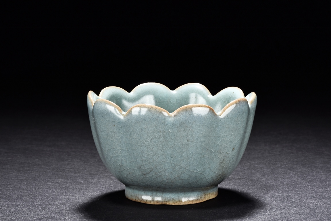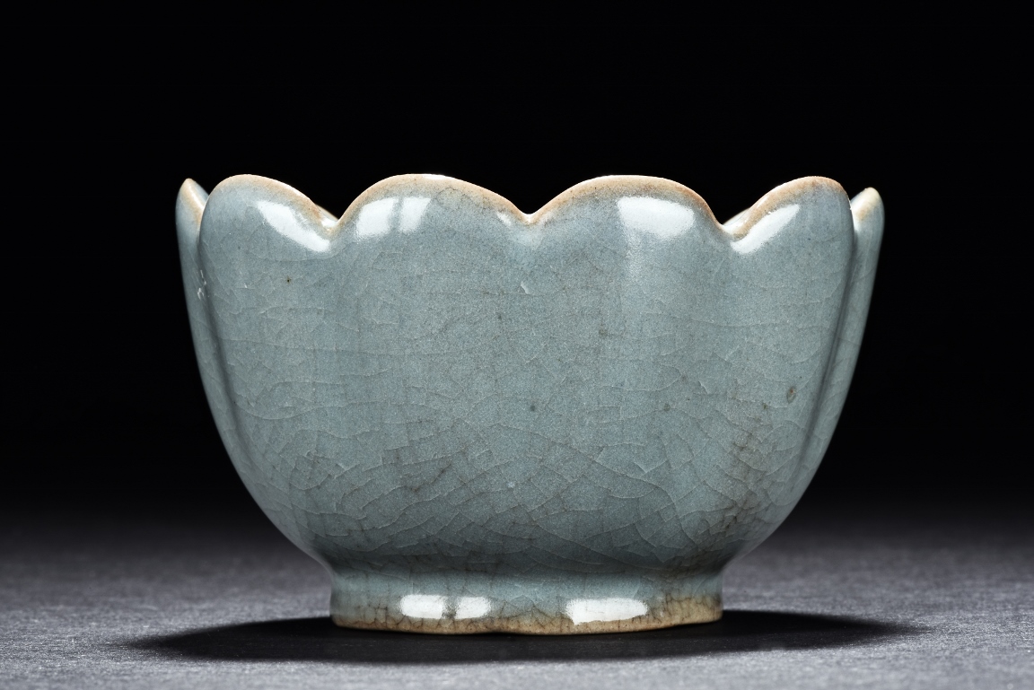 The bowl is of lotus shape of ten lobes. The sides rise gently to the rims. It is overall covered in soft blue tone with fine cracklings. Accompanied with a Japanese wood box. Qing Dynasty period.