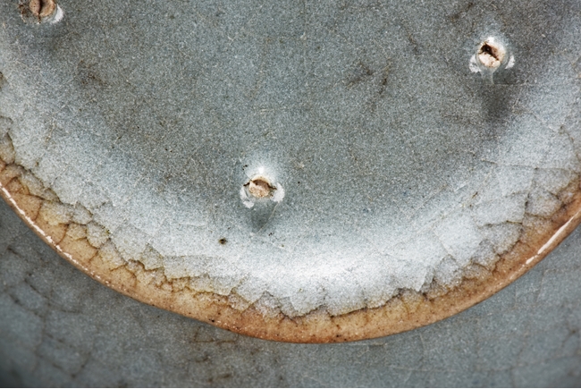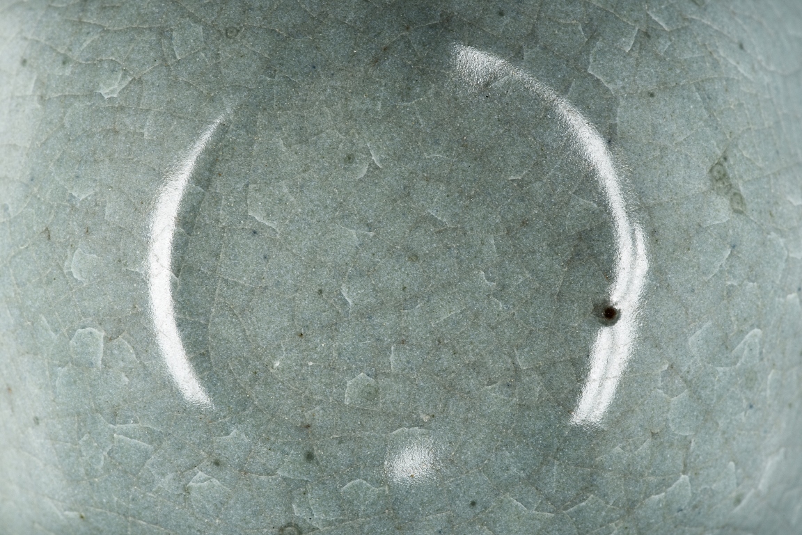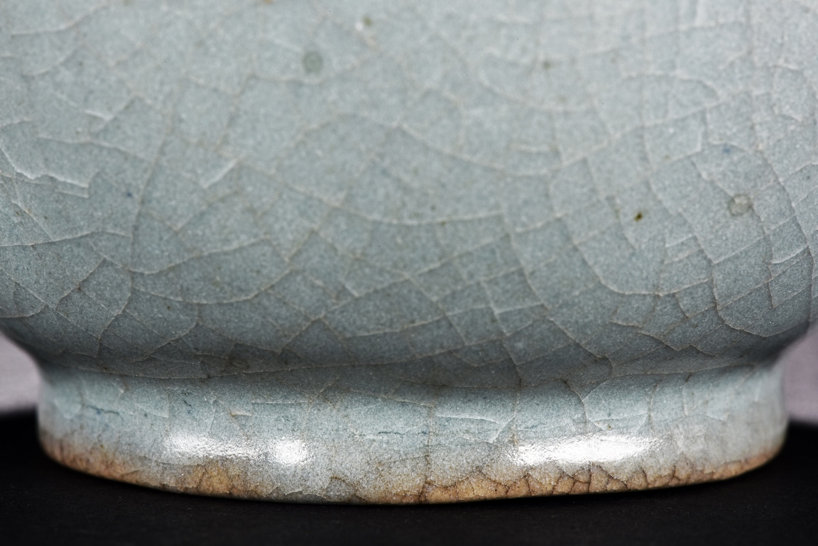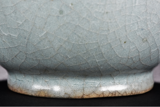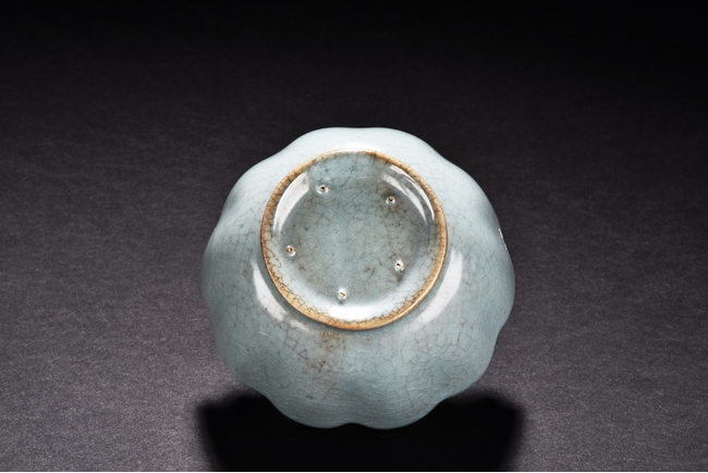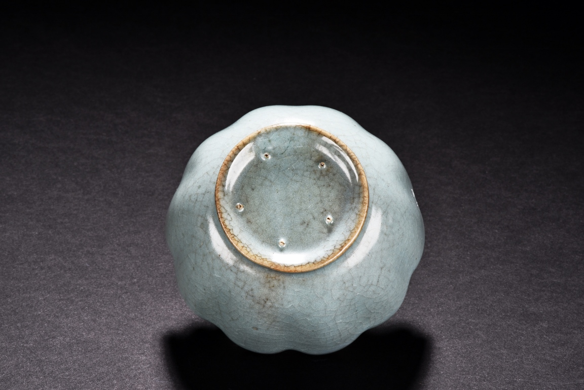 The bowl is of lotus shape of ten lobes. The sides rise gently to the rims. It is overall covered in soft blue tone with fine cracklings. Accompanied with a Japanese wood box. Qing Dynasty period.