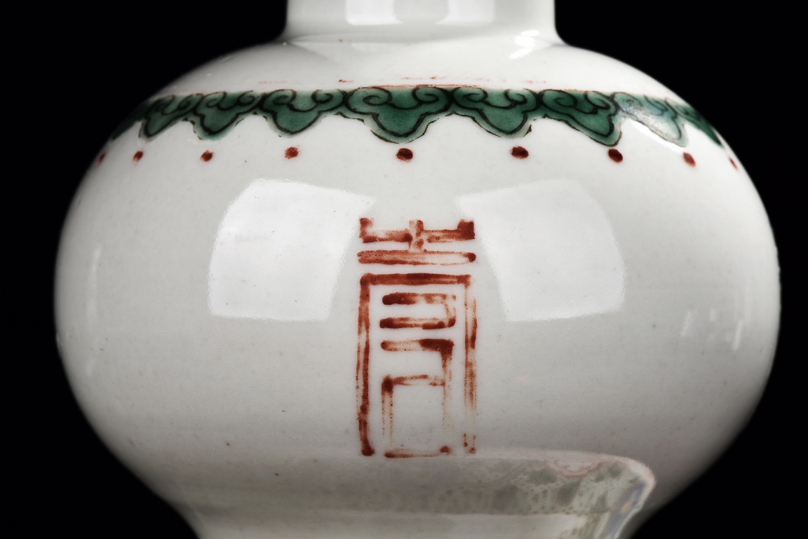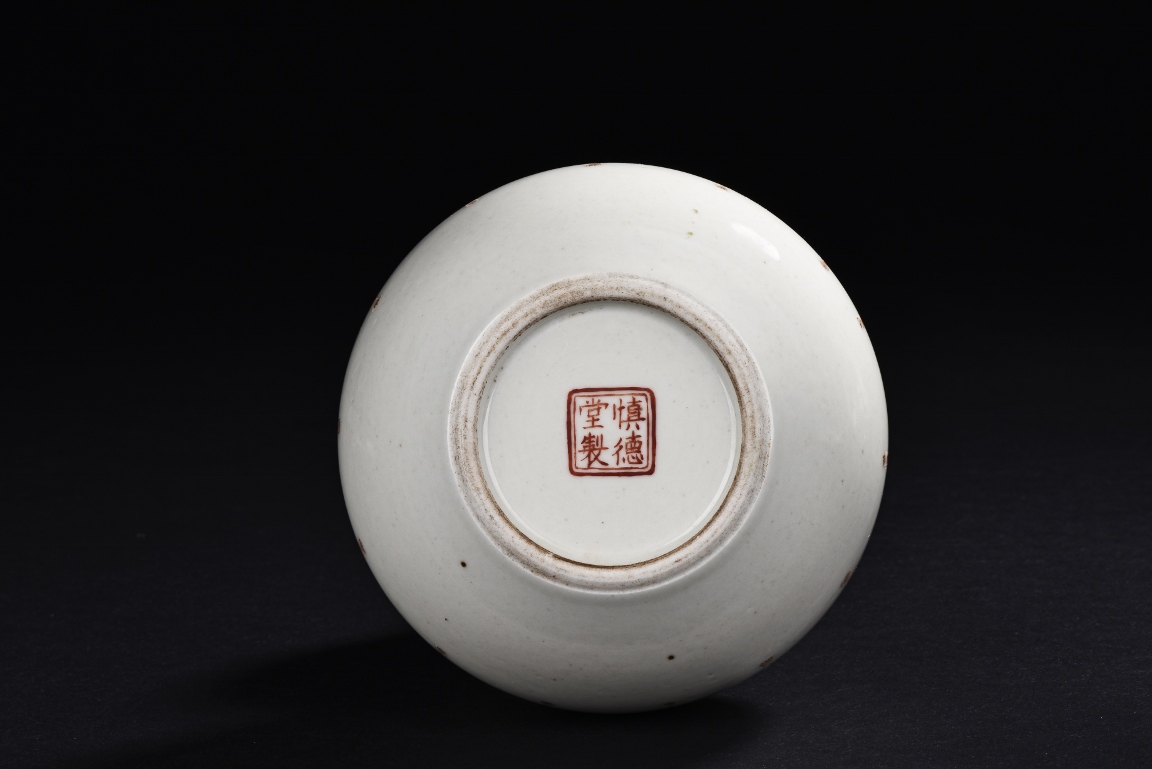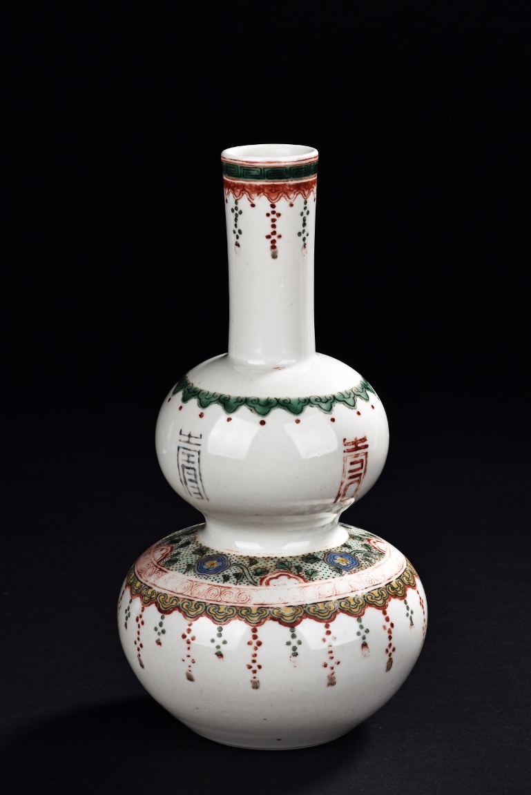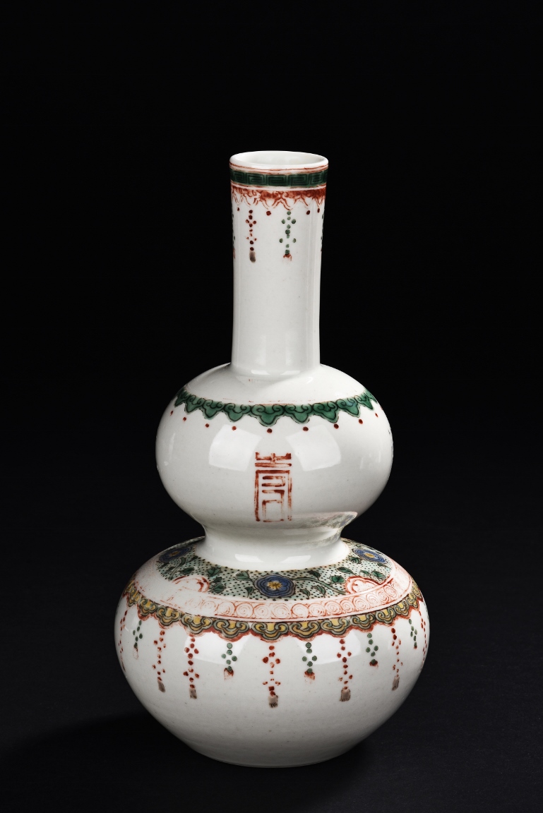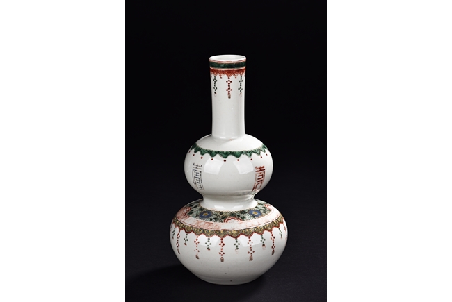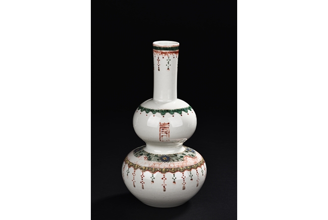 Of double gourd shape, the vase is enamelled with ruyi and scrolling motif bands, the upper gourd decorated with stylized shou characters, the neck is painted with a band of ruyi motif. The bottom bears a four character 'Shen De Tang Zhi' mark. Qing Dynasty period.