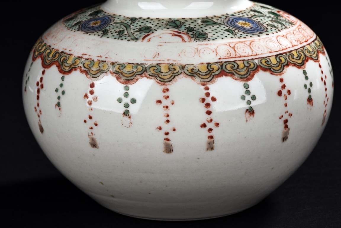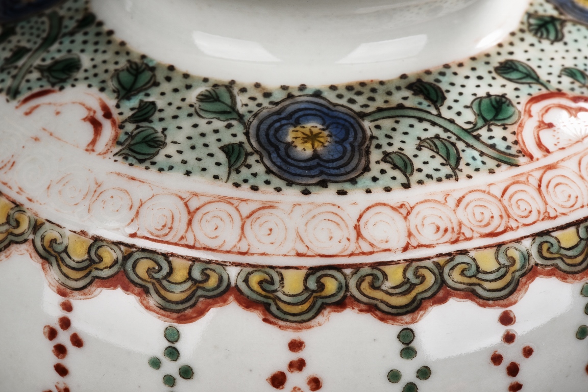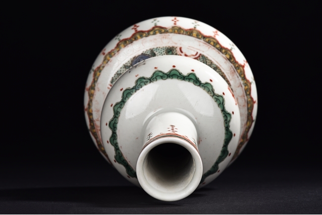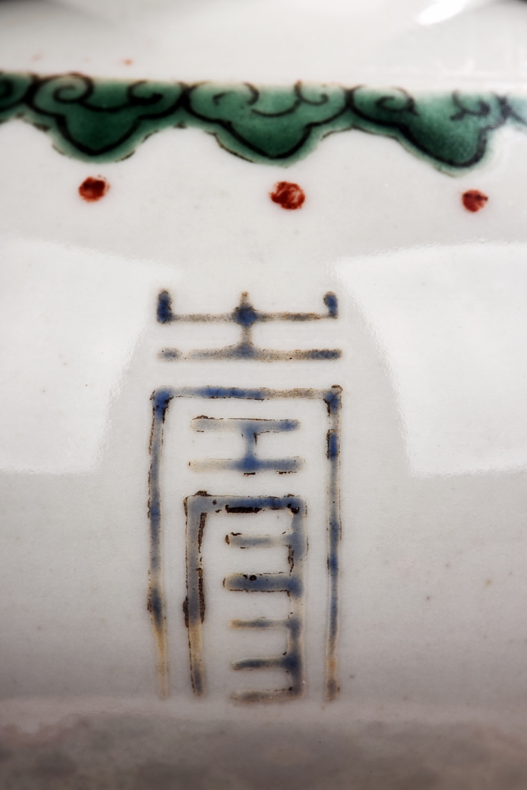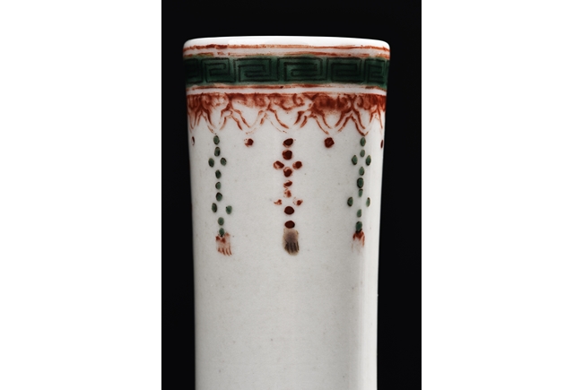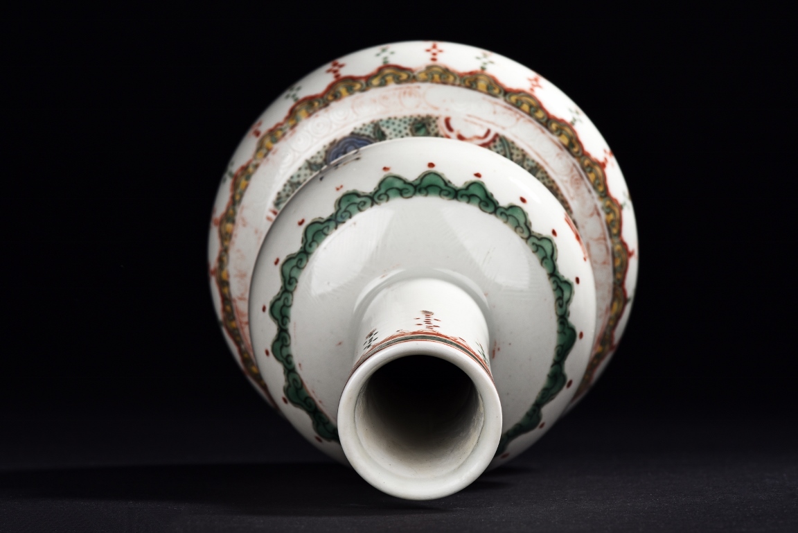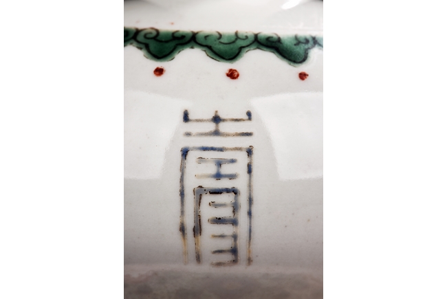 Of double gourd shape, the vase is enamelled with ruyi and scrolling motif bands, the upper gourd decorated with stylized shou characters, the neck is painted with a band of ruyi motif. The bottom bears a four character 'Shen De Tang Zhi' mark. Qing Dynasty period.