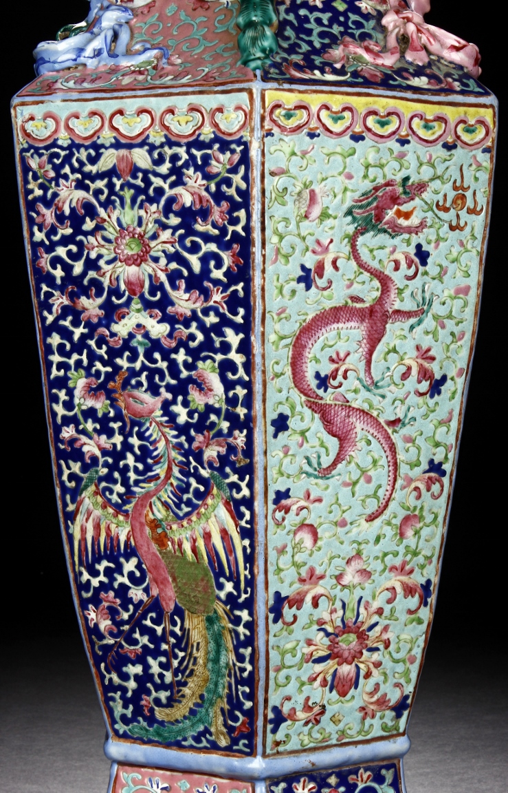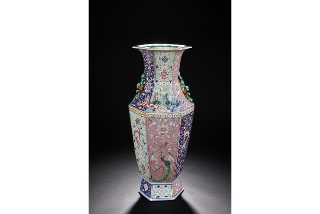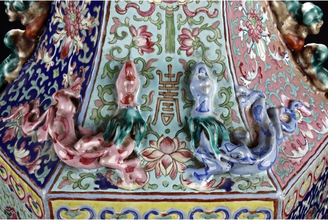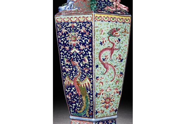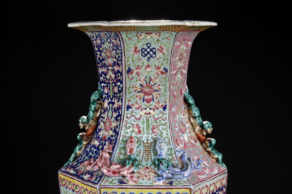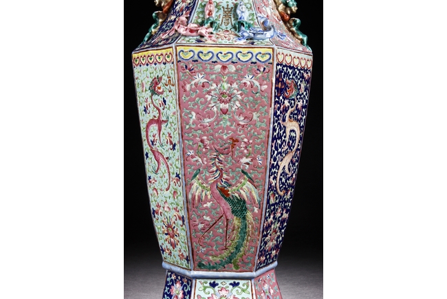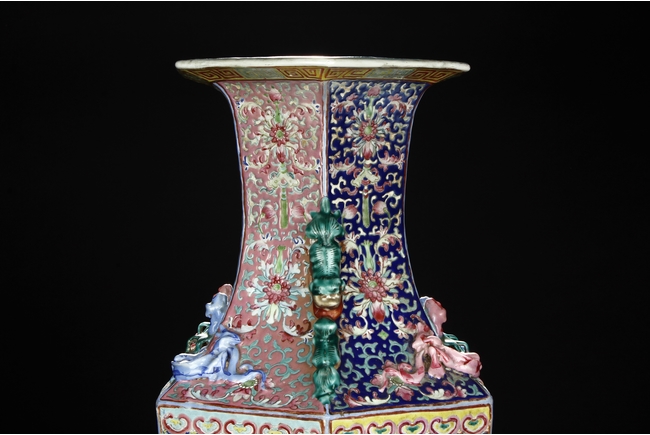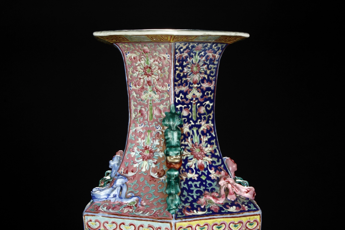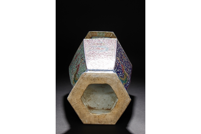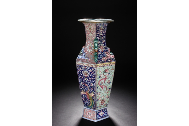 The body is of hexagonal shape with six panels, each of alternating blue, turquoise, and red ground with dragon, phoenix motif. The neck carved with chilong mythical beasts to exterior. The interior of neck is enamlled with three auspicious bats reserved on turquoise ground. Qing Dynasty period.