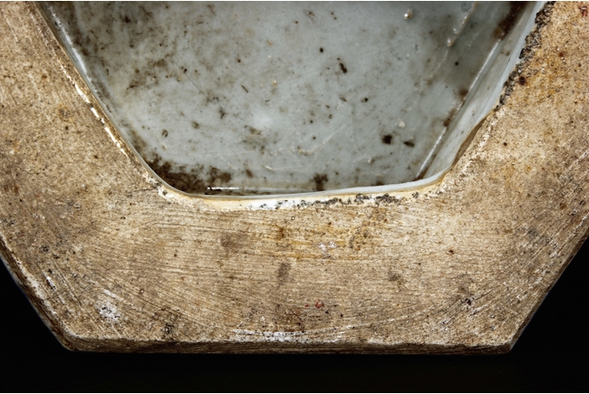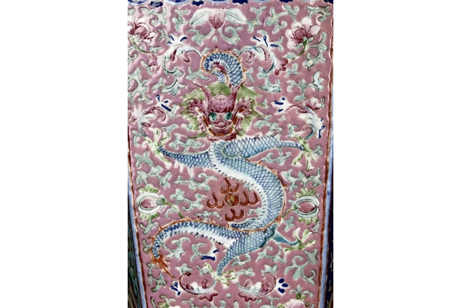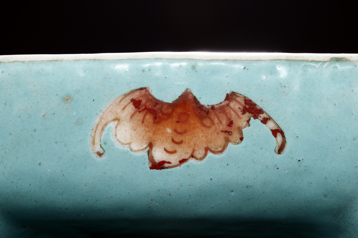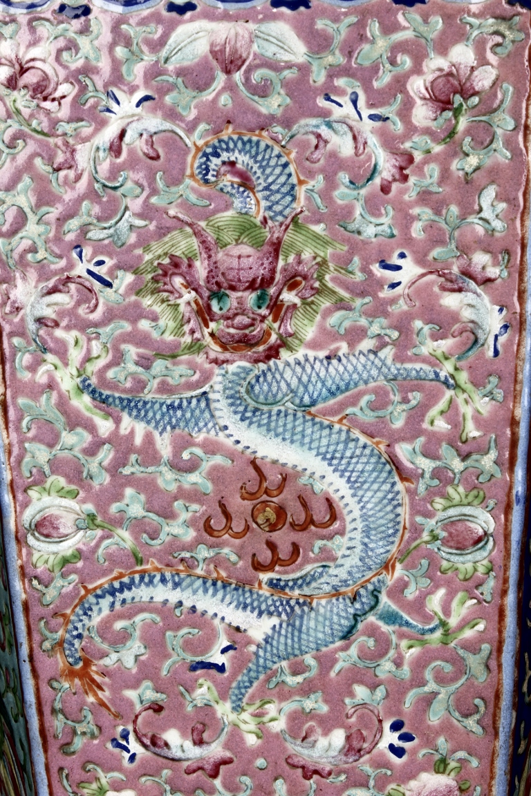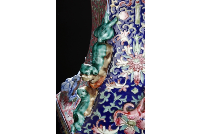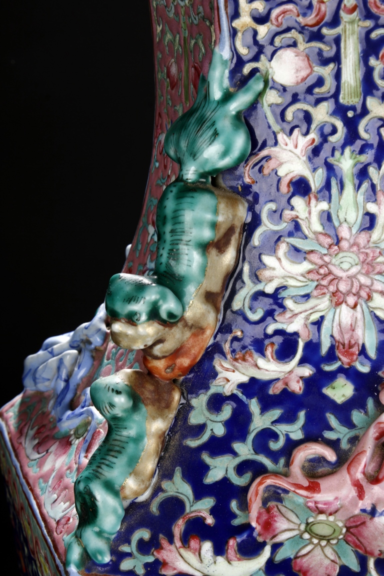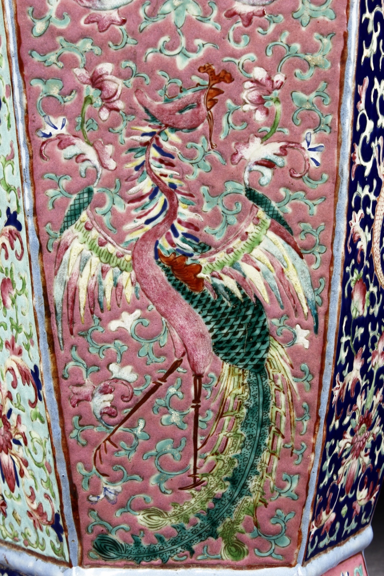 The body is of hexagonal shape with six panels, each of alternating blue, turquoise, and red ground with dragon, phoenix motif. The neck carved with chilong mythical beasts to exterior. The interior of neck is enamlled with three auspicious bats reserved on turquoise ground. Qing Dynasty period.