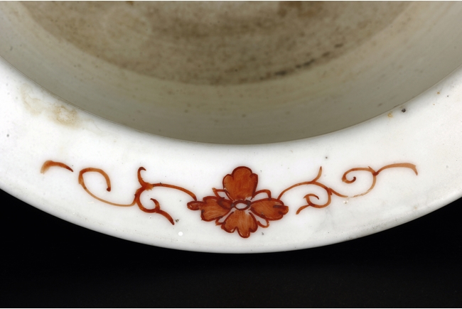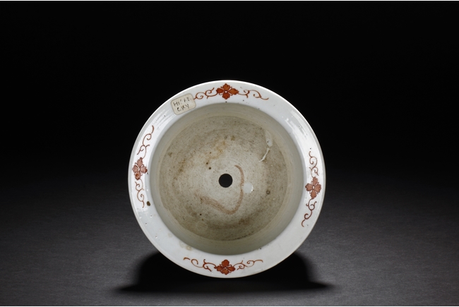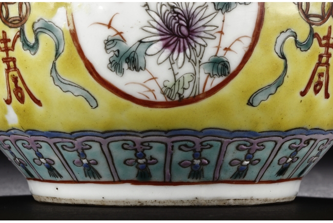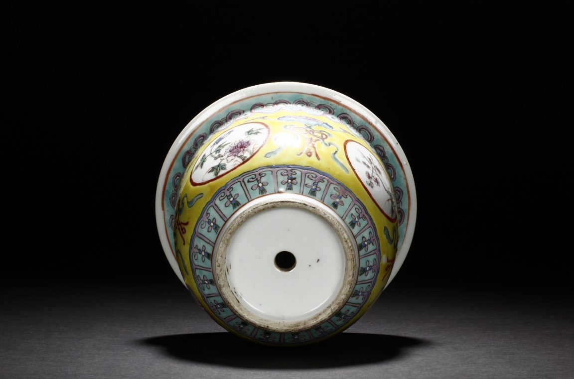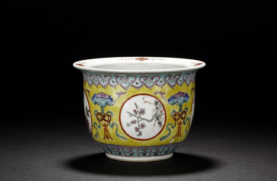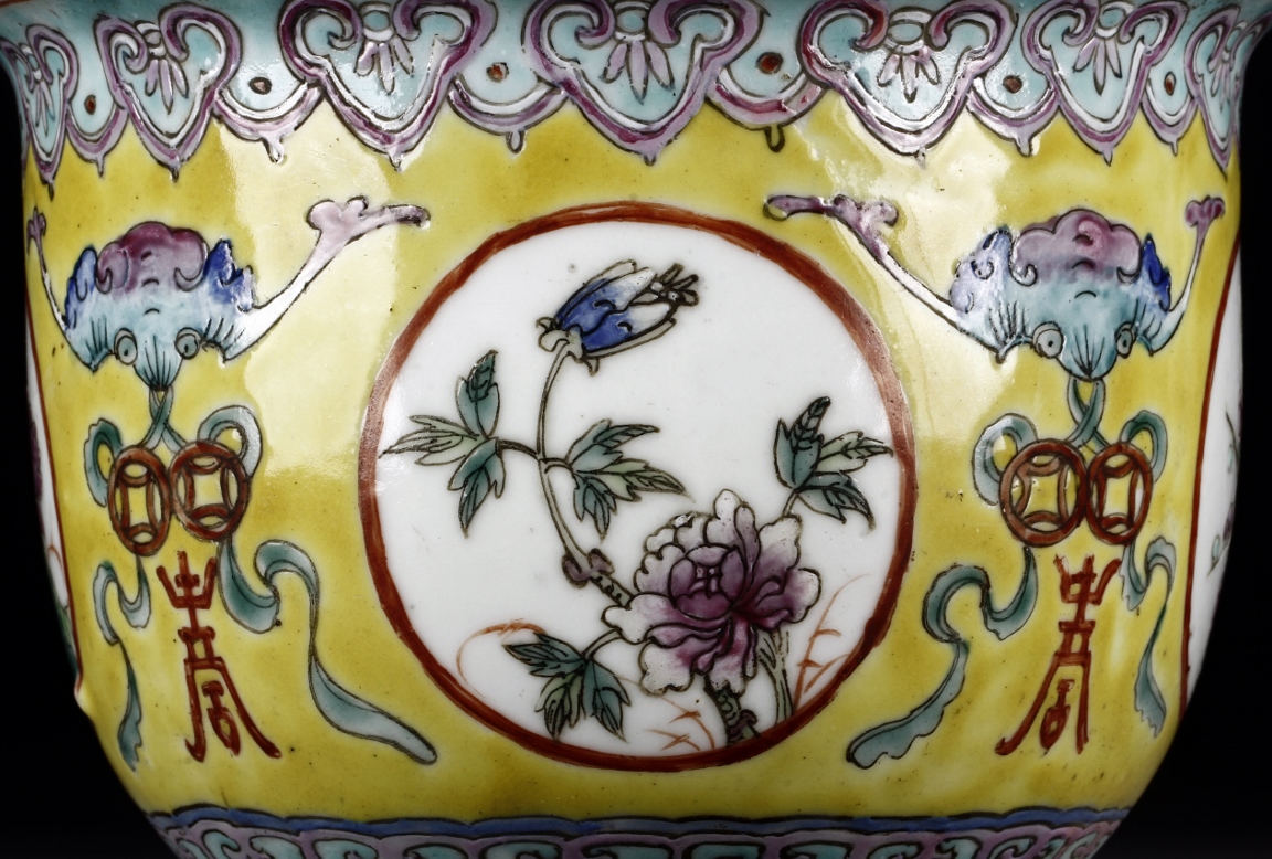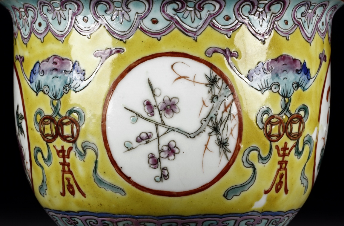 The jardiniere is decorated with four roundel panel, each enclosing lotus, chrysanthemum, plum, and peony, all flanked by auspicious bat with longetivity character reserved on yellow ground below ruyi-shaped band around neck.