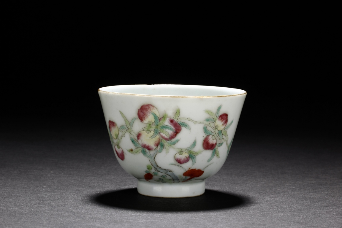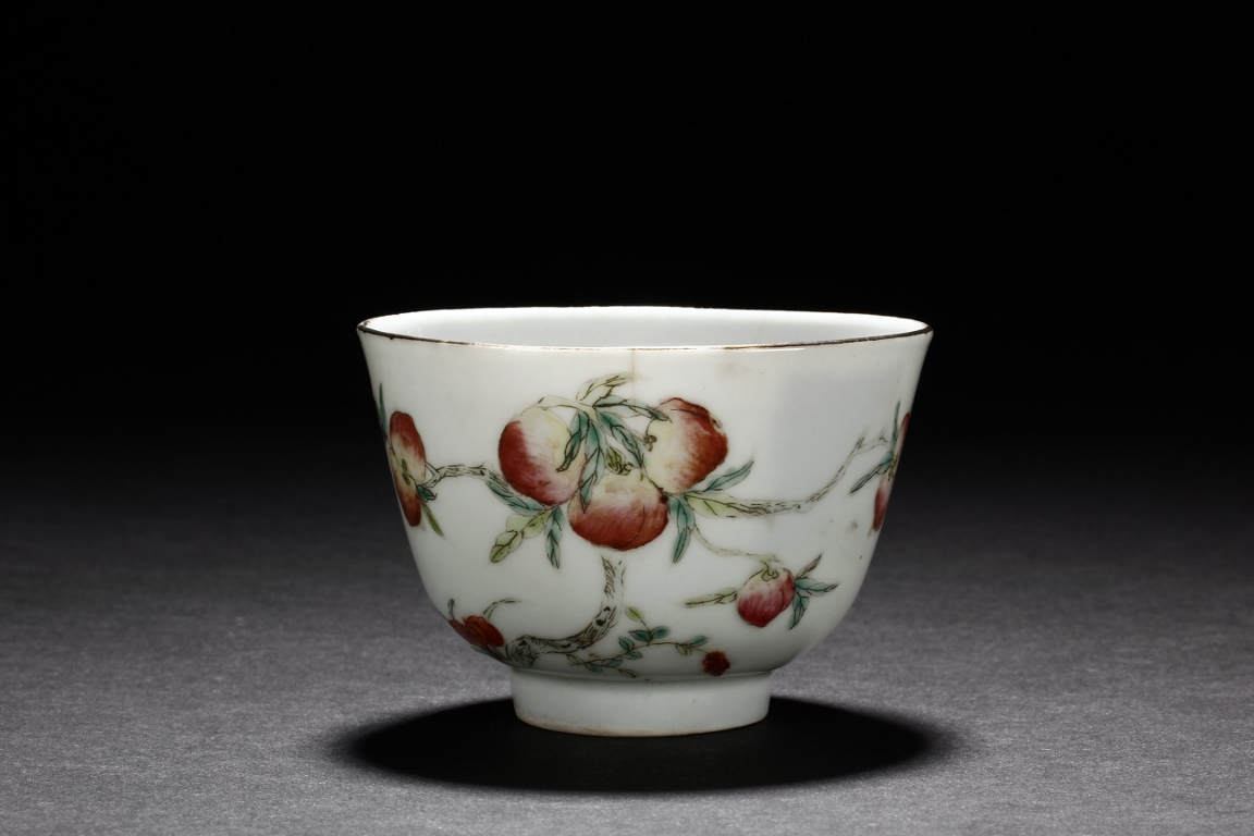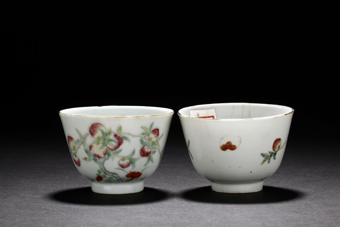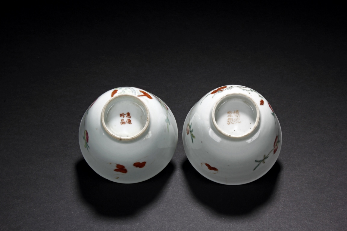 Each cup is thinly potted with steep sides rising to a flared rim, and is decorated with nine peaches growing on branches, with two flying bats on oppsite side. One bears a four character 'Shen De Tang Zhi' mark, the other bears a four character 'Hui Tong Zhen Pin' mark. Republic period.