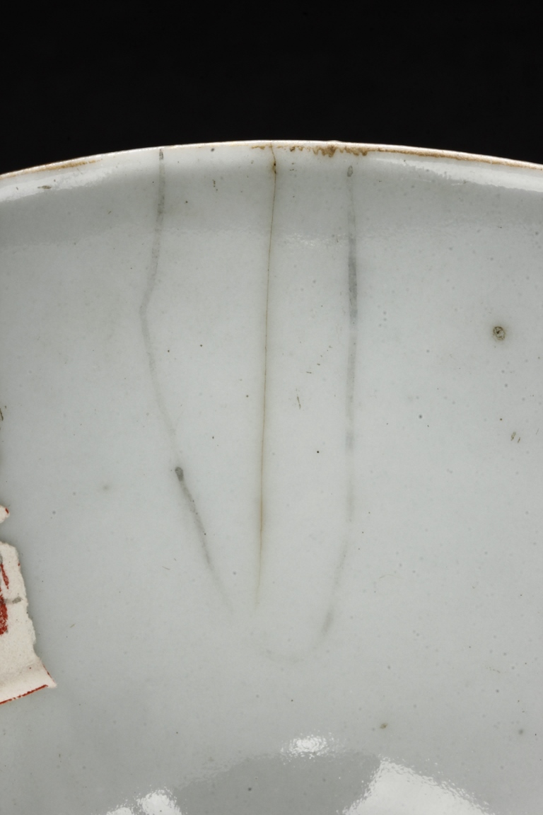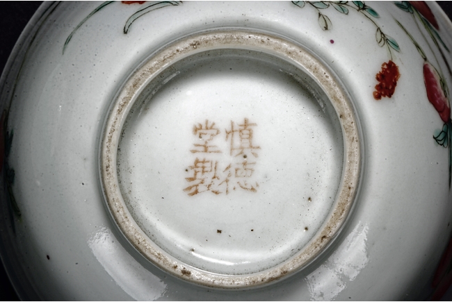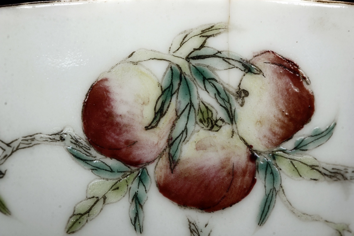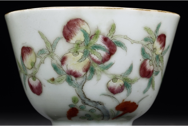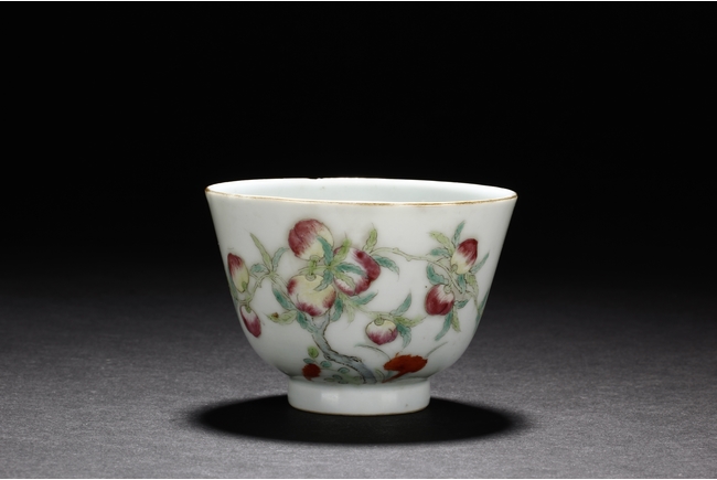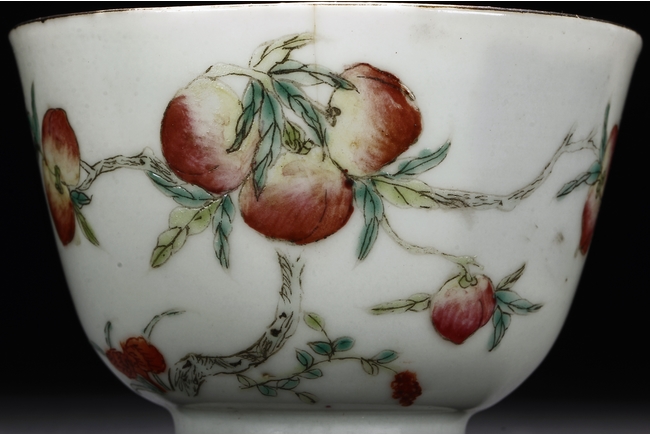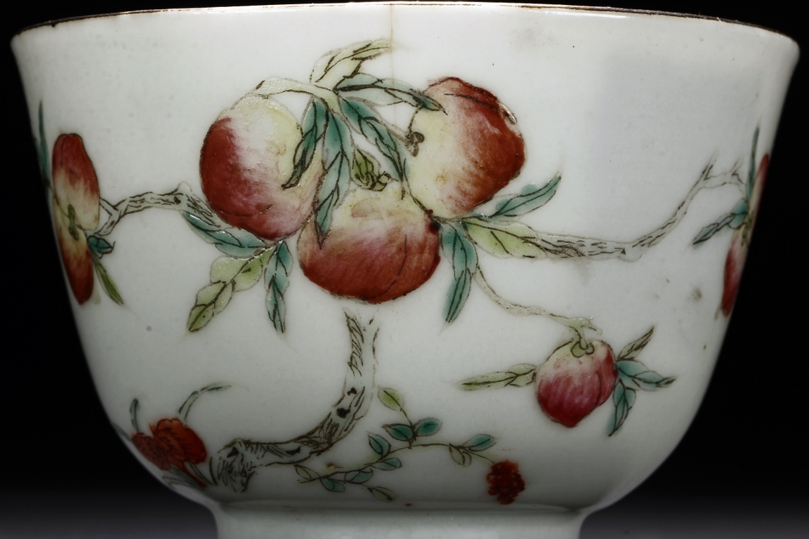 Each cup is thinly potted with steep sides rising to a flared rim, and is decorated with nine peaches growing on branches, with two flying bats on oppsite side. One bears a four character 'Shen De Tang Zhi' mark, the other bears a four character 'Hui Tong Zhen Pin' mark. Republic period.