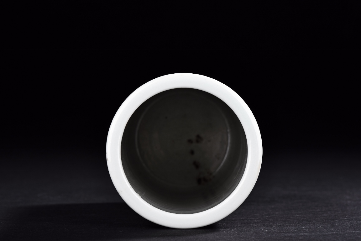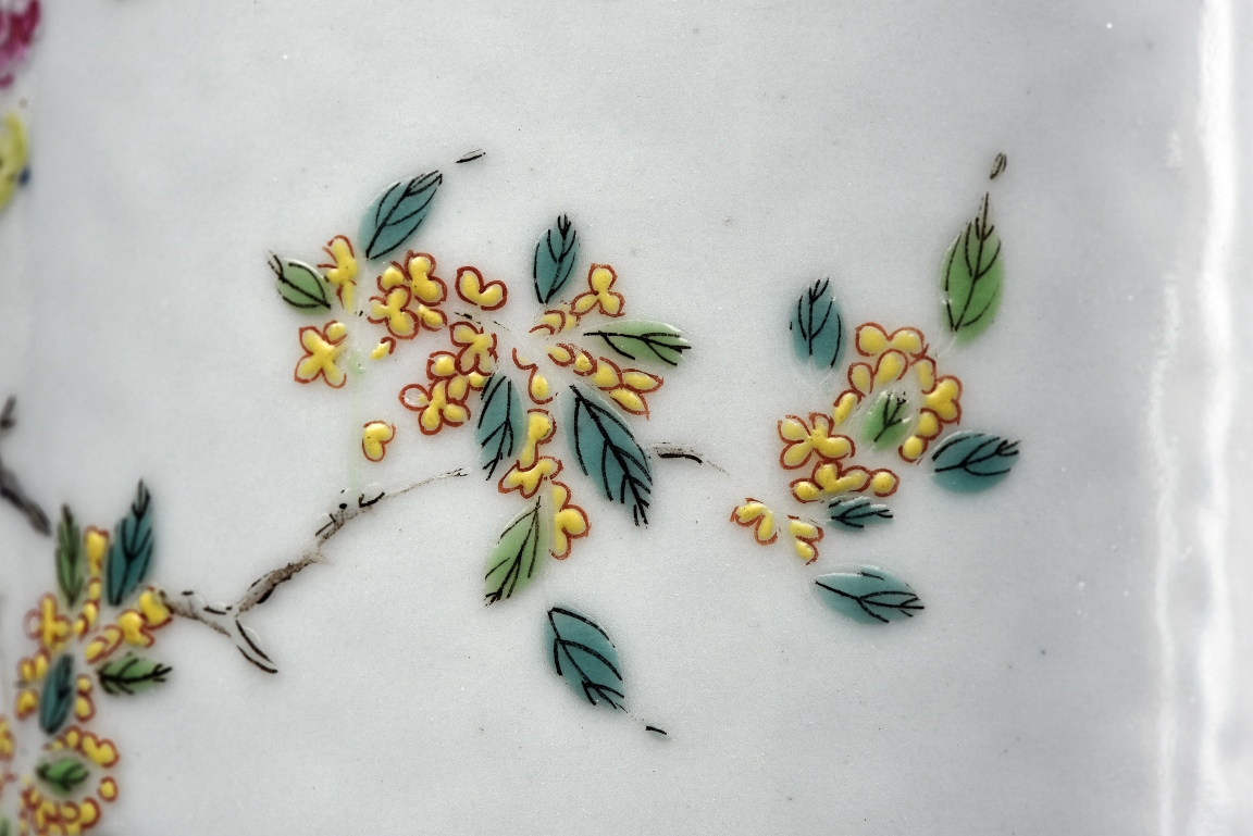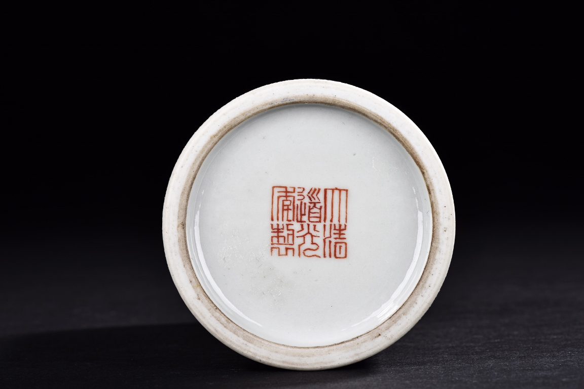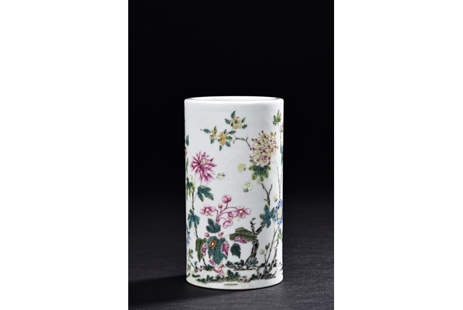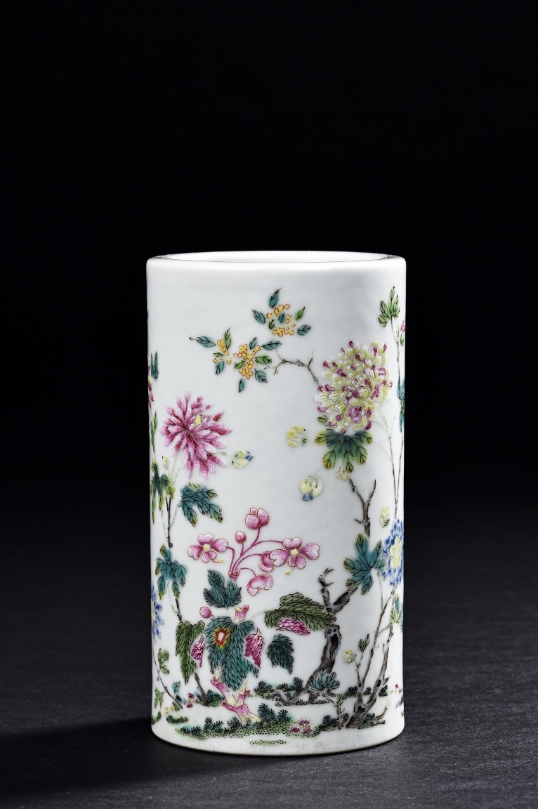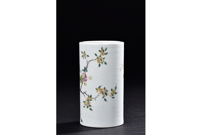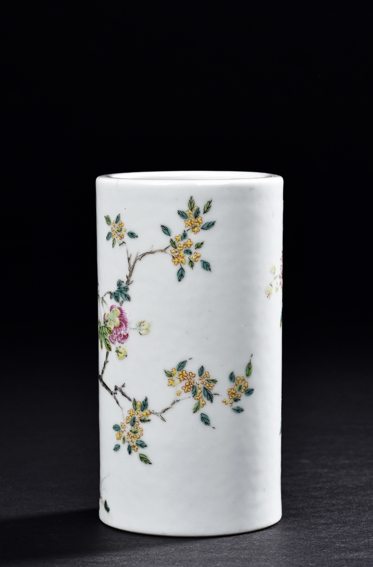 A small sized brush pot with enamel paintings of flowering branches, and the base bears a six characters "DAOGUANG" mark. Qing Dynasty period.