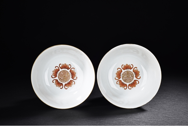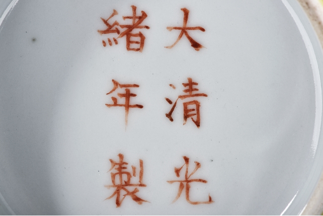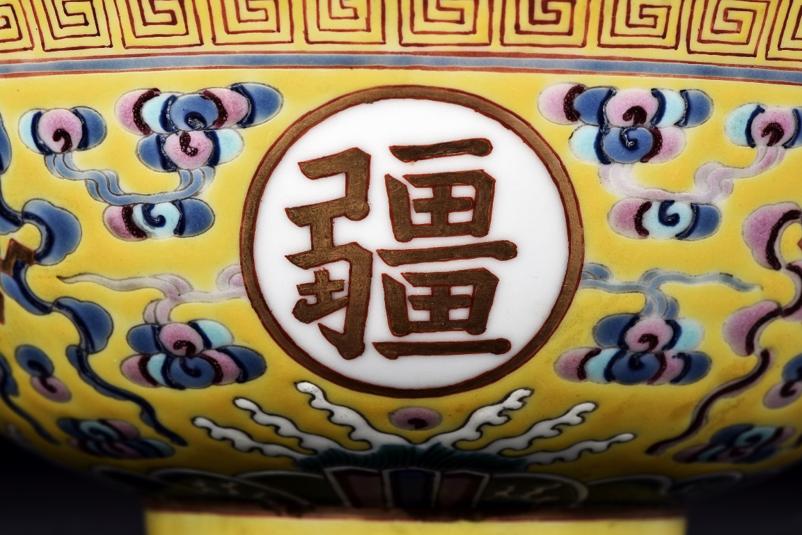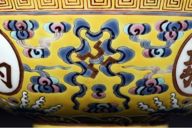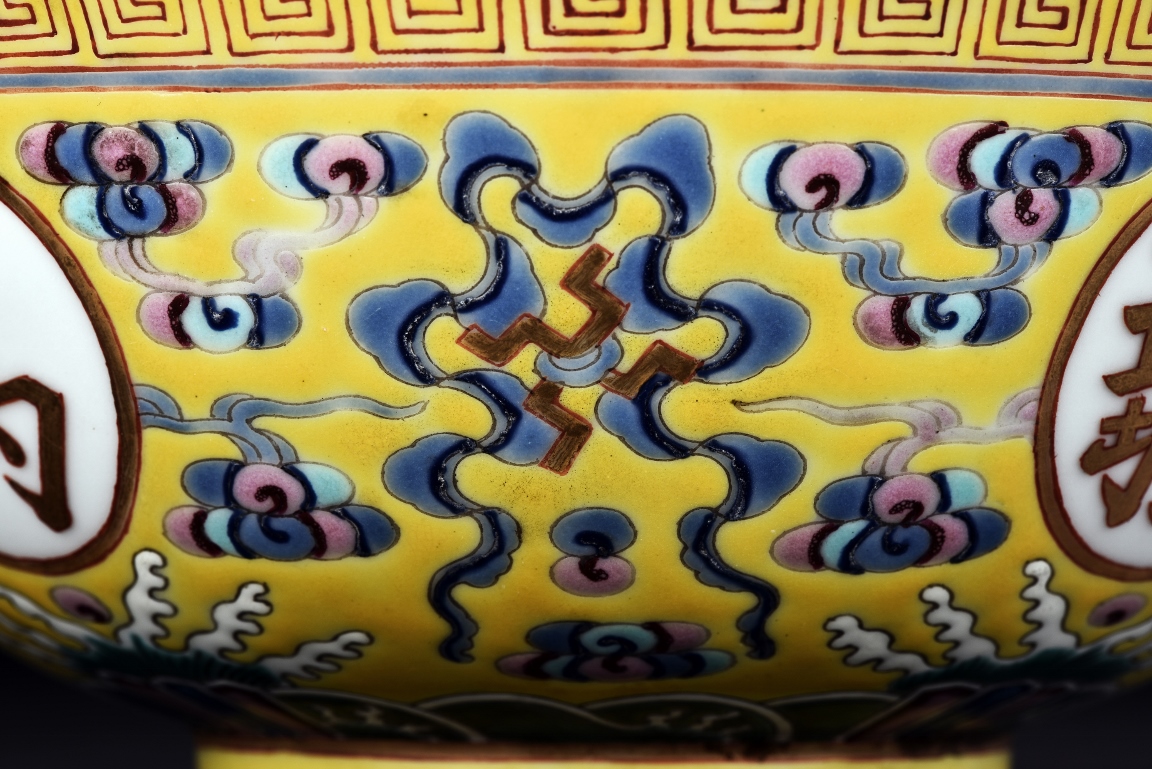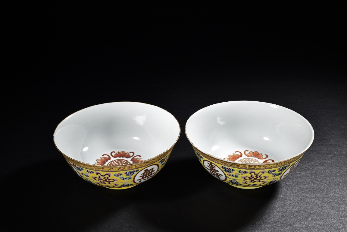 A pair of well potted bowl with enamel designs of four characters "WAN SHOU WU JIANG", celebrating longevity. The bowl is covered in yellow ground, leiwen patterns at the rim. The base bears a six character "GUANGXU" mark. Qing Dynasty period.