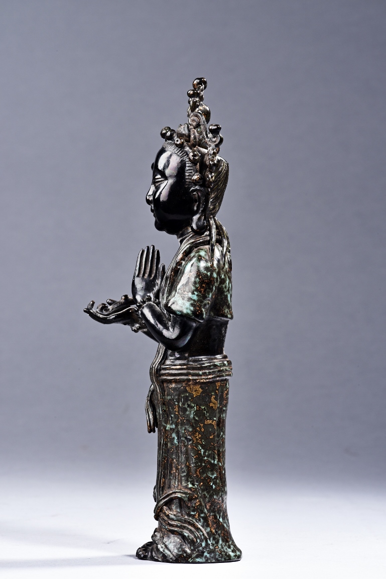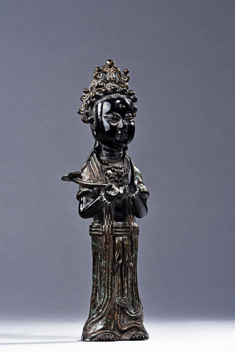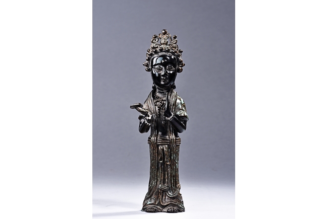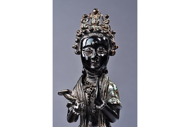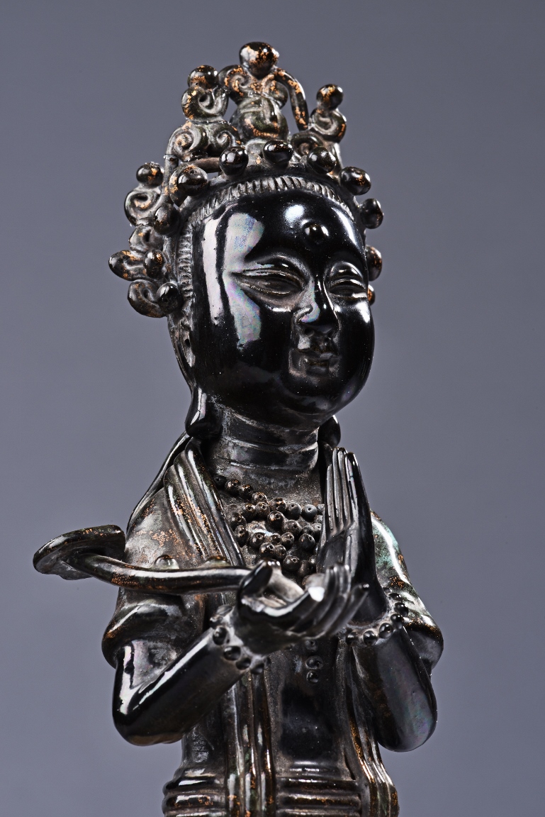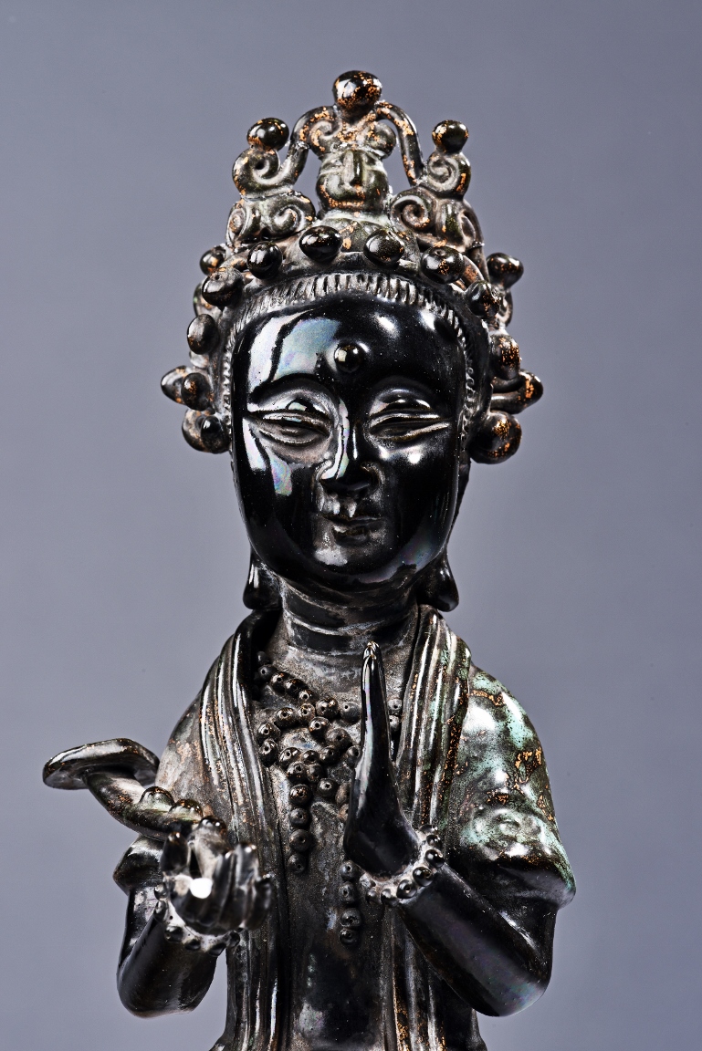 The bodhisattva is shown standing, wearing long loose robe and holding a ruyi on right hand, the face with benevolent expression, all glazed in black. (hand has repair). Qing Dynasty period.