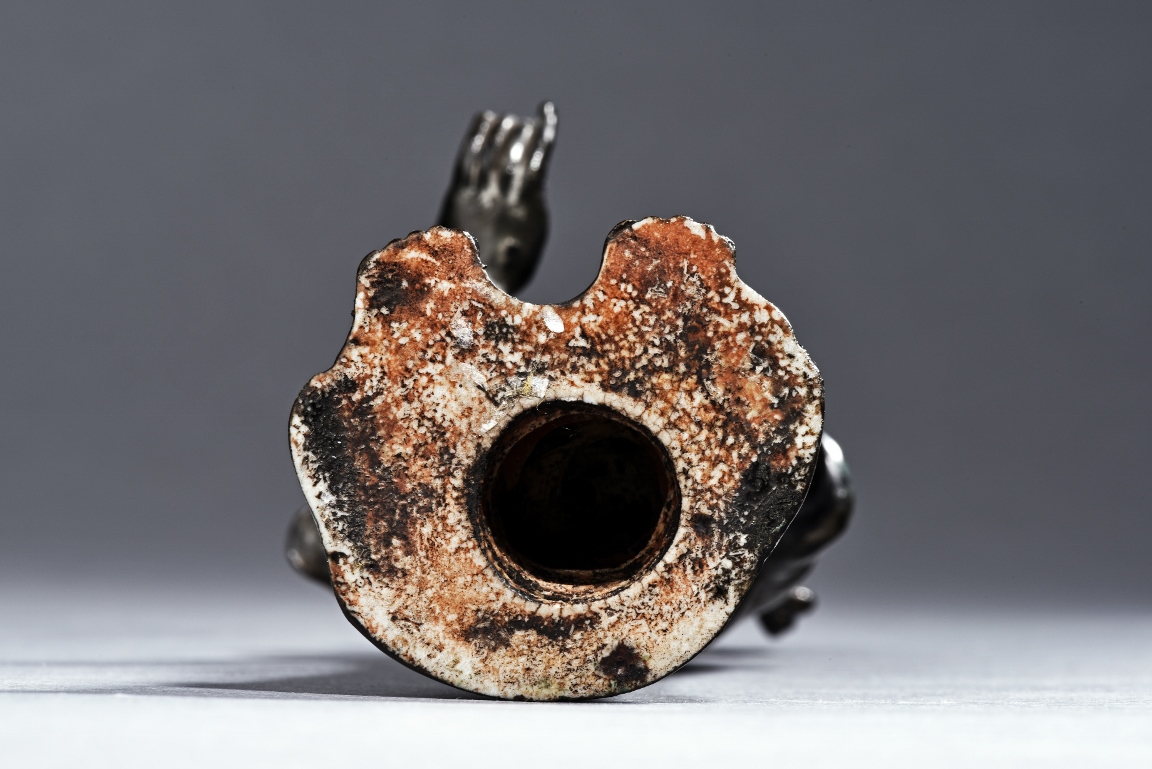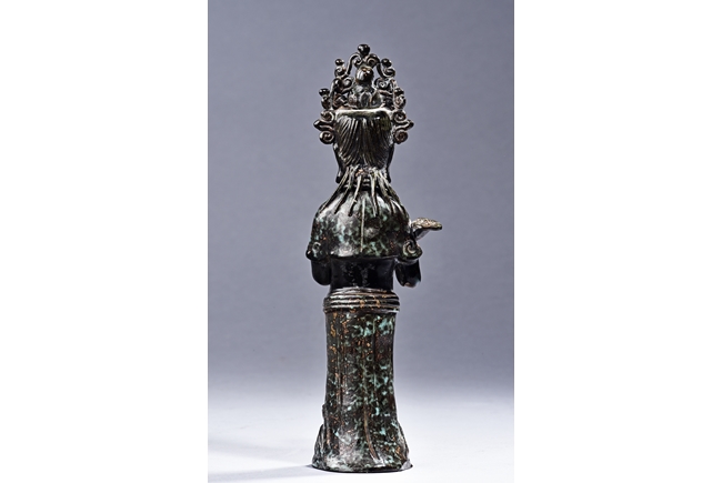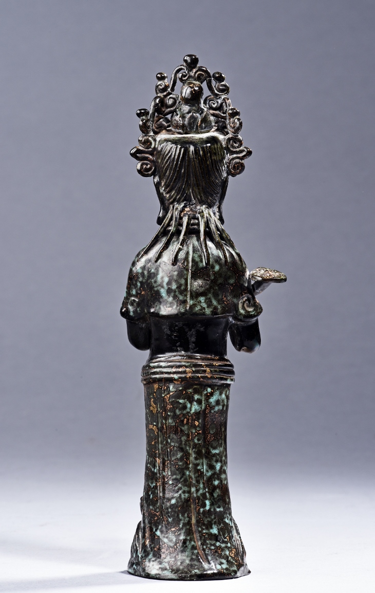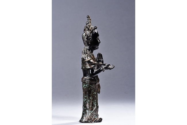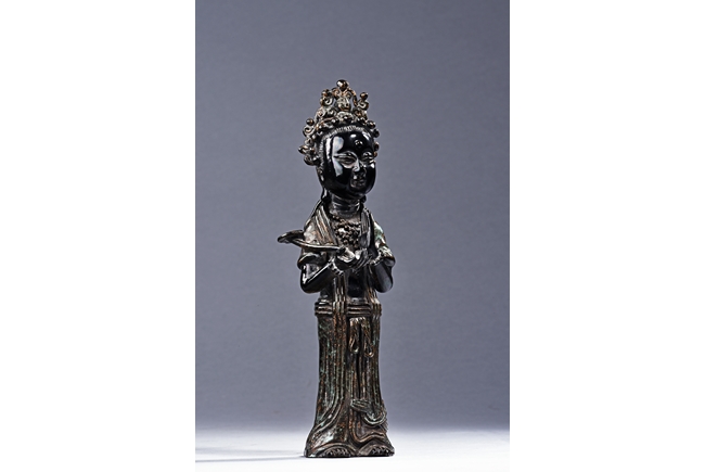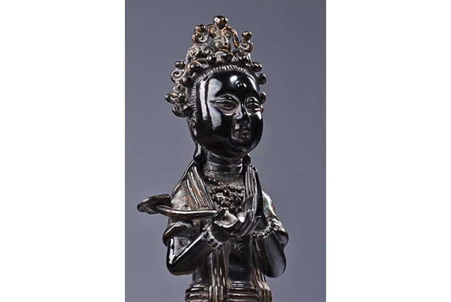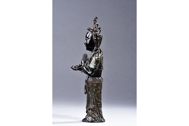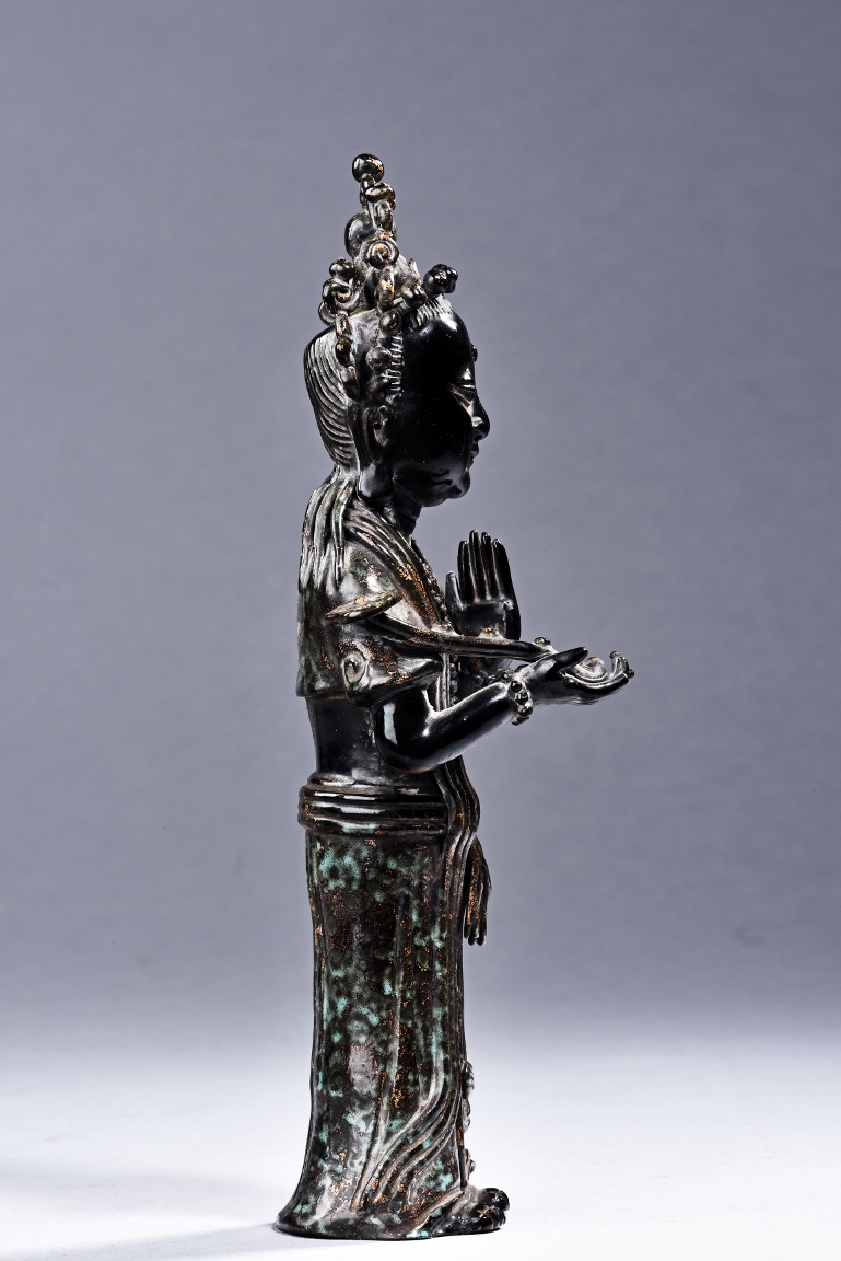 The bodhisattva is shown standing, wearing long loose robe and holding a ruyi on right hand, the face with benevolent expression, all glazed in black. (hand has repair). Qing Dynasty period.