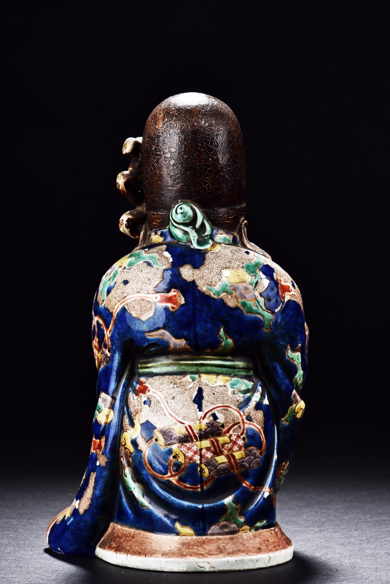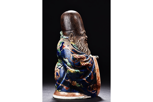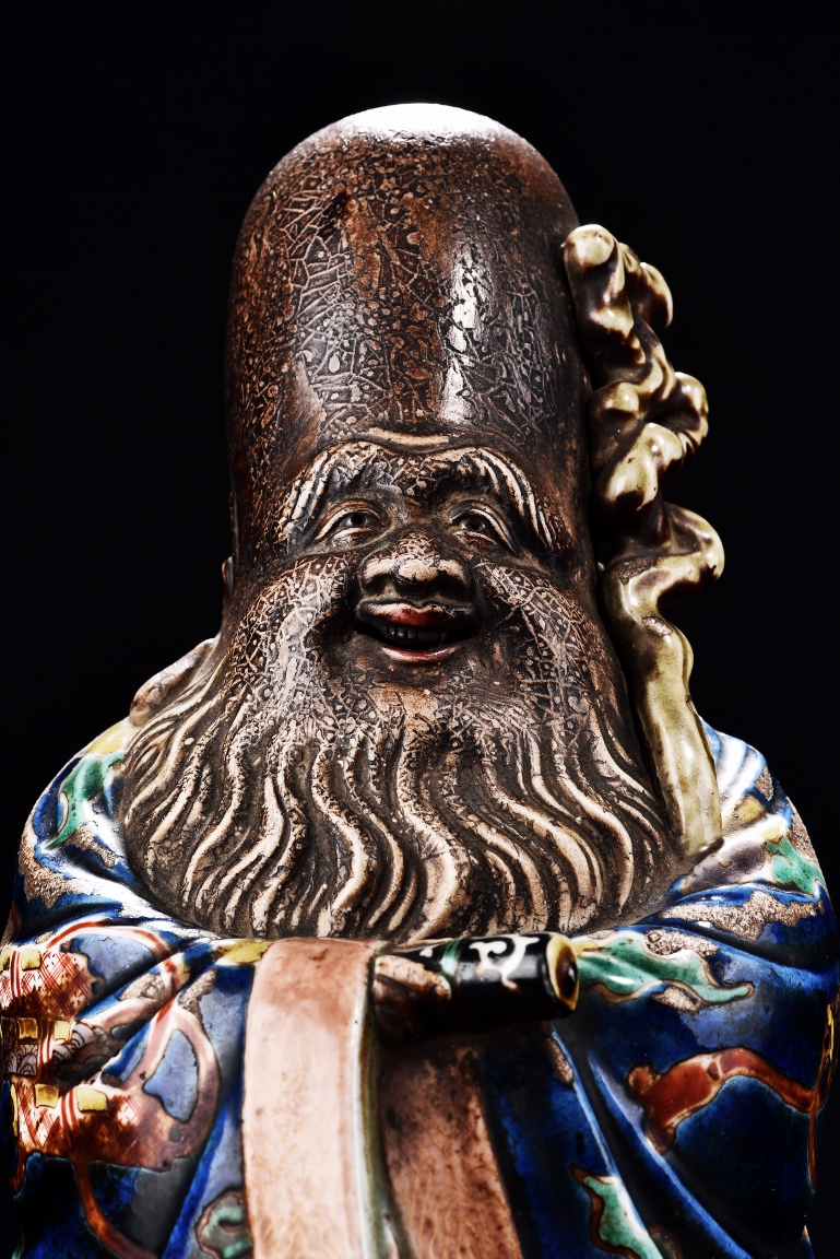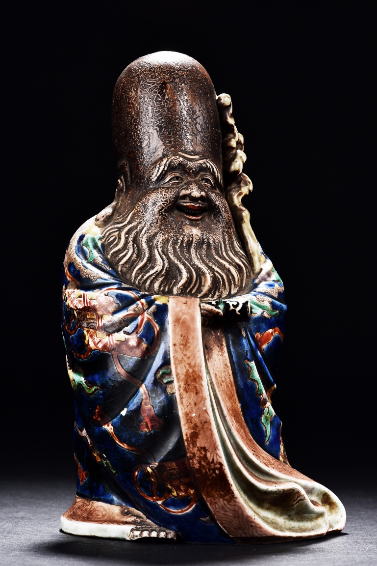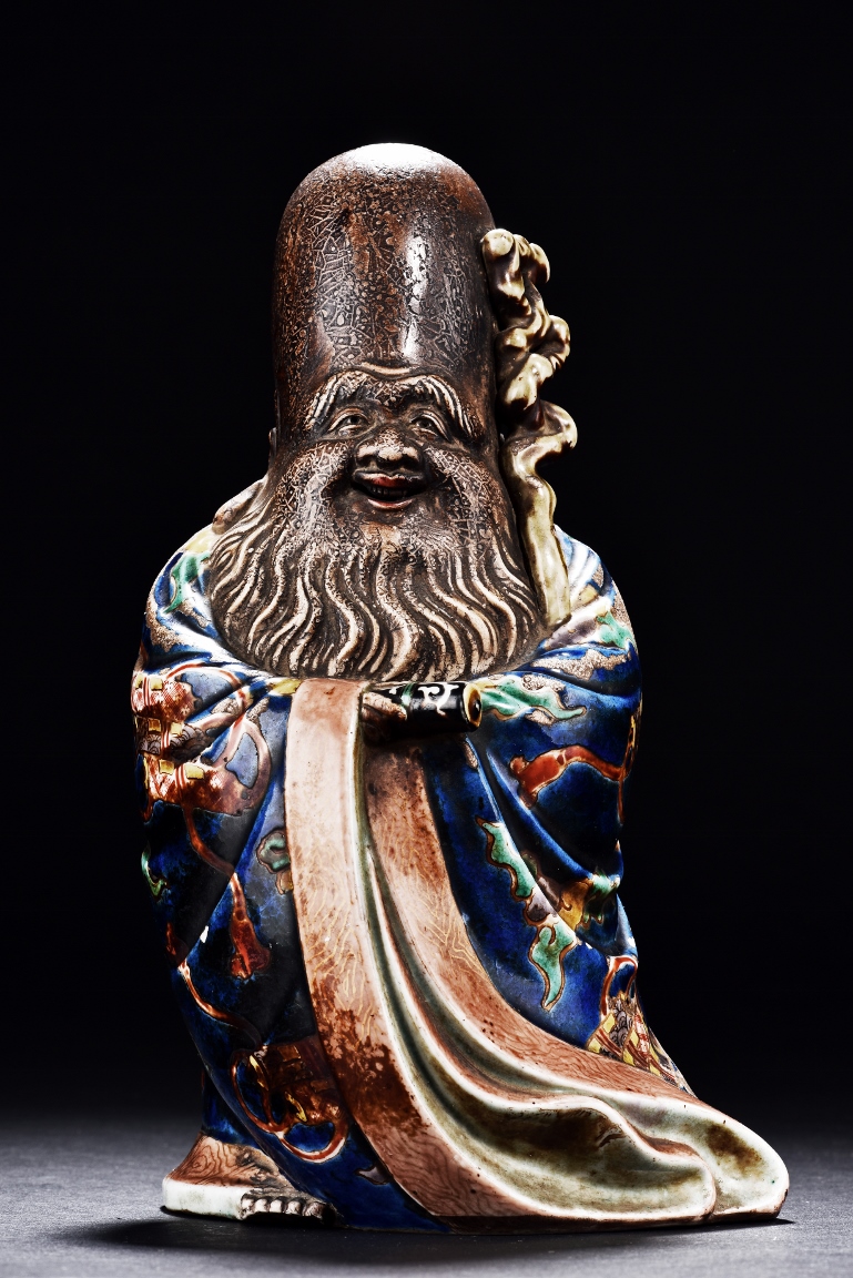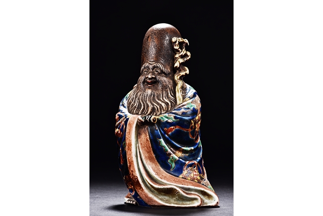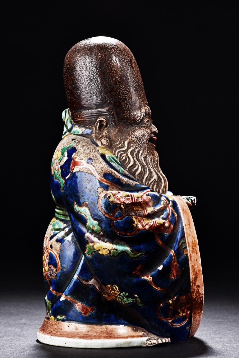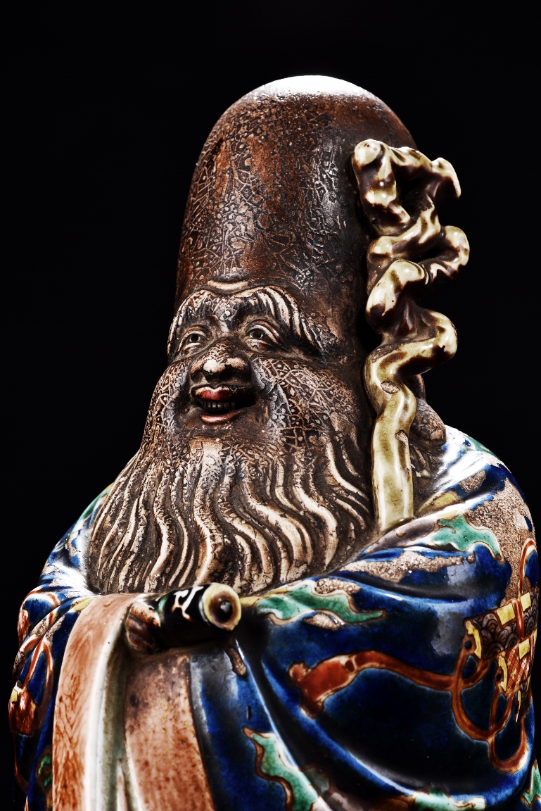 The immortal is modelled wearing a long and loose robe, enamelled with scroll motif and auspicious clouds in blue, green, yellow and red glaze. With a high and domed forehead, his face is shown with a joyful and benevolent expression, the beard detailed with incised lines. Qing Dynasty period.