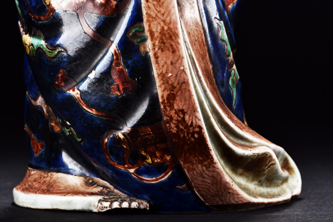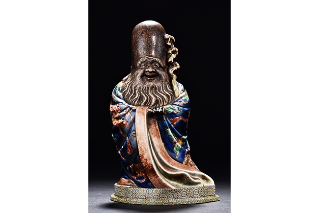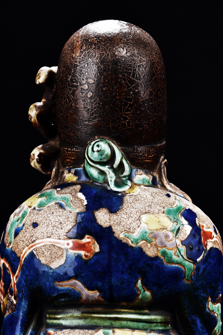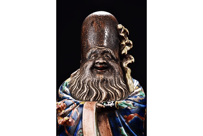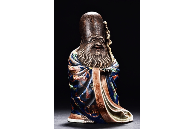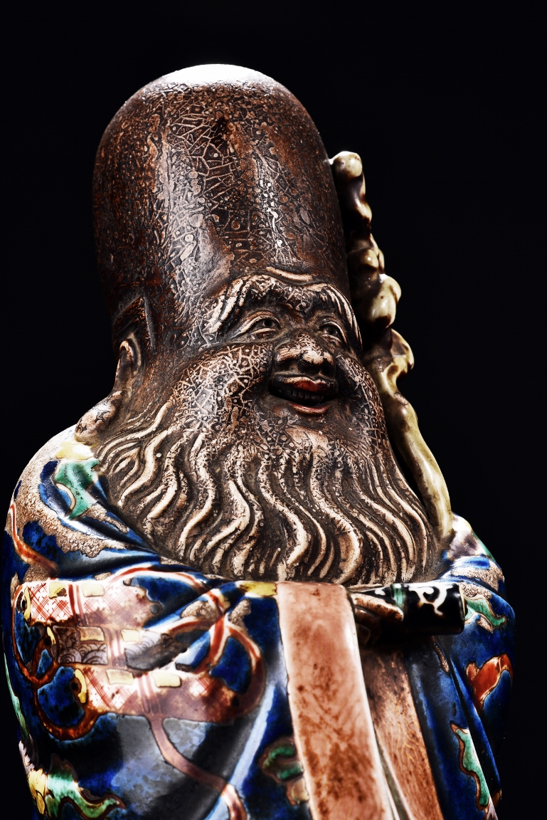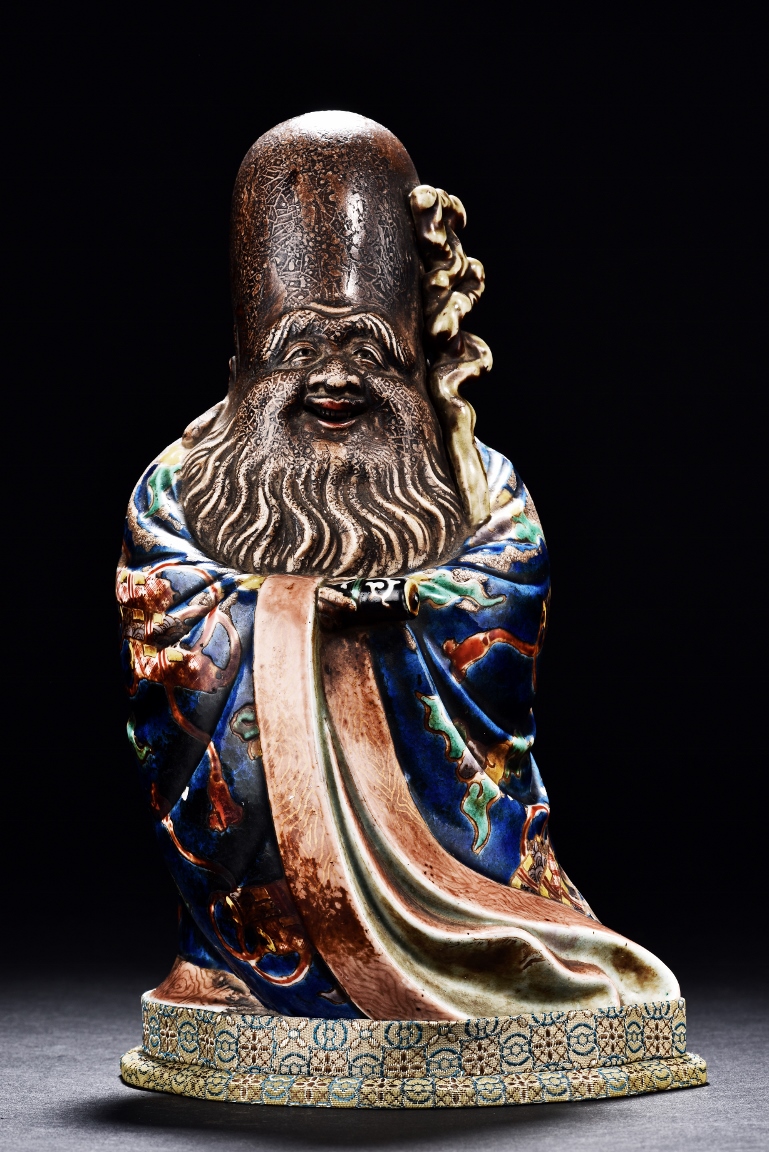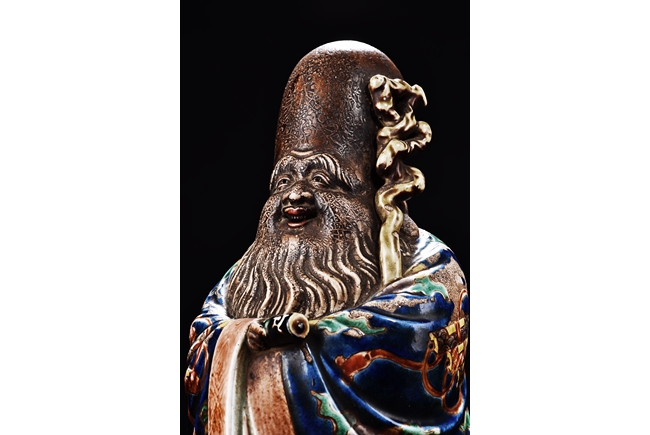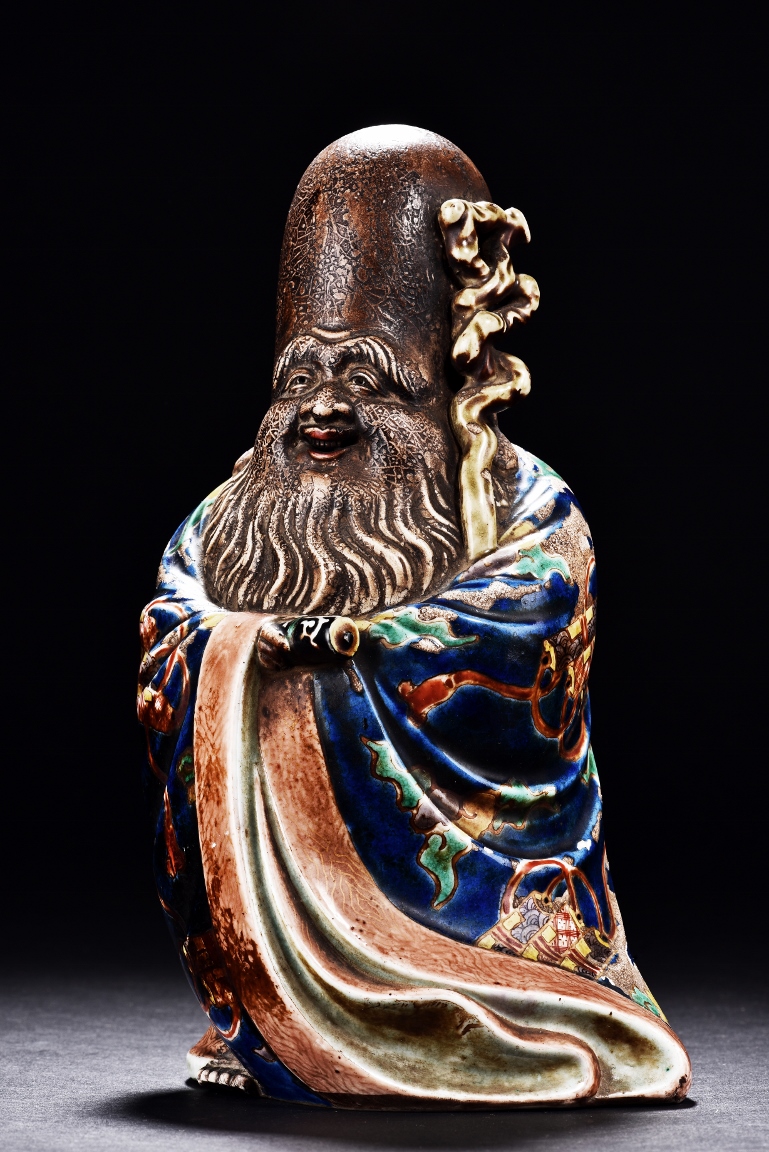 The immortal is modelled wearing a long and loose robe, enamelled with scroll motif and auspicious clouds in blue, green, yellow and red glaze. With a high and domed forehead, his face is shown with a joyful and benevolent expression, the beard detailed with incised lines. Qing Dynasty period.