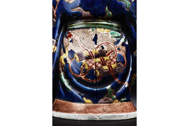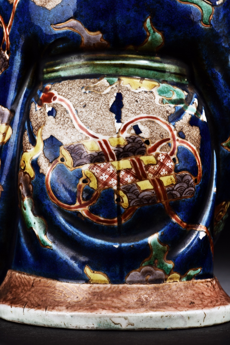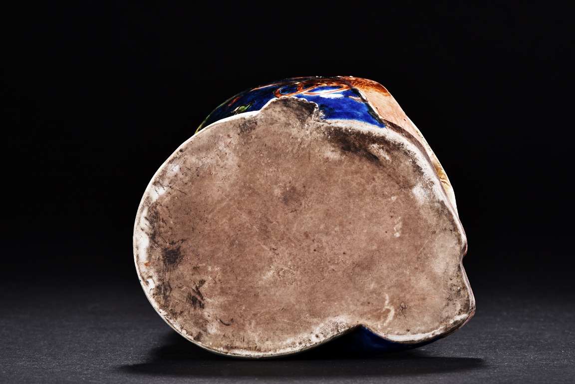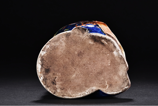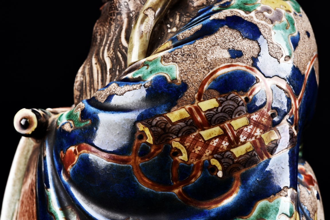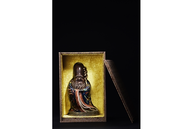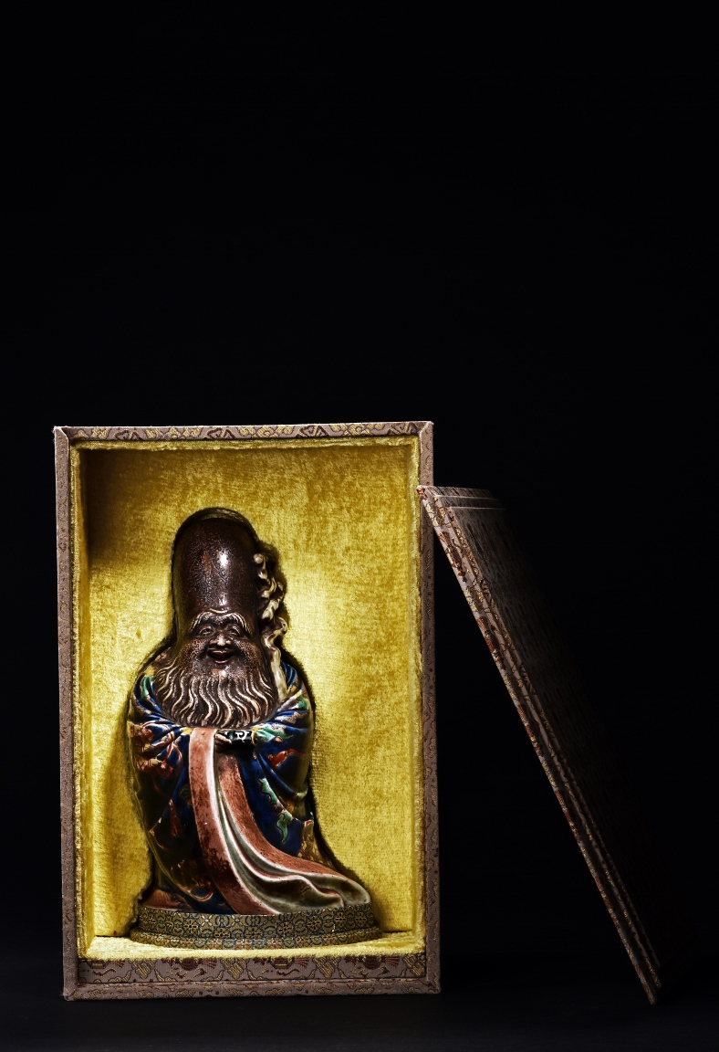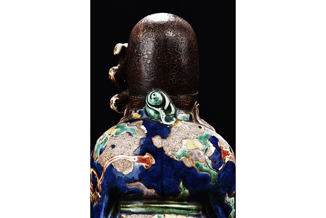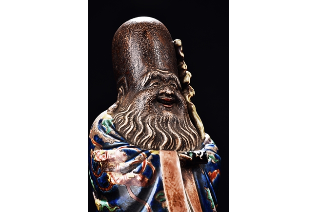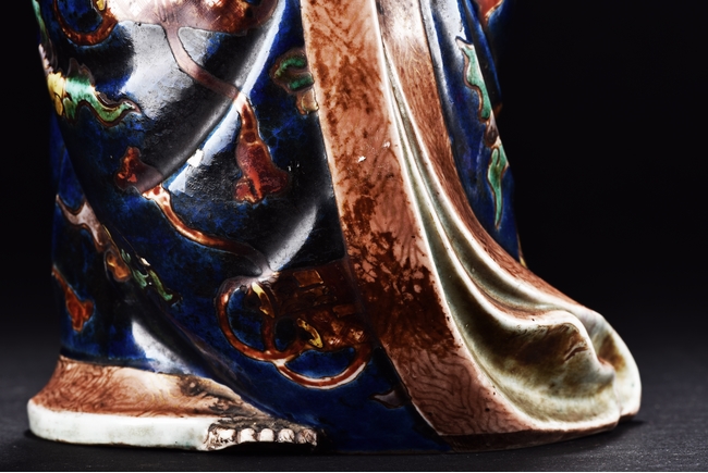 The immortal is modelled wearing a long and loose robe, enamelled with scroll motif and auspicious clouds in blue, green, yellow and red glaze. With a high and domed forehead, his face is shown with a joyful and benevolent expression, the beard detailed with incised lines. Qing Dynasty period.