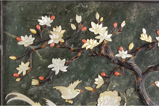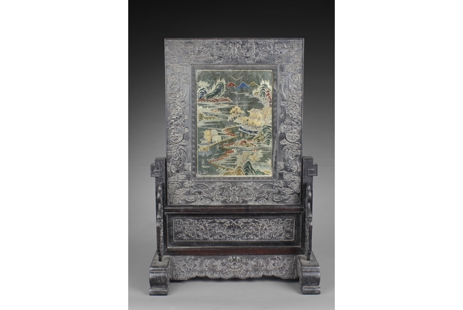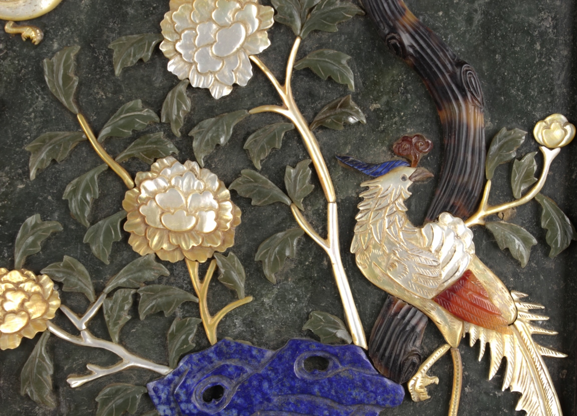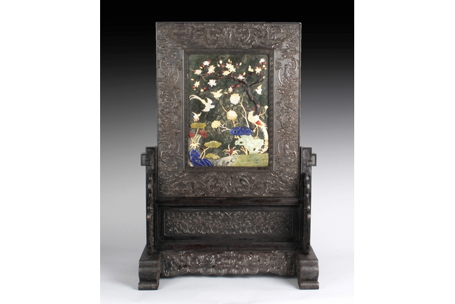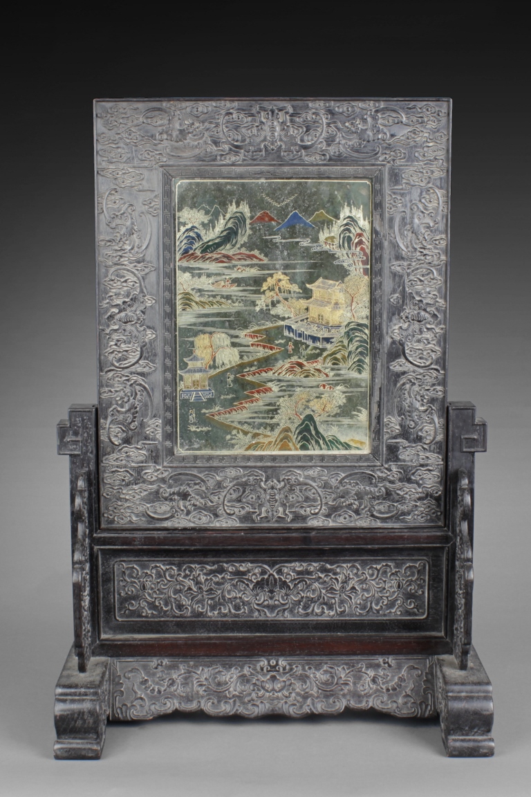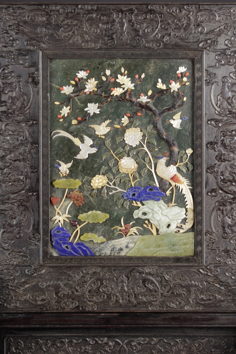 Of rectangular form, the ornamented jade screen depicts a flowers and birds scene, portraying birds of all types flying and gathering next to flower trees with spinach jade ground in lapis lazuli, celadon jade, mother-of-pearl, coral, etc.The other side portraying a riverside landscape with gilt-paint, the Zitan wood frame delicately carved with key-fret and bats flying amidst cloud patterns, all set on a sturdy wooden stand, carved with flower patterns. 19th century.