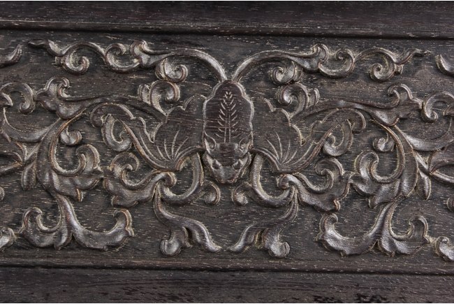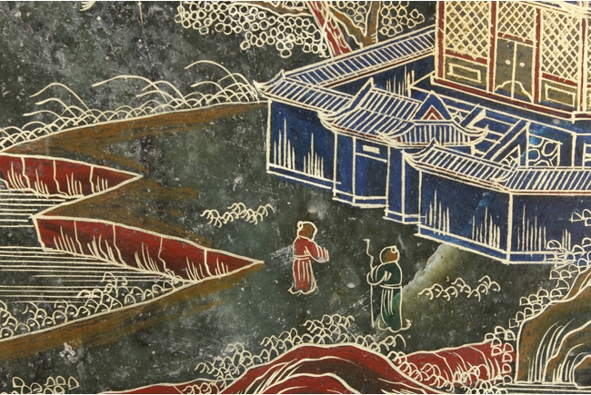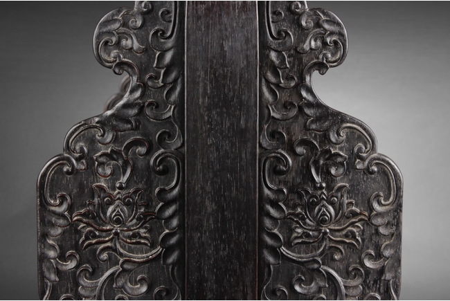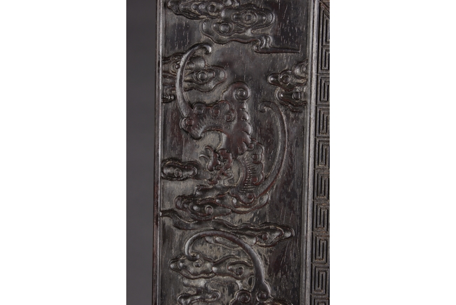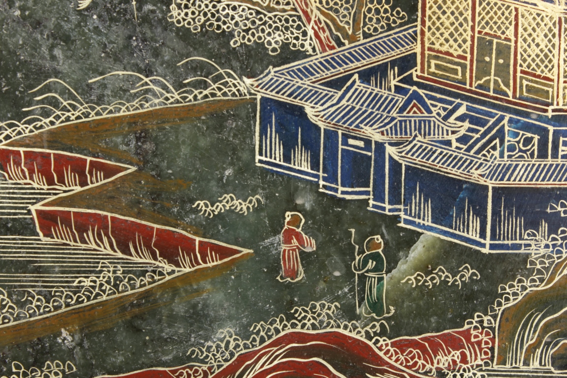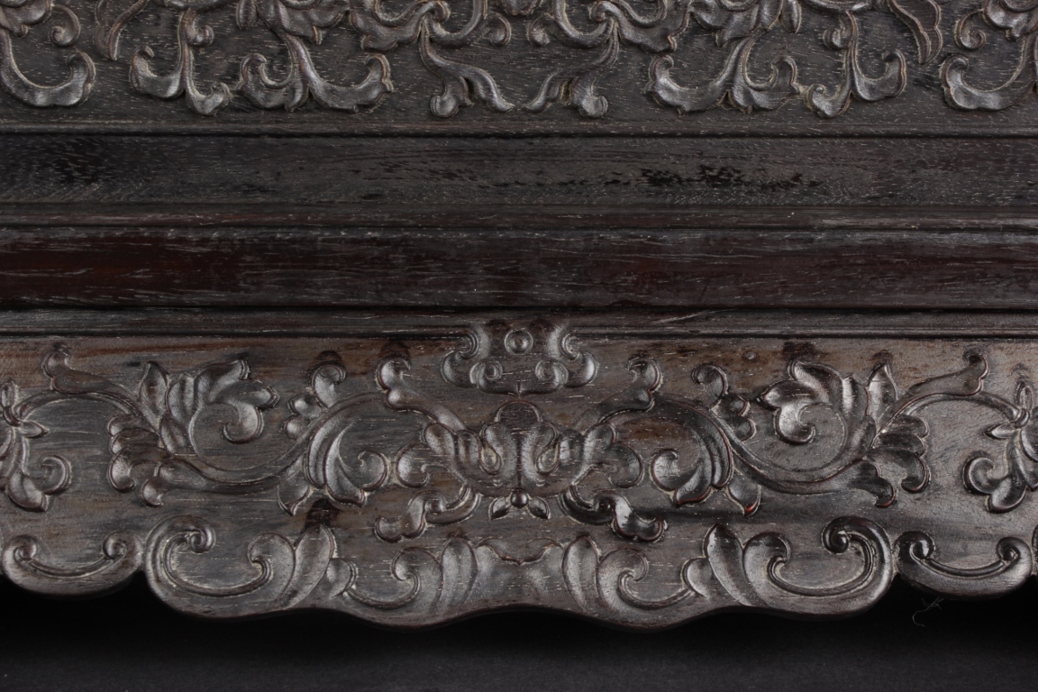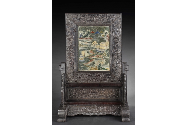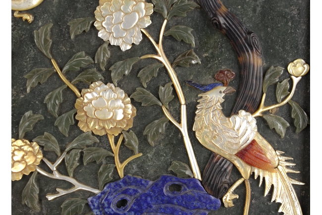 Of rectangular form, the ornamented jade screen depicts a flowers and birds scene, portraying birds of all types flying and gathering next to flower trees with spinach jade ground in lapis lazuli, celadon jade, mother-of-pearl, coral, etc.The other side portraying a riverside landscape with gilt-paint, the Zitan wood frame delicately carved with key-fret and bats flying amidst cloud patterns, all set on a sturdy wooden stand, carved with flower patterns. 19th century.