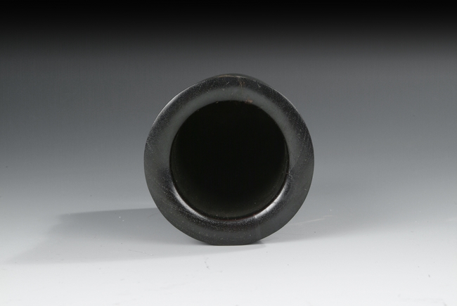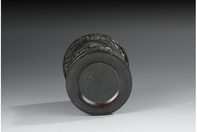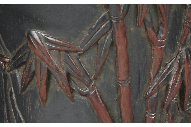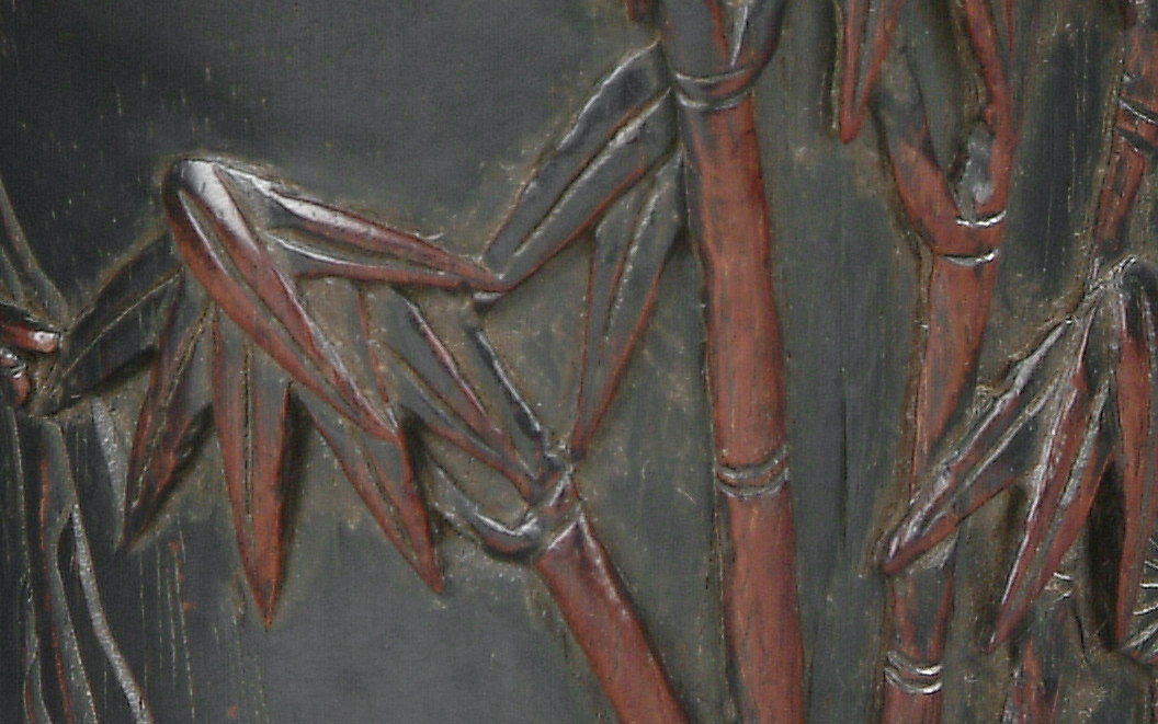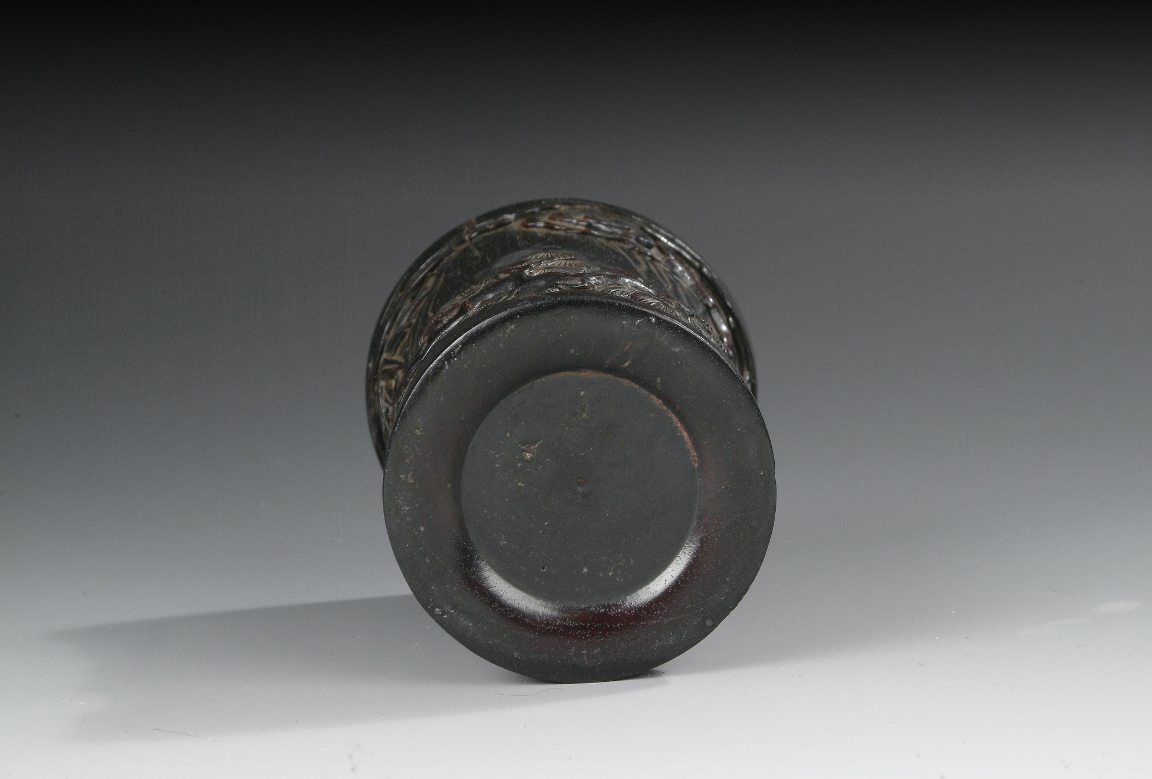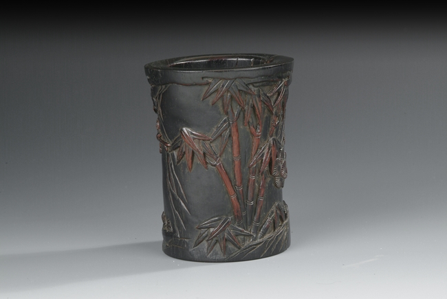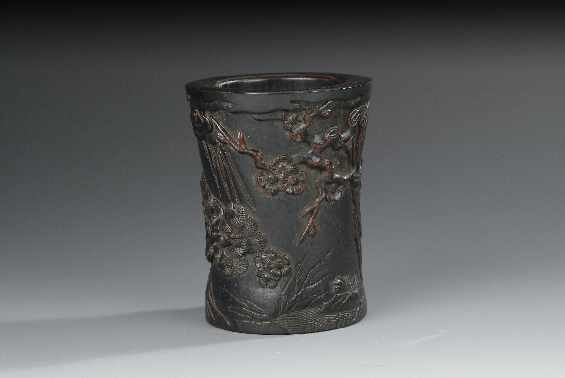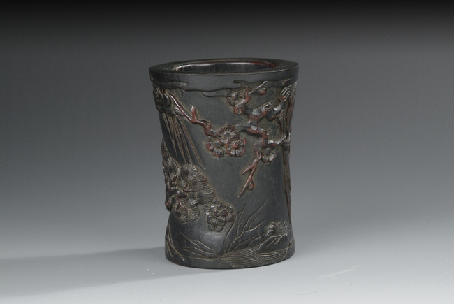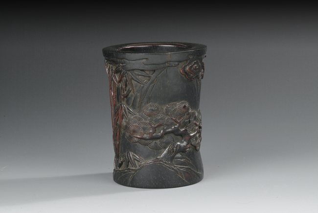 Of tapering cylindrical form, finely carved in relief of bamboo, pine trees, and plum flower trees, with deep color and rich grains. Qing Dynasty period.