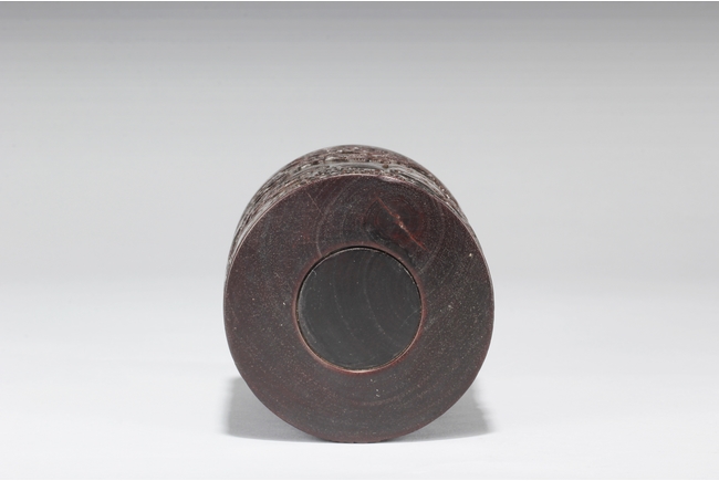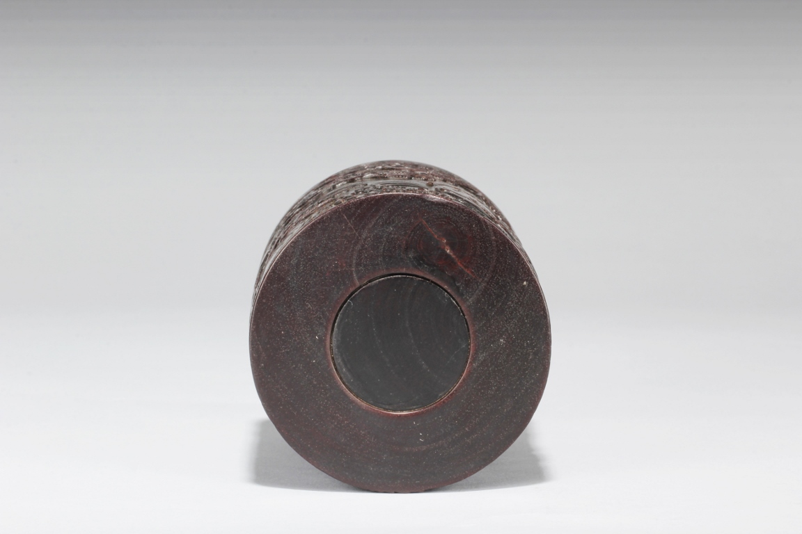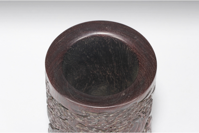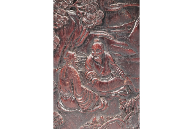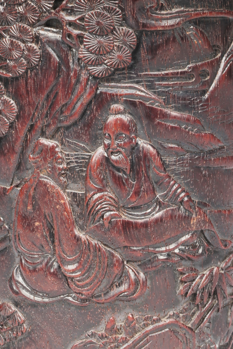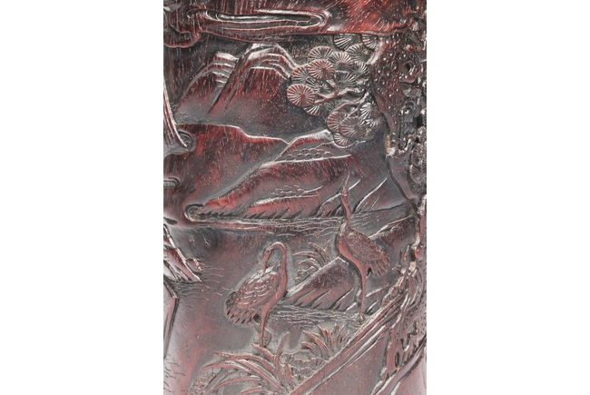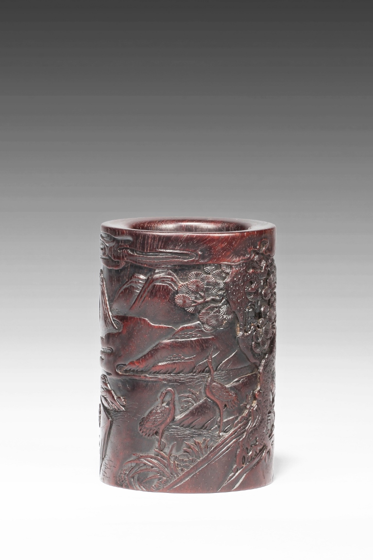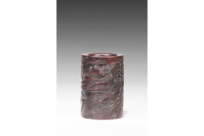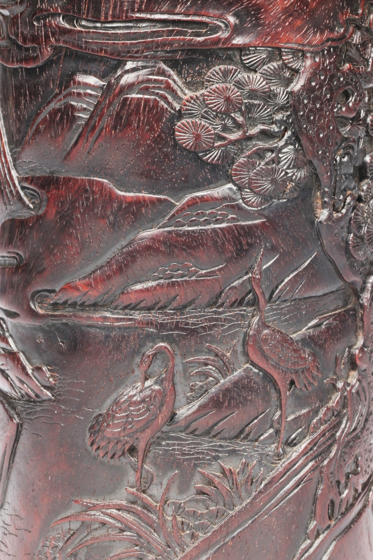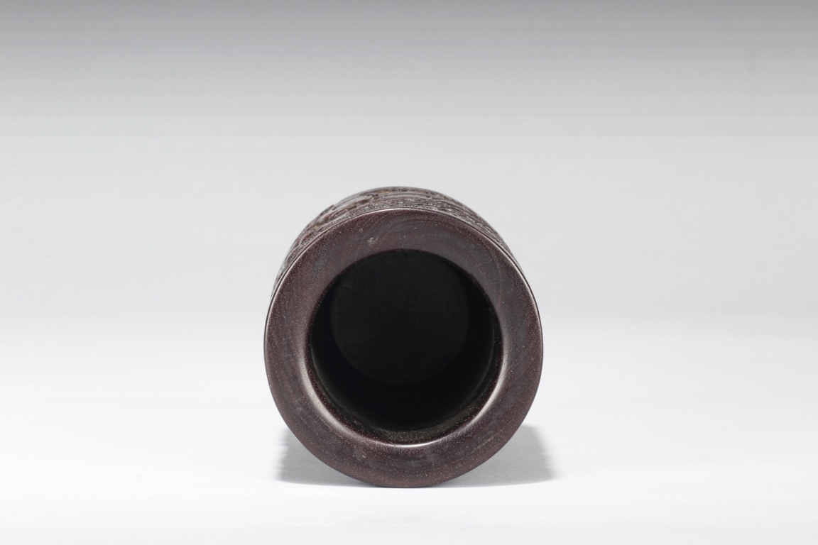 Of cylindrical form, the brush pot low relief carved with two seated elders conversing in forest setting, and two craness tanding in river bank, with pine trees, mountains, and rockworks in the backdrop. The Zitan wood brush pot with natural color, grains, and texture, and comes with en-suite plug on the bottom. Republic period.