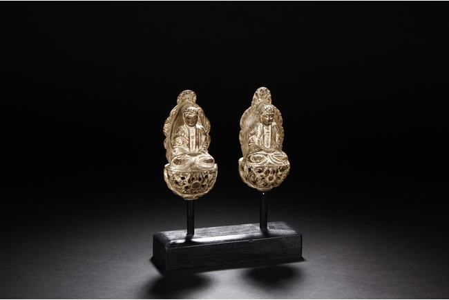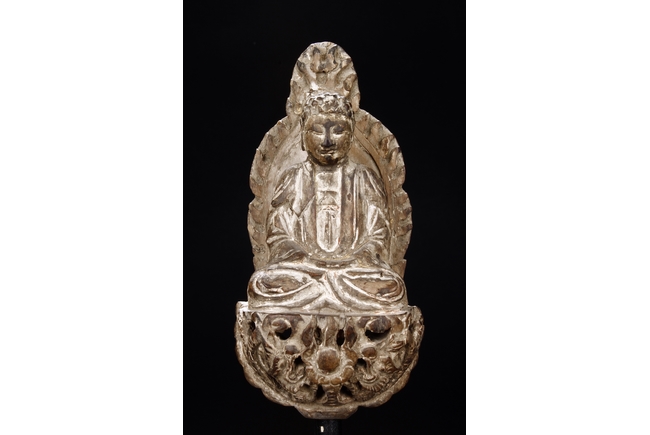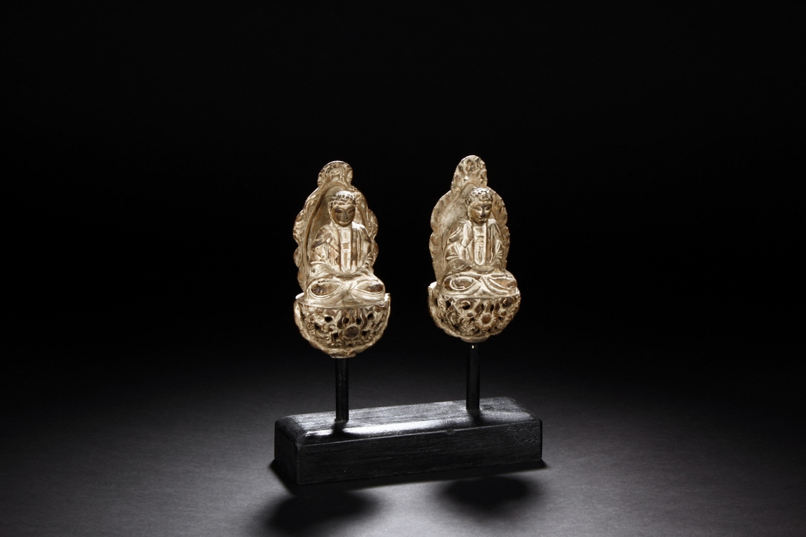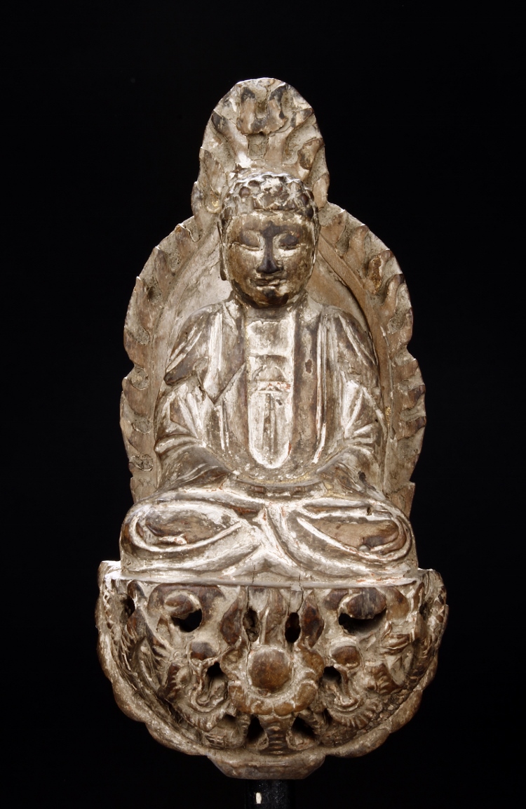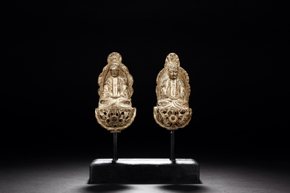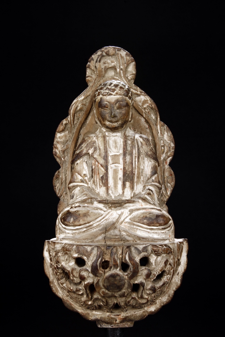 Each figure is carved seated on a throne with two hands resting, wearing loose robe, the face with serene expression and backed by a mandorla, set on a pole. Qing Dynasty Period.