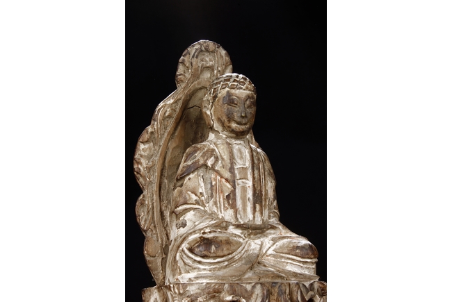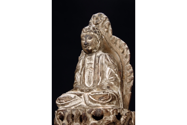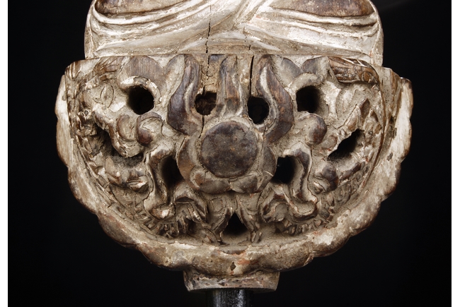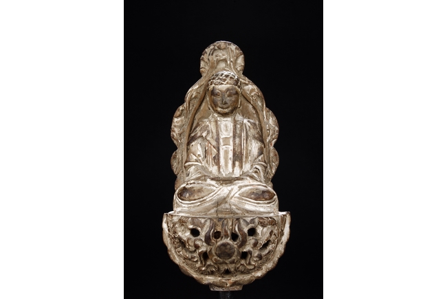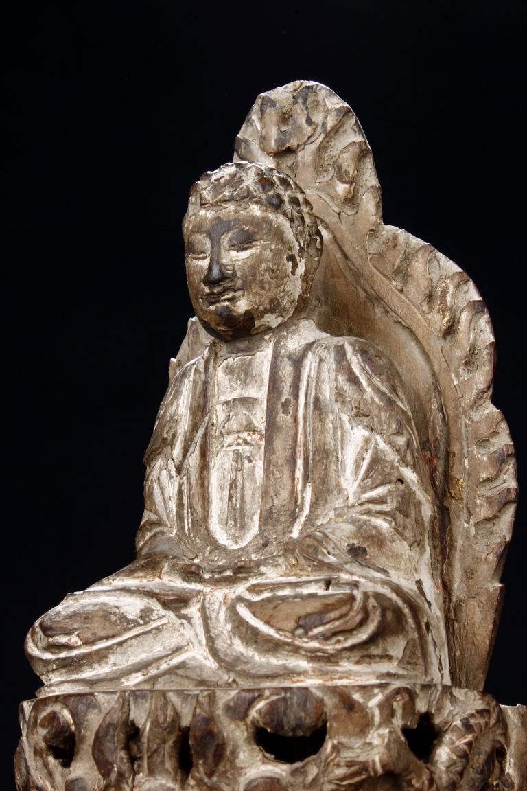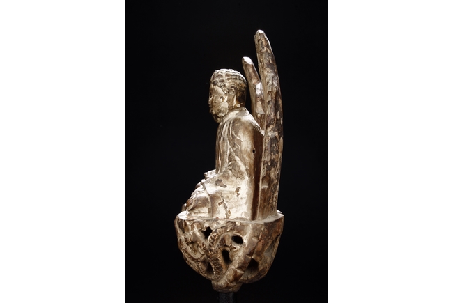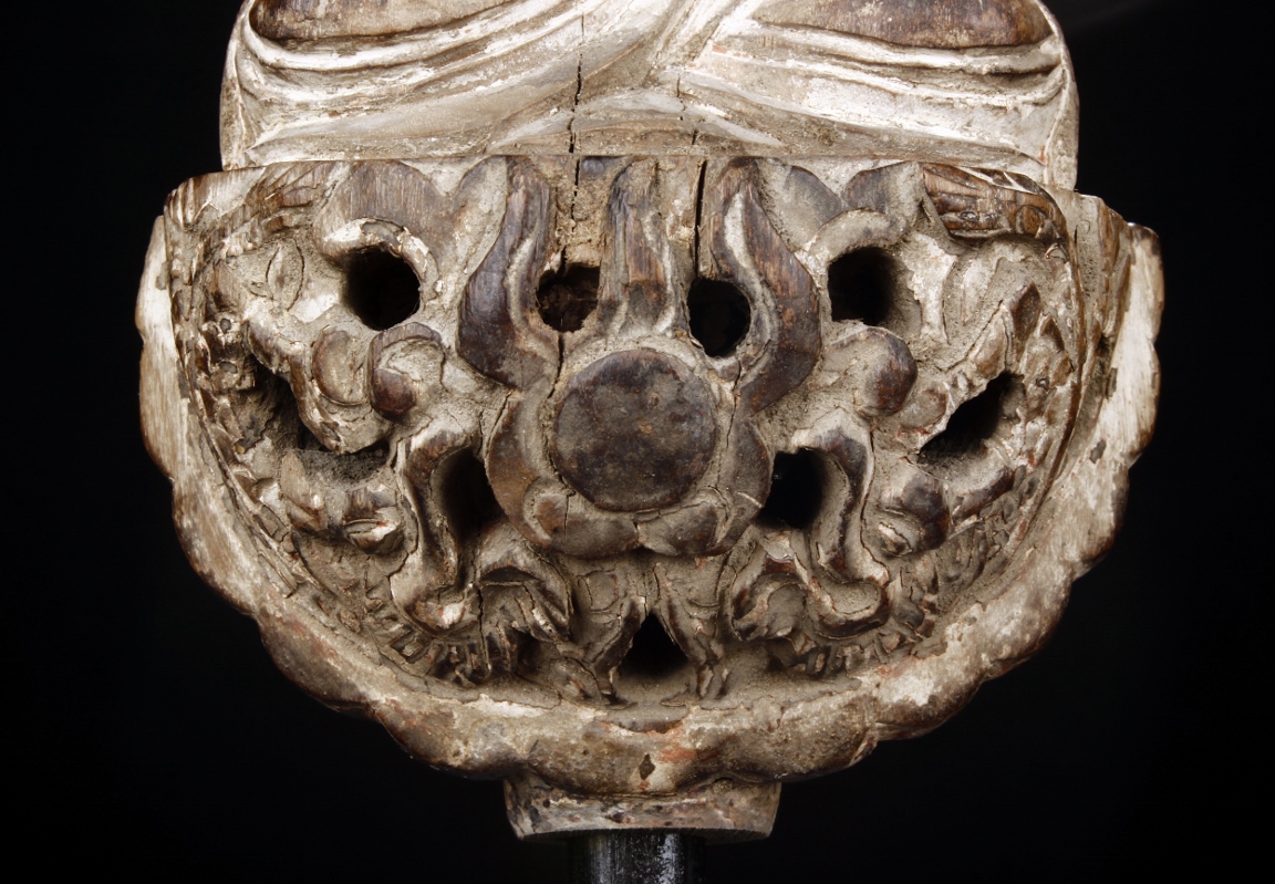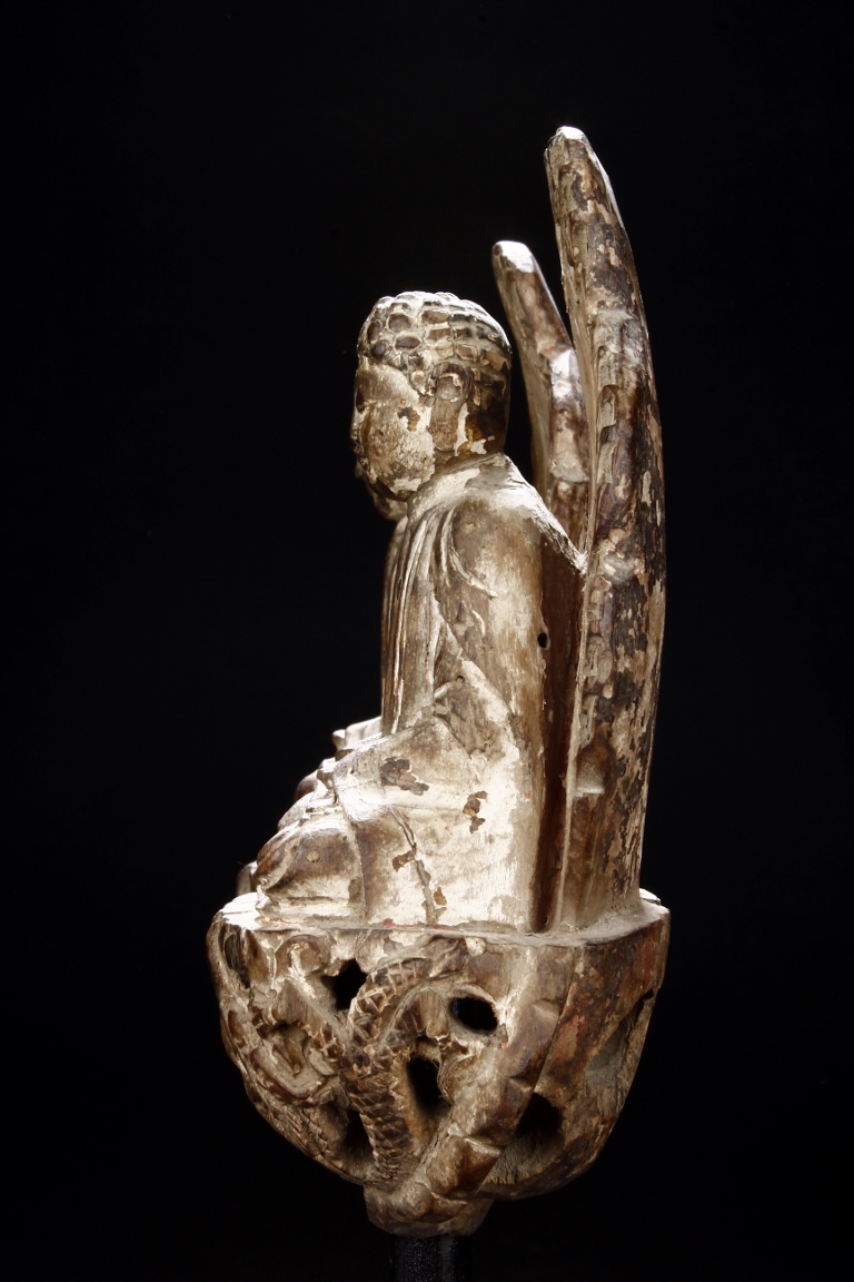 Each figure is carved seated on a throne with two hands resting, wearing loose robe, the face with serene expression and backed by a mandorla, set on a pole. Qing Dynasty Period.
