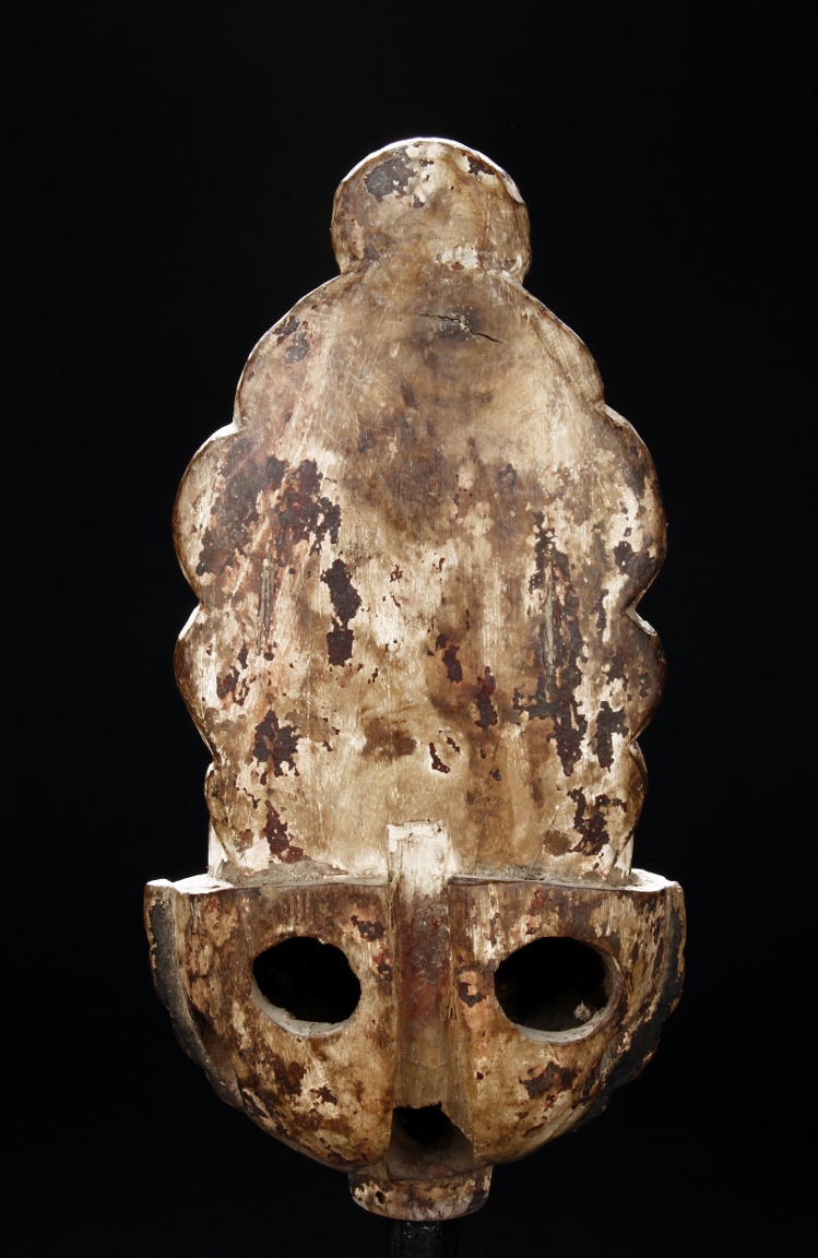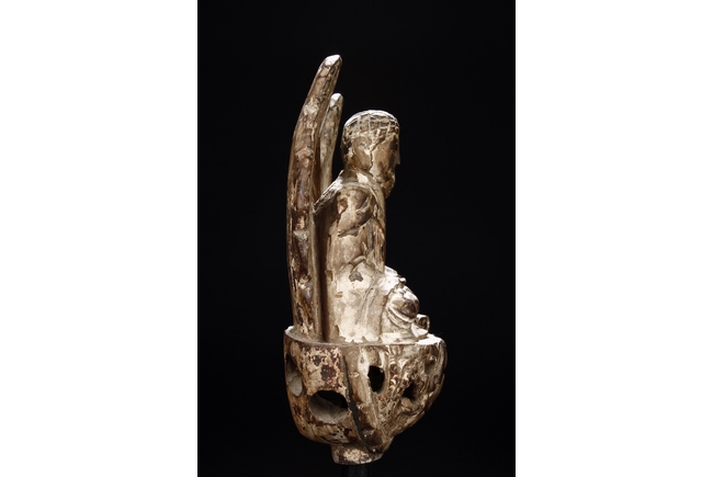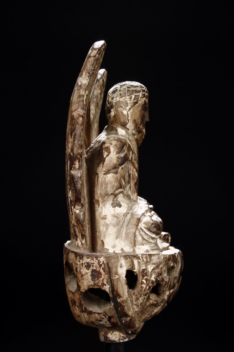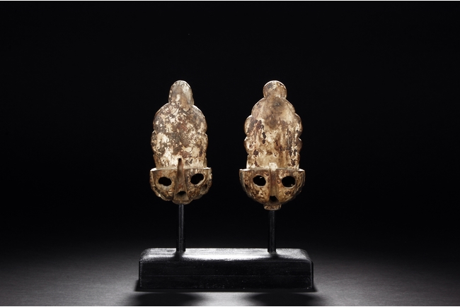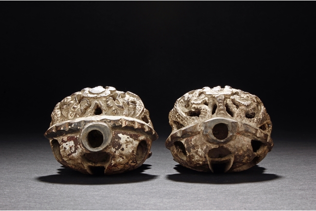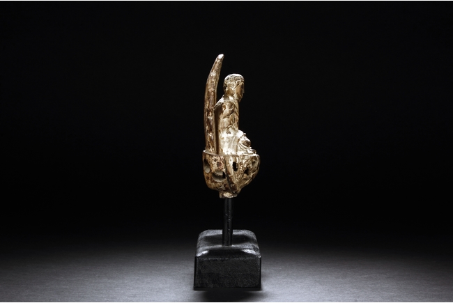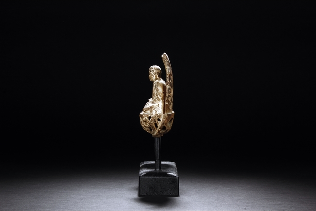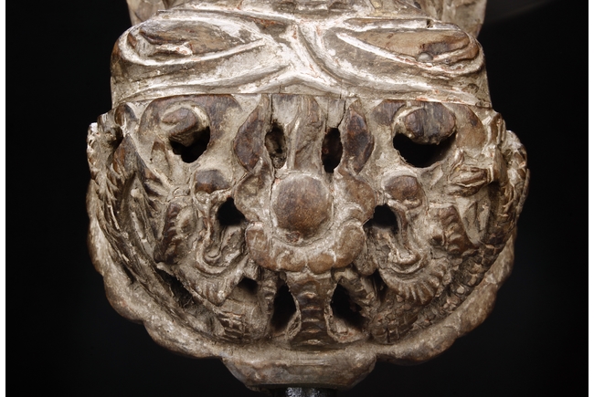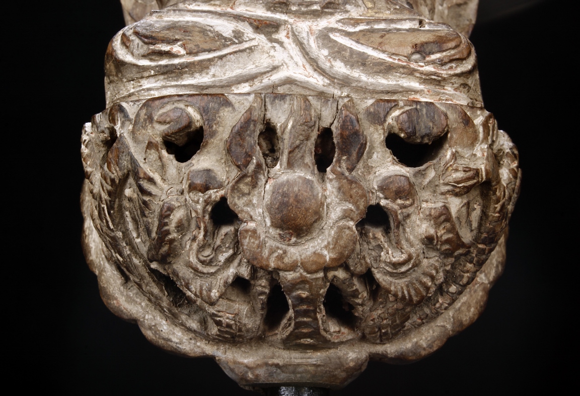 Each figure is carved seated on a throne with two hands resting, wearing loose robe, the face with serene expression and backed by a mandorla, set on a pole. Qing Dynasty Period.
