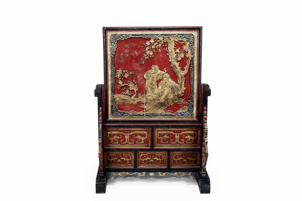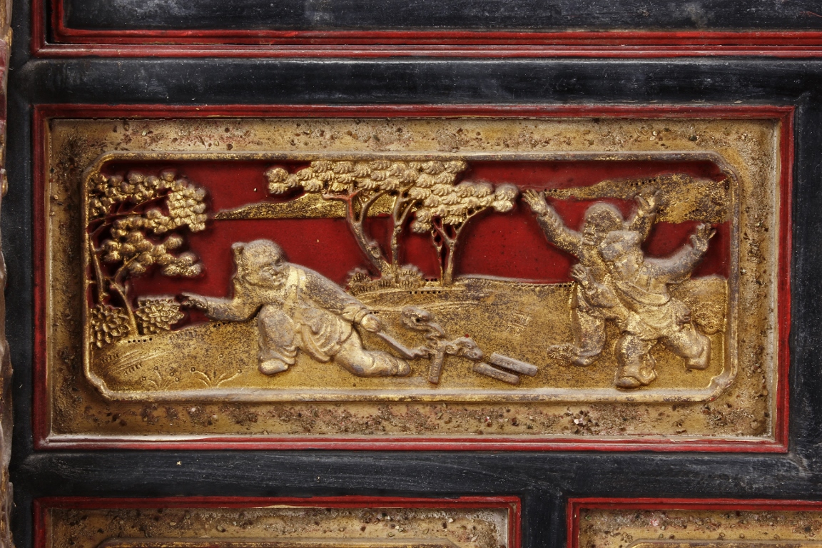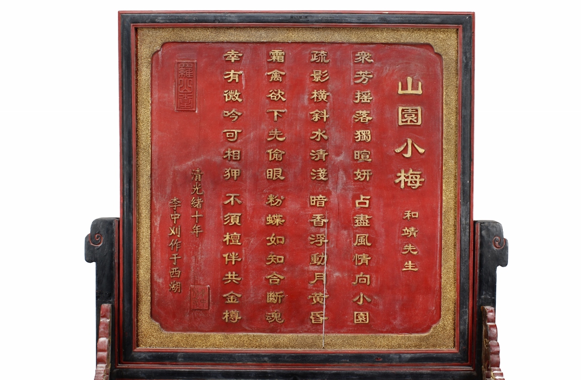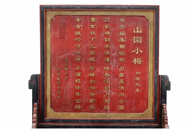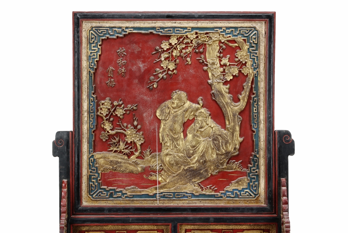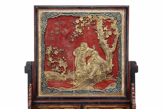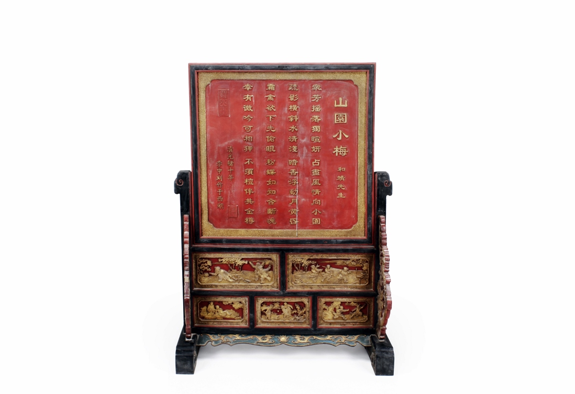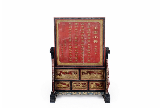 The wooden panel is painted in red ground with golden characters, bearing poem and figures on either side. The stand is divided into six rectangular sections with each carved with figures from storie reserved on red ground. Late Qing Dynasty Period.