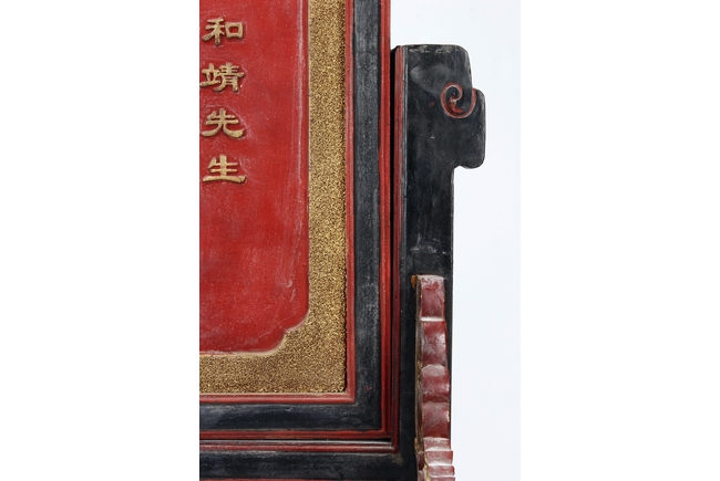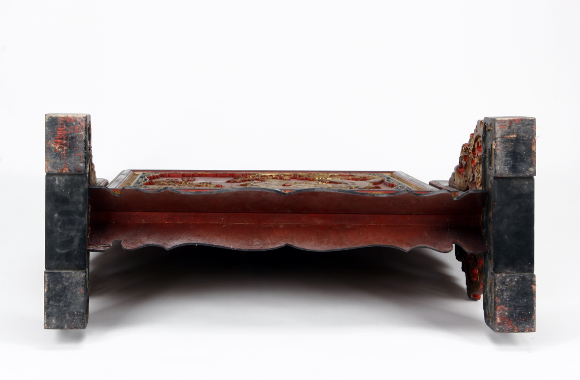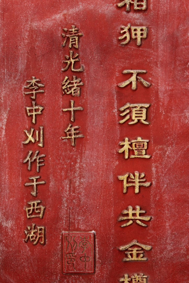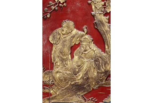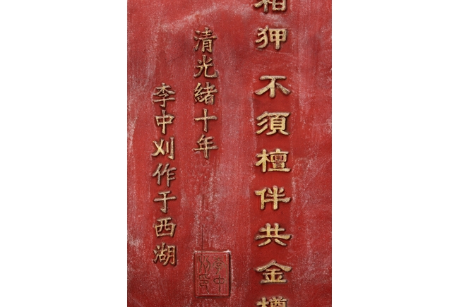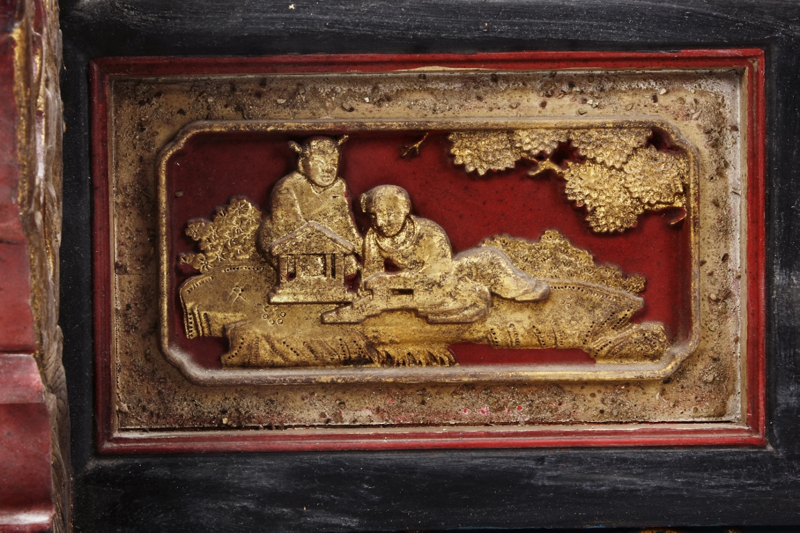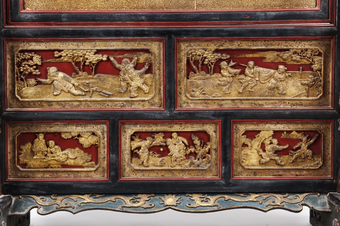 The wooden panel is painted in red ground with golden characters, bearing poem and figures on either side. The stand is divided into six rectangular sections with each carved with figures from storie reserved on red ground. Late Qing Dynasty Period.