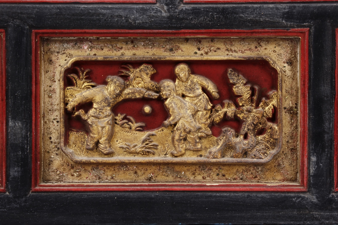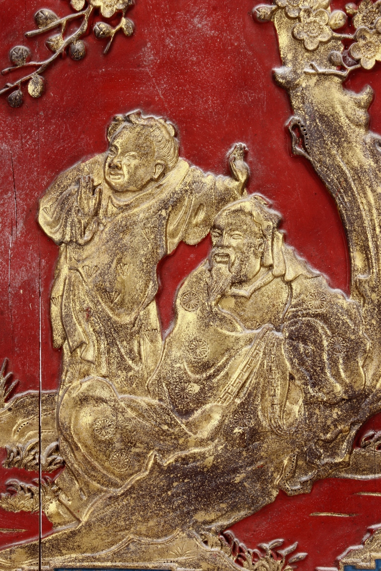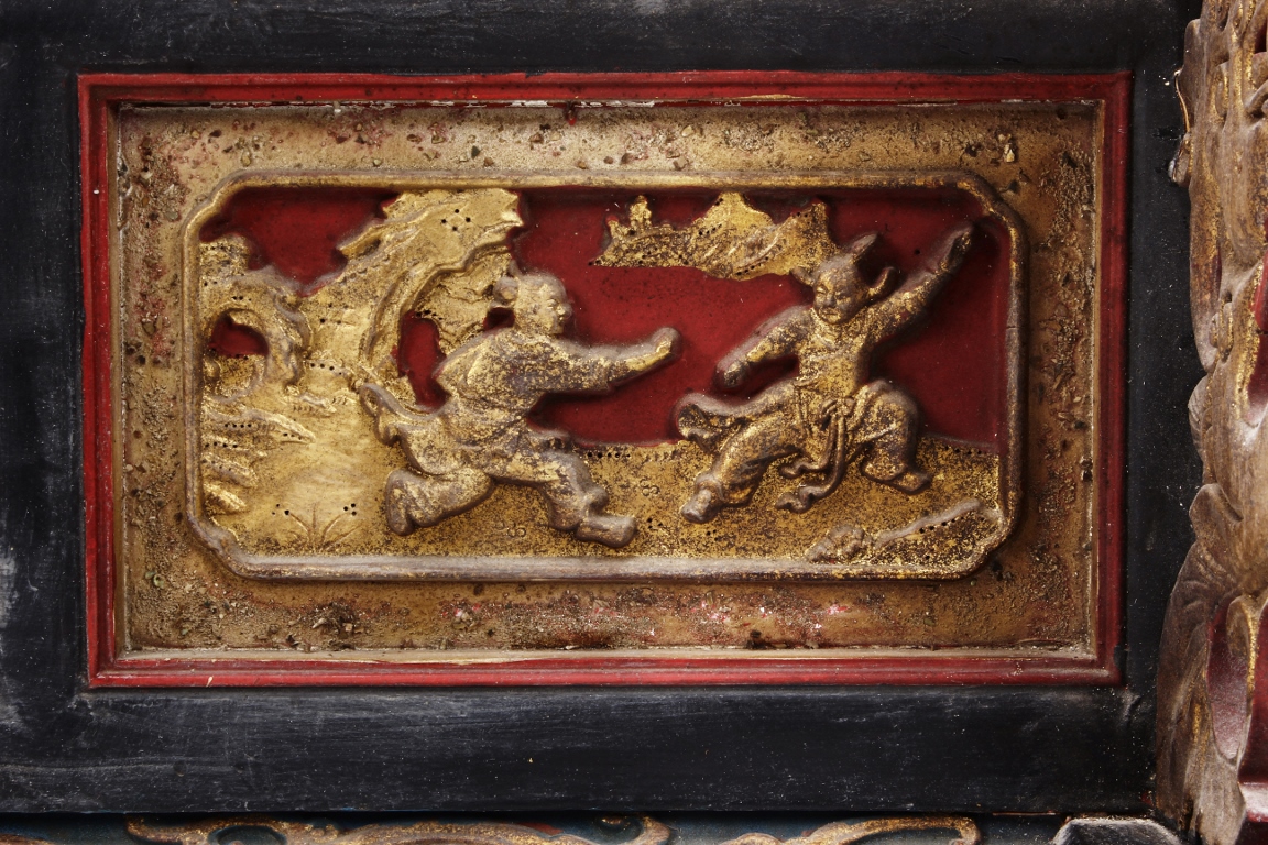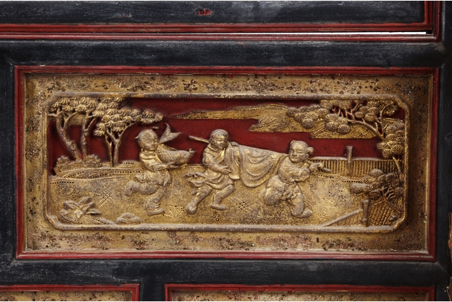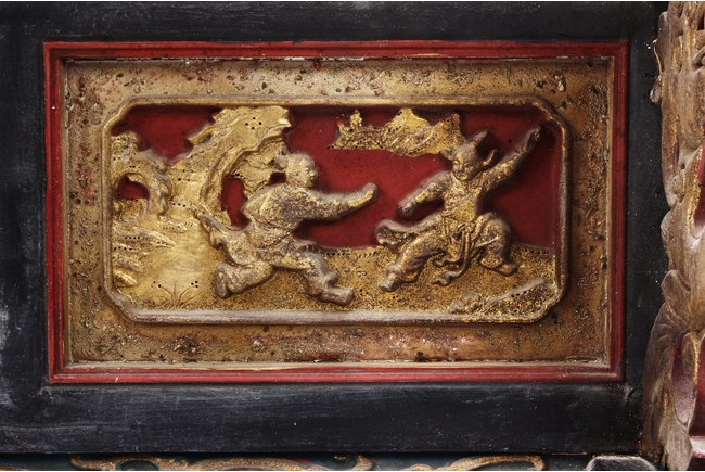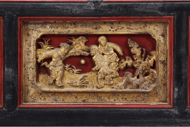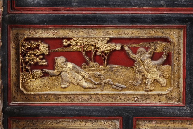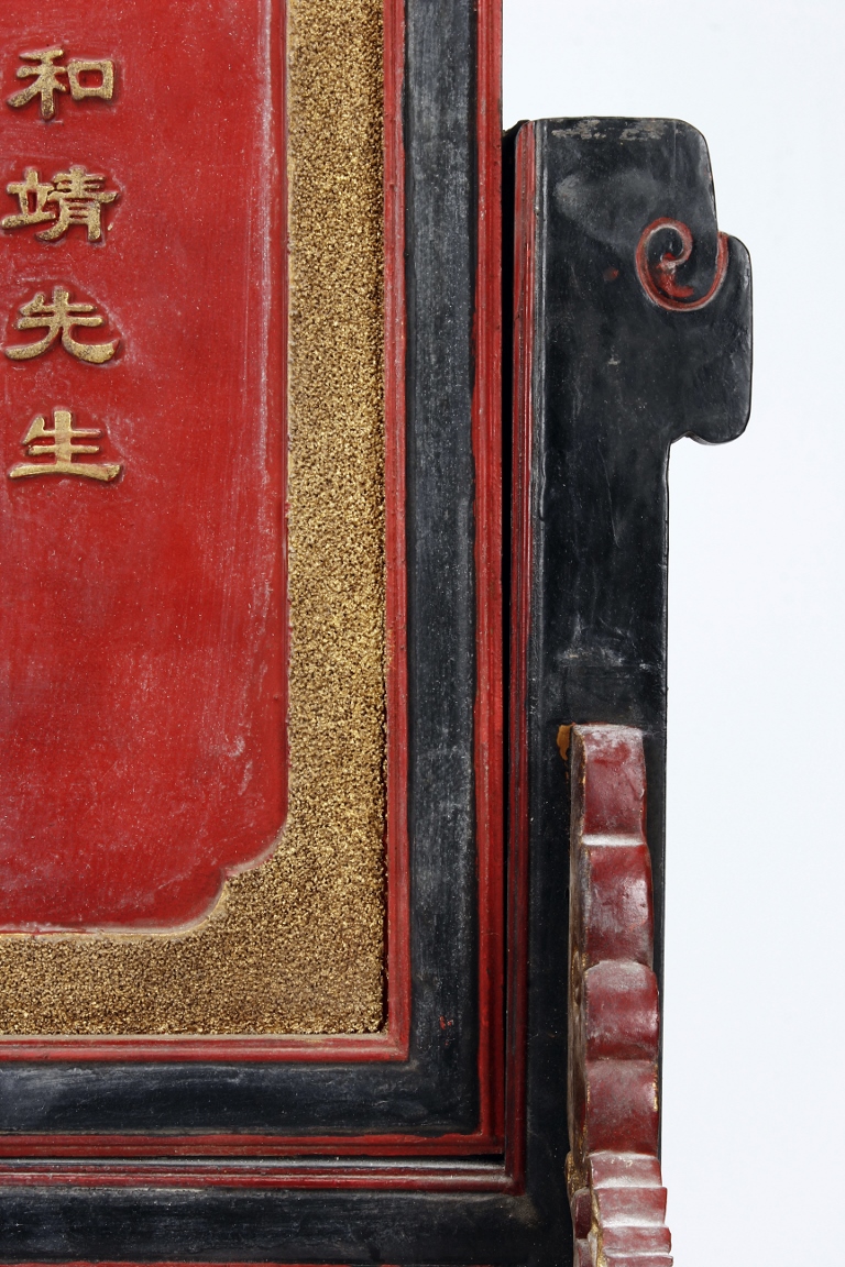 The wooden panel is painted in red ground with golden characters, bearing poem and figures on either side. The stand is divided into six rectangular sections with each carved with figures from storie reserved on red ground. Late Qing Dynasty Period.
