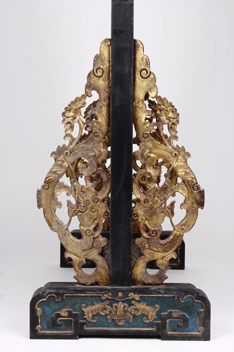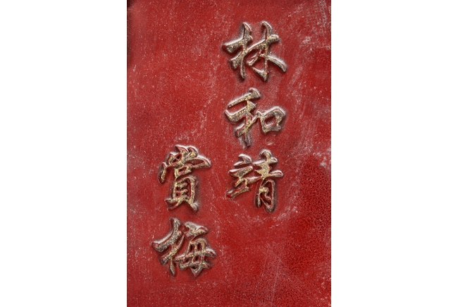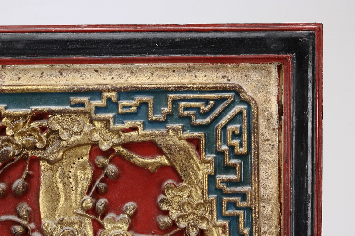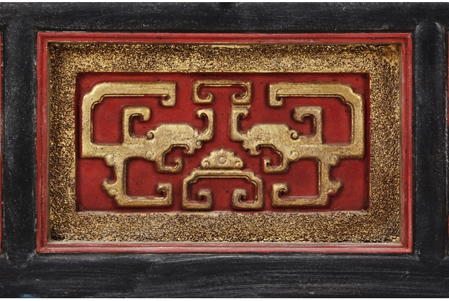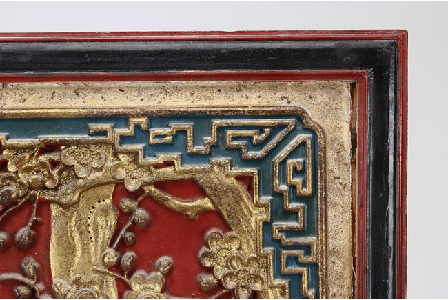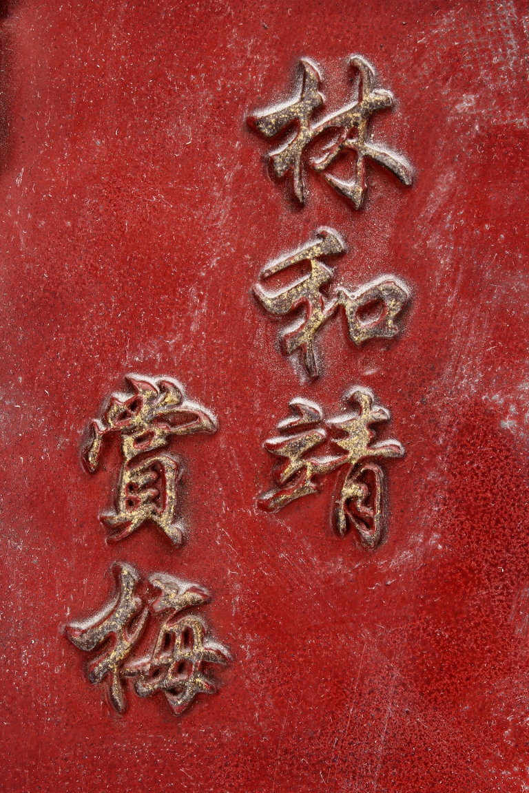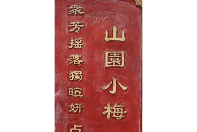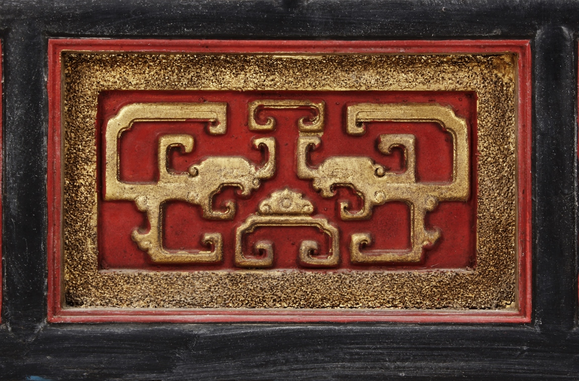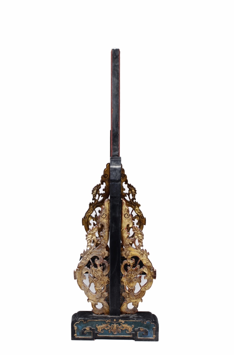 The wooden panel is painted in red ground with golden characters, bearing poem and figures on either side. The stand is divided into six rectangular sections with each carved with figures from storie reserved on red ground. Late Qing Dynasty Period.